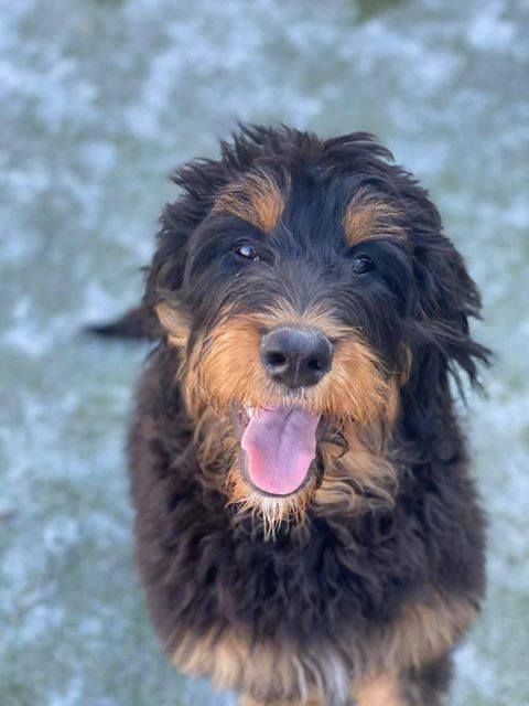 A relatively new cross, Bernedoodles are rapidly becoming a huge favorite in trending designer crosses. The striking markings of the Bernese Mountain dog play out beautifully with the wavy, curly hair of the poodle, giving it the "teddybear look" that is a deeply desired trait that we all adore . A real, live, shaggy teddy bear brings us right back to our childhood fantasies. The Bernese Mountain dog is especially fond of children, making for a characteristic that is quite pleasing for most families seeking a family pet. They are loyal, gentle, easy going and always appear to be smiling, not just in their smile, but also in their eyes. They have the classic "big, puppy, dog eyes." The poodle adds intelligence, gorgeous wave and the much desired low-shed coat, making for a wonderful, indoor family pet. They offer uniqueness in coat, with their tricolored markings. With a burst of color with rust colored highlights, Bernedoodles are a sure eye-catcher wherever they go. Crossing these two breeds also increases the life span of the Bernese dog, as they create a healthier pup with hybrid vigor.