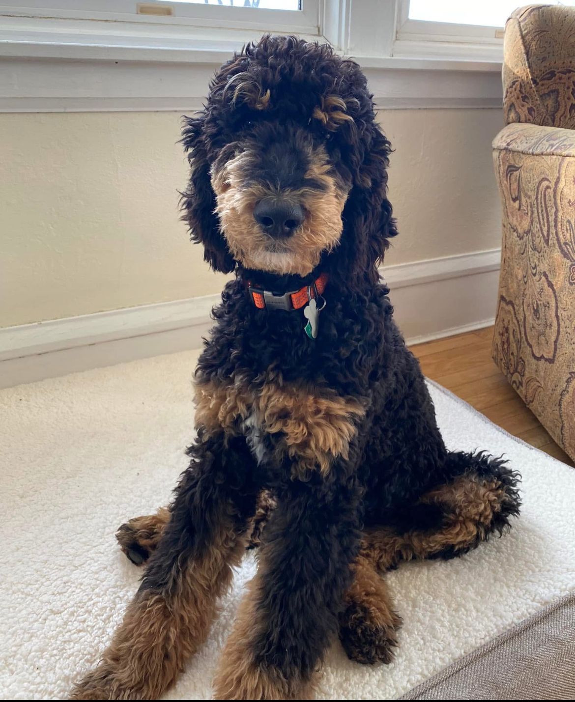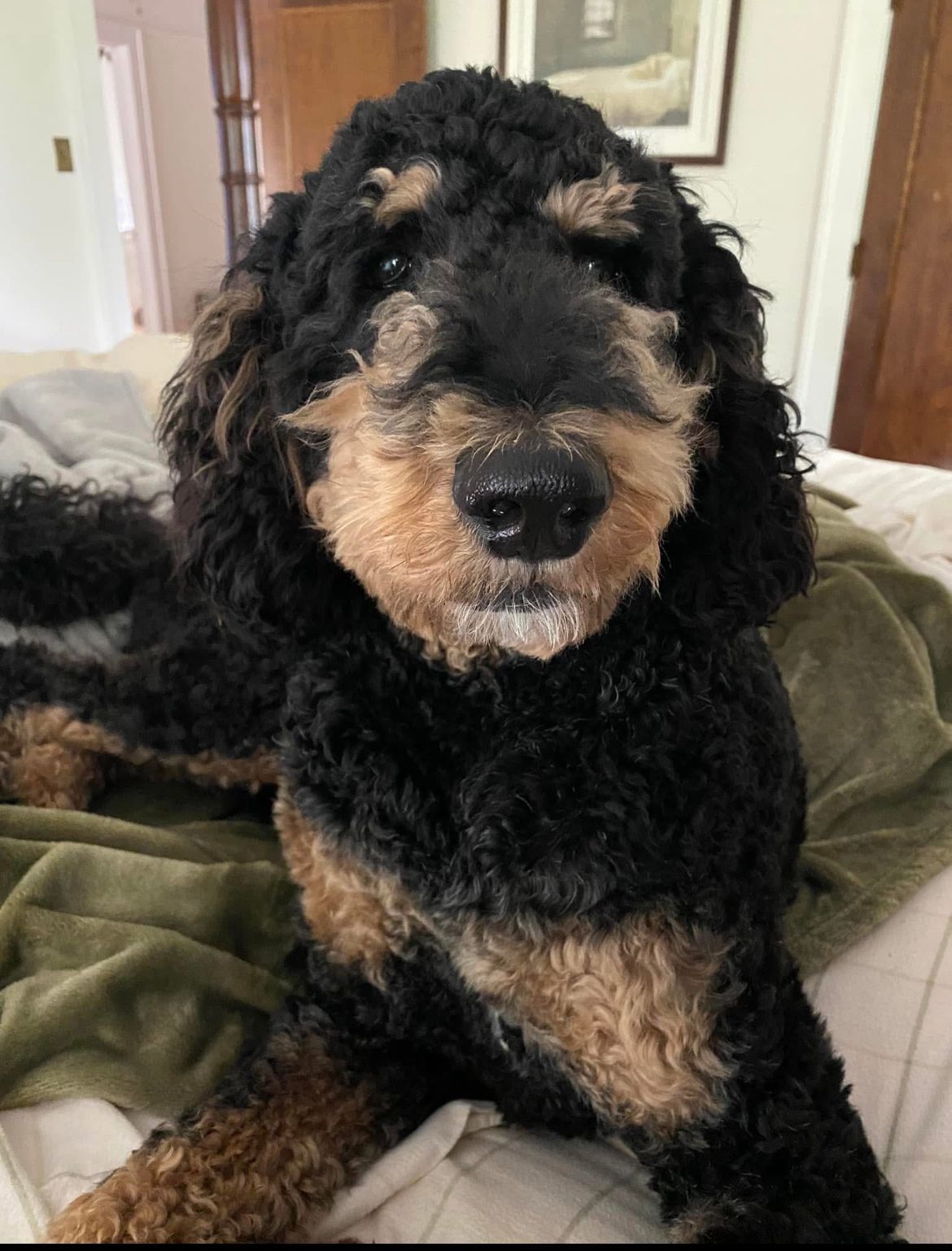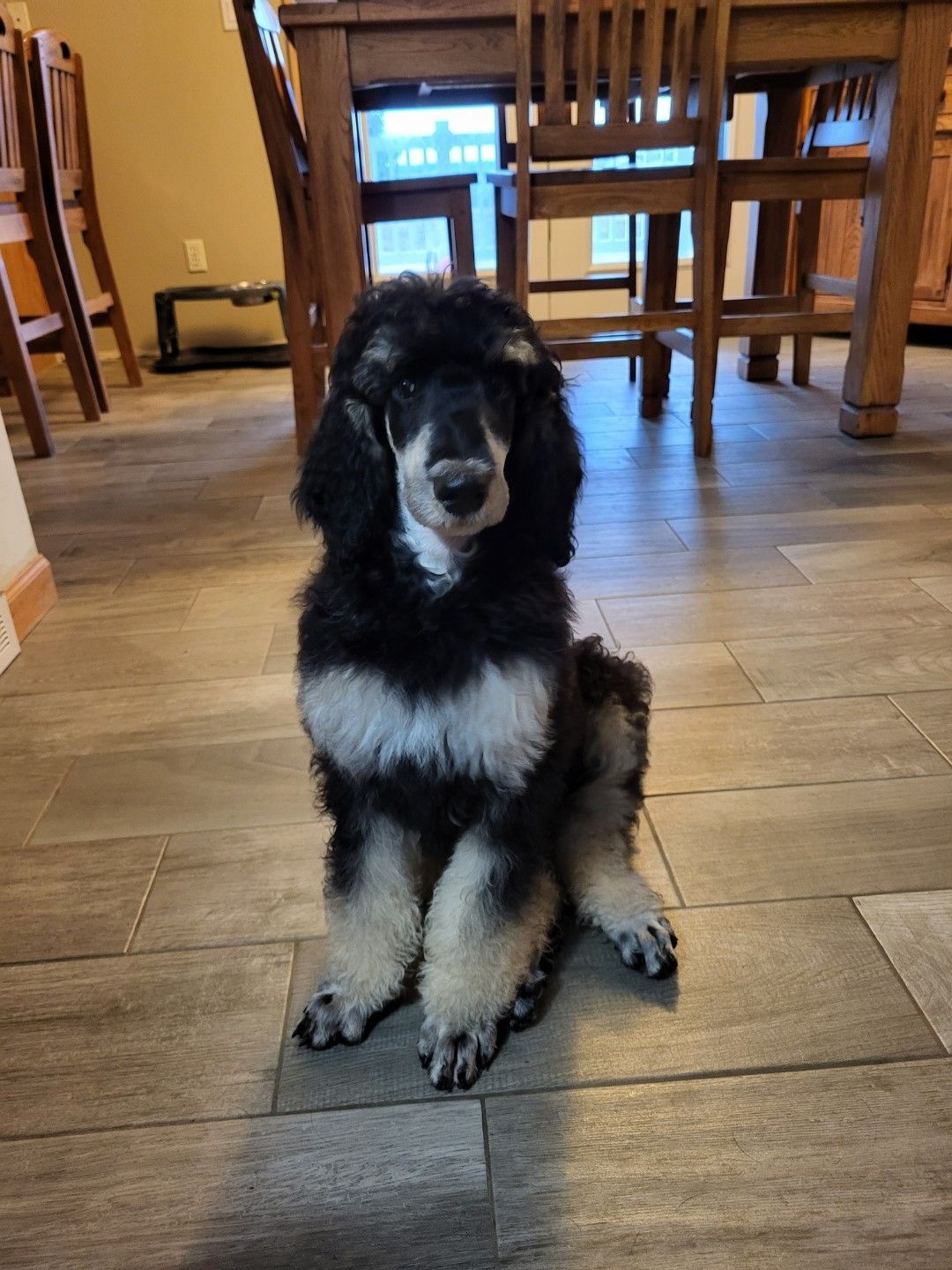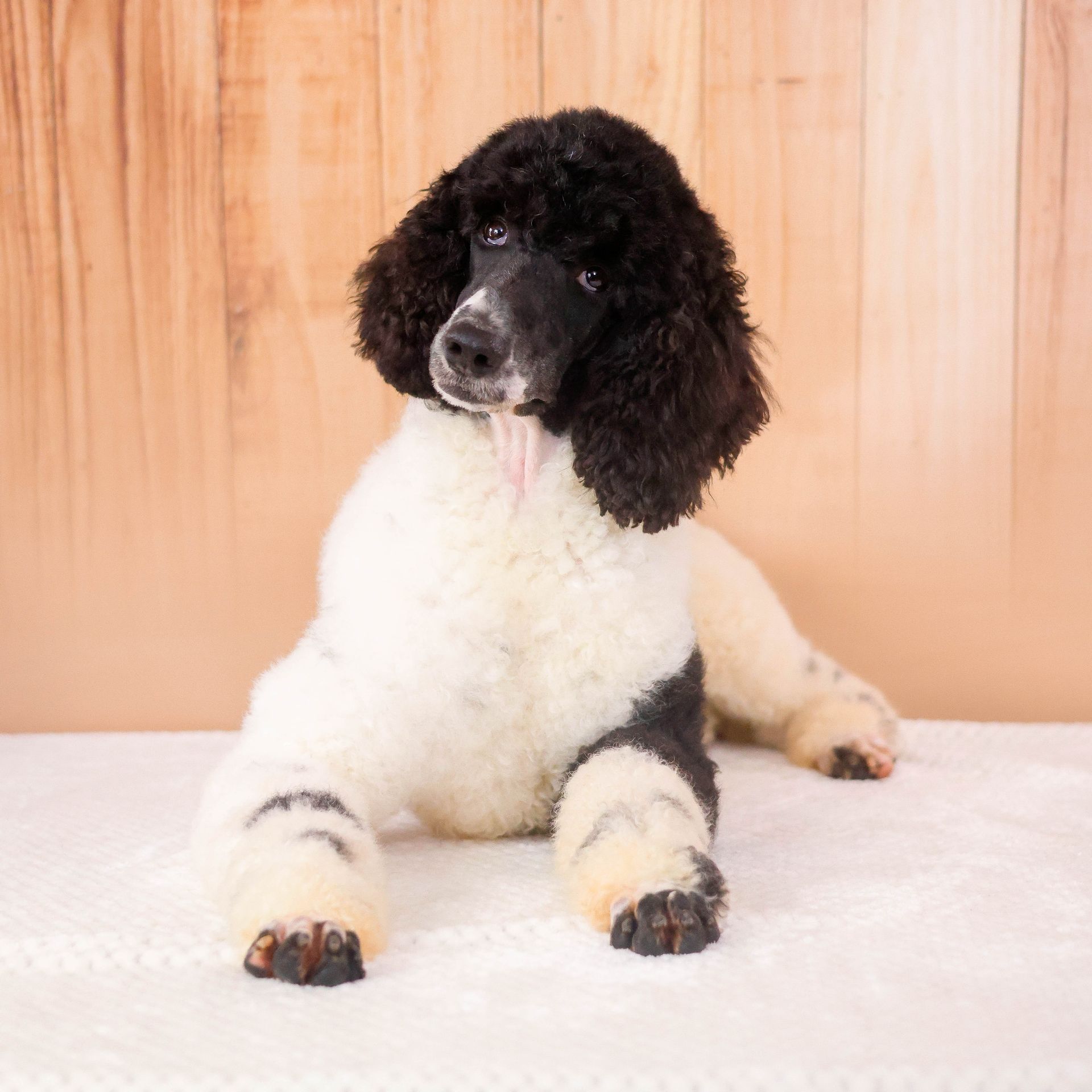 Legend is truly a natural and has an air of dignity to him. We believe this boy would do well in a large family, as he would be ready for hikes, swimming, fetch, and of course, cuddles. We have noticed Legend is quite the charmer as well and likes to get your attention by putting his paw up. He has a full personality and will truly feel like another family member. Legend is a big snuggle bug with strong human attraction. He loves being pampered, held, and enjoys affection. Legend is loyal, bonding quickly with everyone he meets. Legend has lower energy and is content watching the world go by from the comfort of your arms. He seems to be more relaxed with a warm personality. If you are searching for a puppy to love you endlessly Legend may be one to consider. He is sound and sweet in nature, you can simply see the softness in his eyes. Legend is child safe and gentle. He’s a quick leaner and has a bubbly demeanor overall. Legend has a great start to potty training, socialization, and crate training. He features the most beautiful tri-parti coat with marbling of white and black. His round white snout, black button nose, and long floppy ears give him the cutest teddy bear expression. His coat is extra plush and velvety soft to the touch. Legend is non-shedding and hypoallergenic. His estimated maturity is around 60 pounds depending on lifestyle. He features an athletic and regal build. Handsome legend will come up to date on all vaccinations, microchipped, vet certification of health, preventively de-wormed, dew claws have already been removed, one year warranty, parents have been health tested, gift bag, and more. If your family would like to meet Legend please call us at 563-380-1136 or send us an email today. We would love to connect with you.