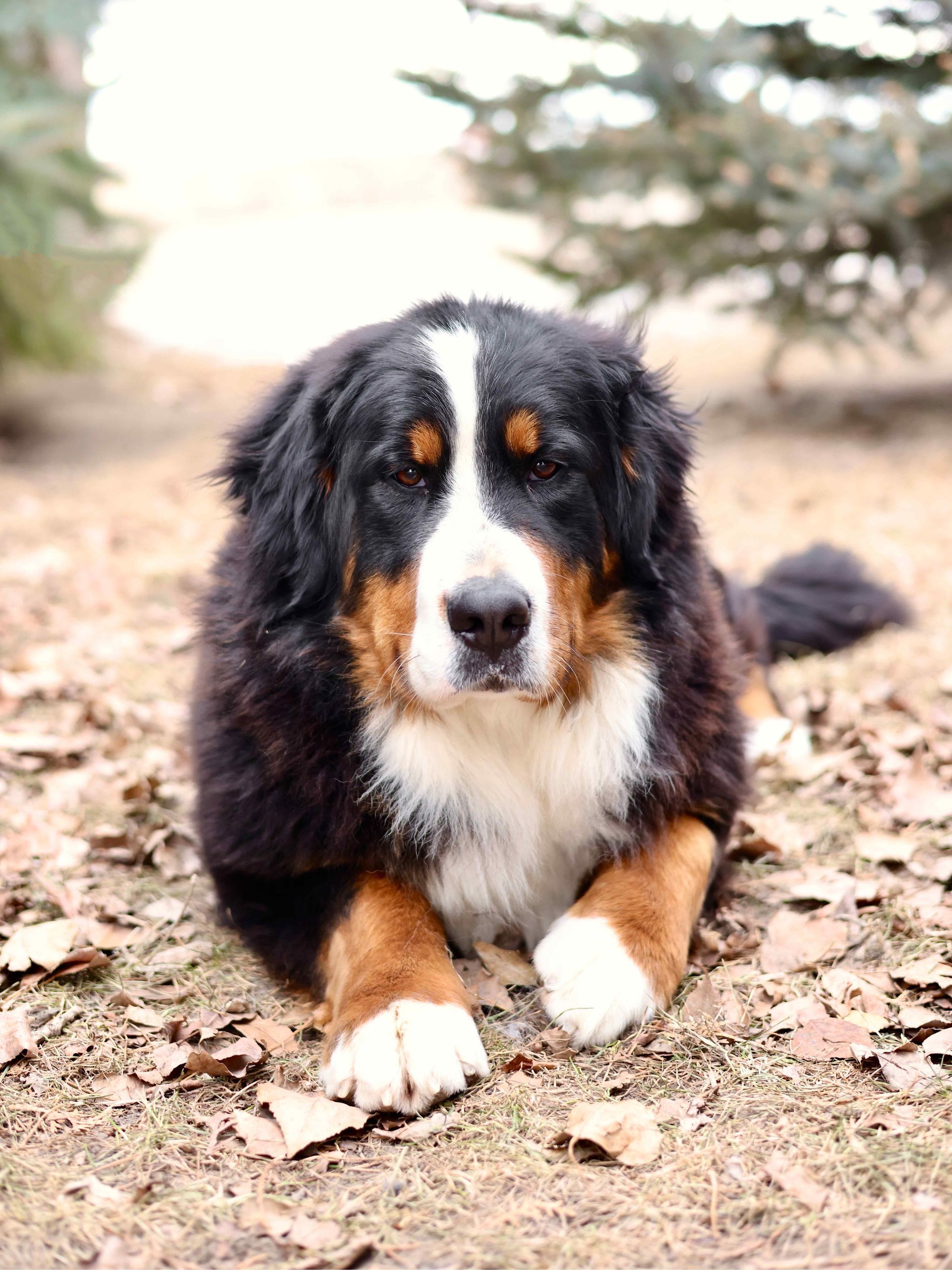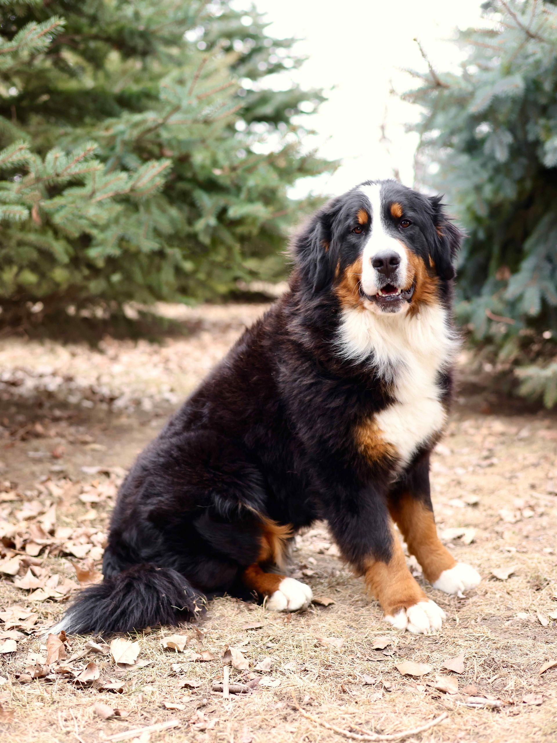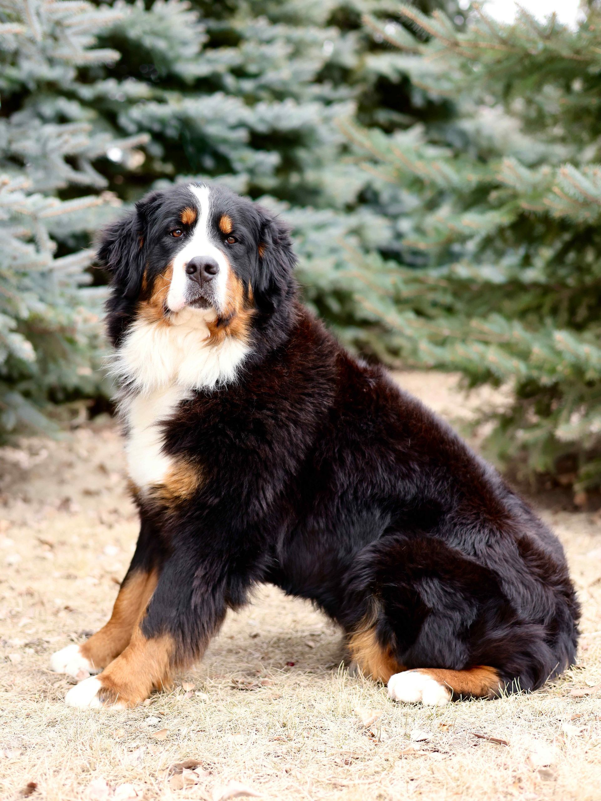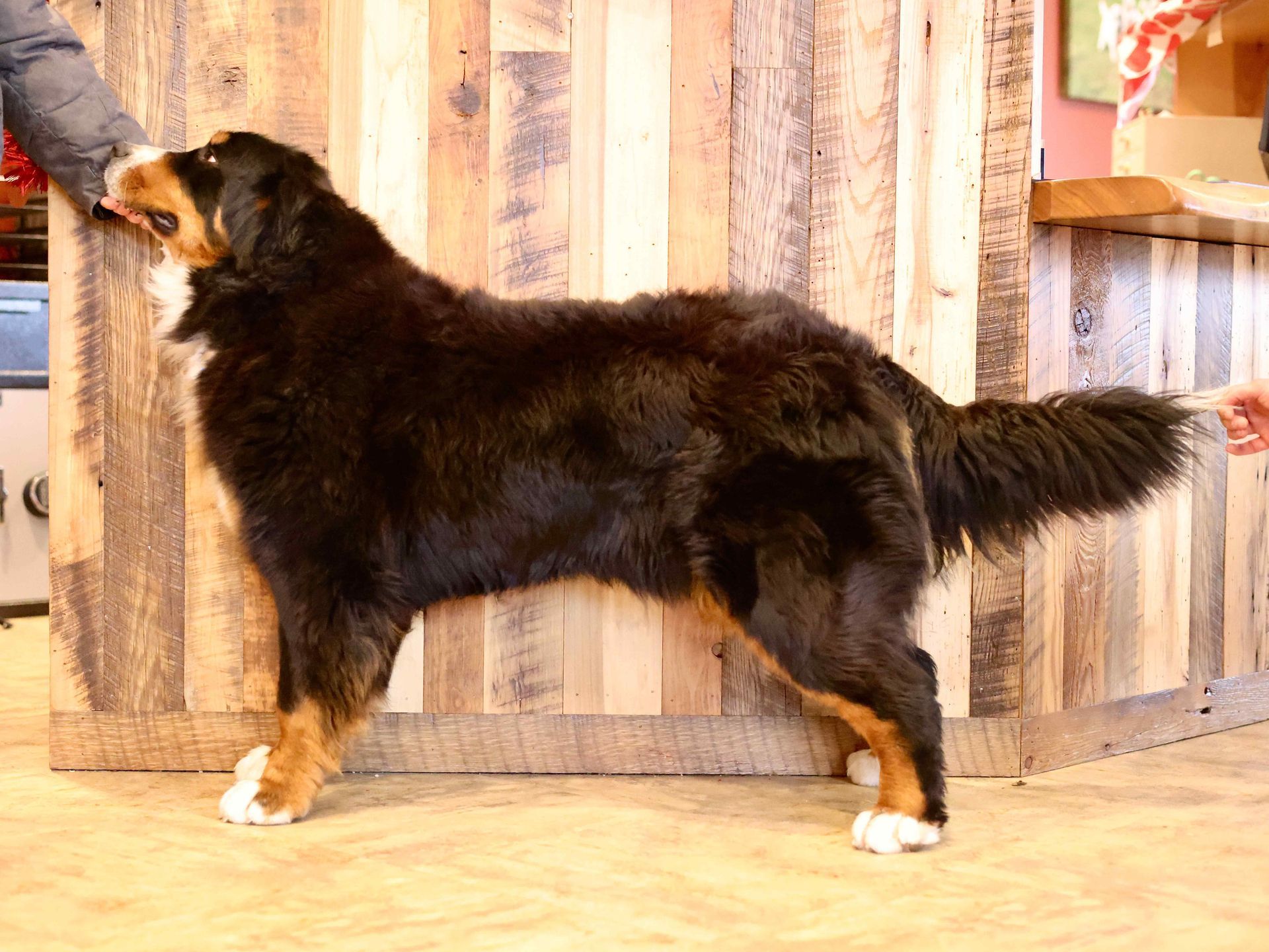 Aayla is simply a good-natured girl. She adores the company of everyone from dogs, people, especially children. Aayla can be best described as happy go lucky. She is lovable, goofy, and extra affectionate. Aayla is the perfect blend of social yet patient. She loves to be included in all actives from fetch, romping around, and walks through the forest. Aayla is charming and will melt your heart in seconds. She bonds naturally with all. Aayla has been a perfect companion for Kimberlee's children and is a gentle giant. Aayla features a large and noble looking structure. She is thick and blocky all around. Aayla's coat is shiny and healthy. She features all the classic Bernese mountain dog markings from four white mittens to lots of rich copper. Aayla is almost 80 pounds. She was born and raised here at our kennel!