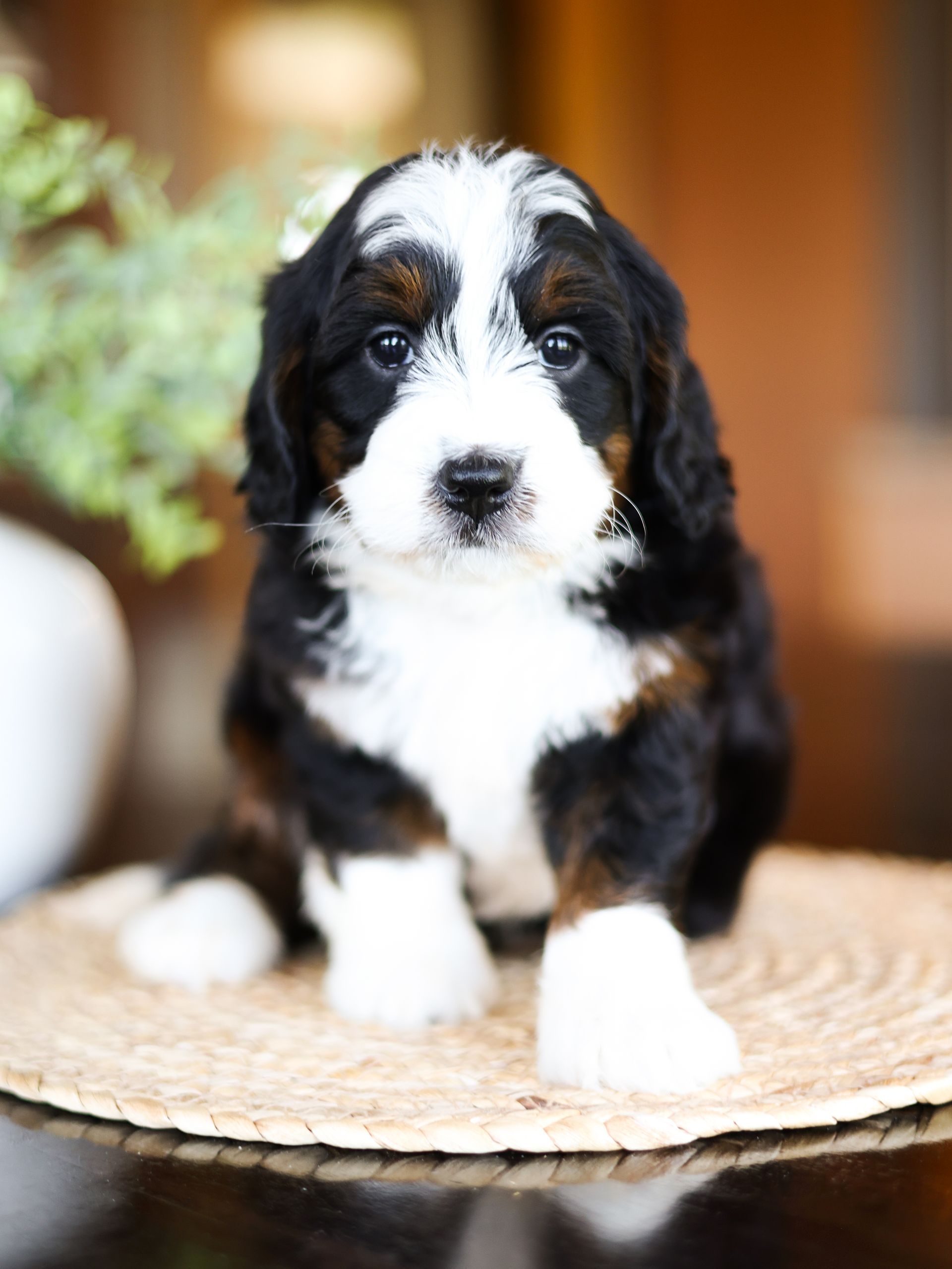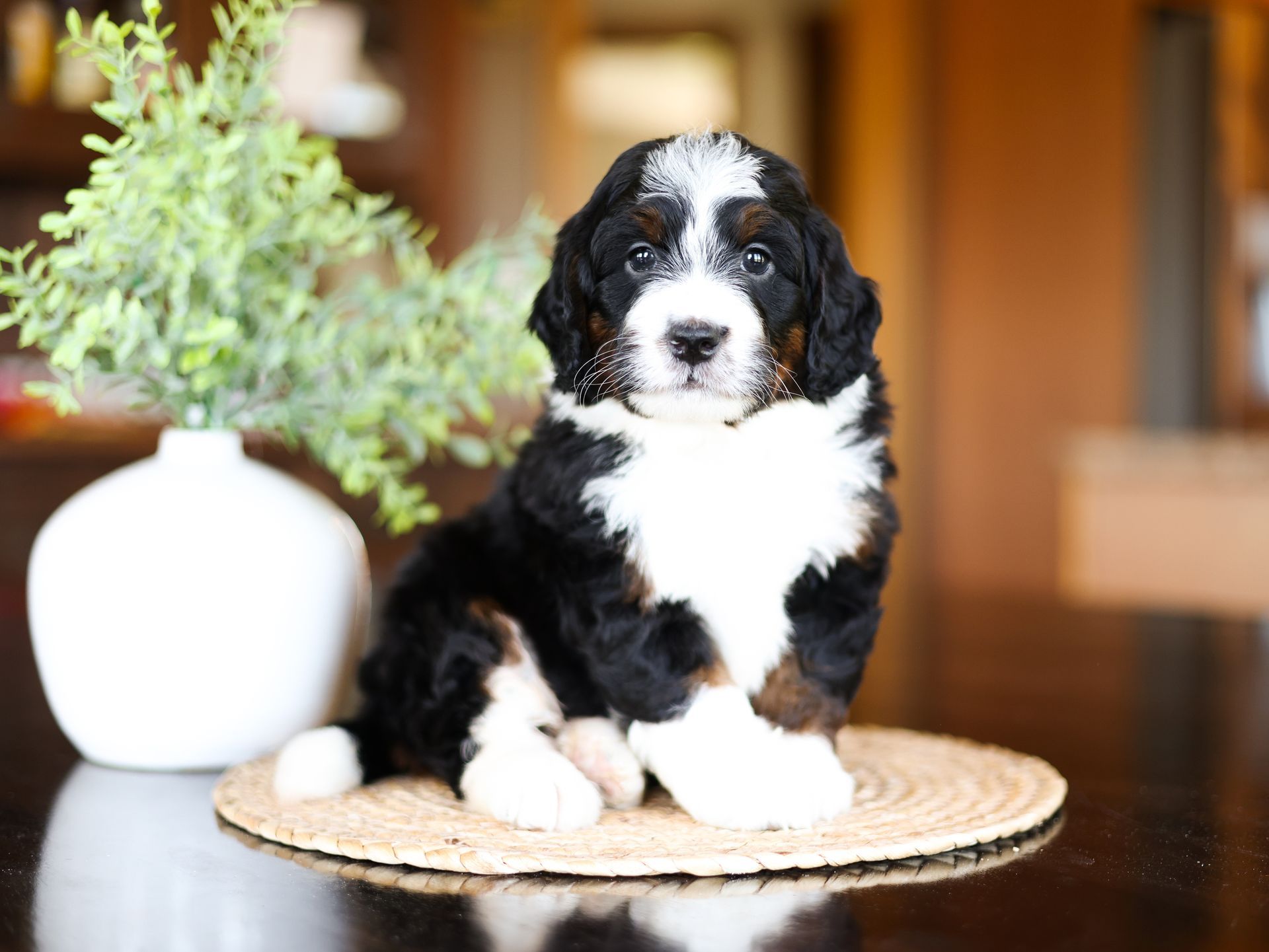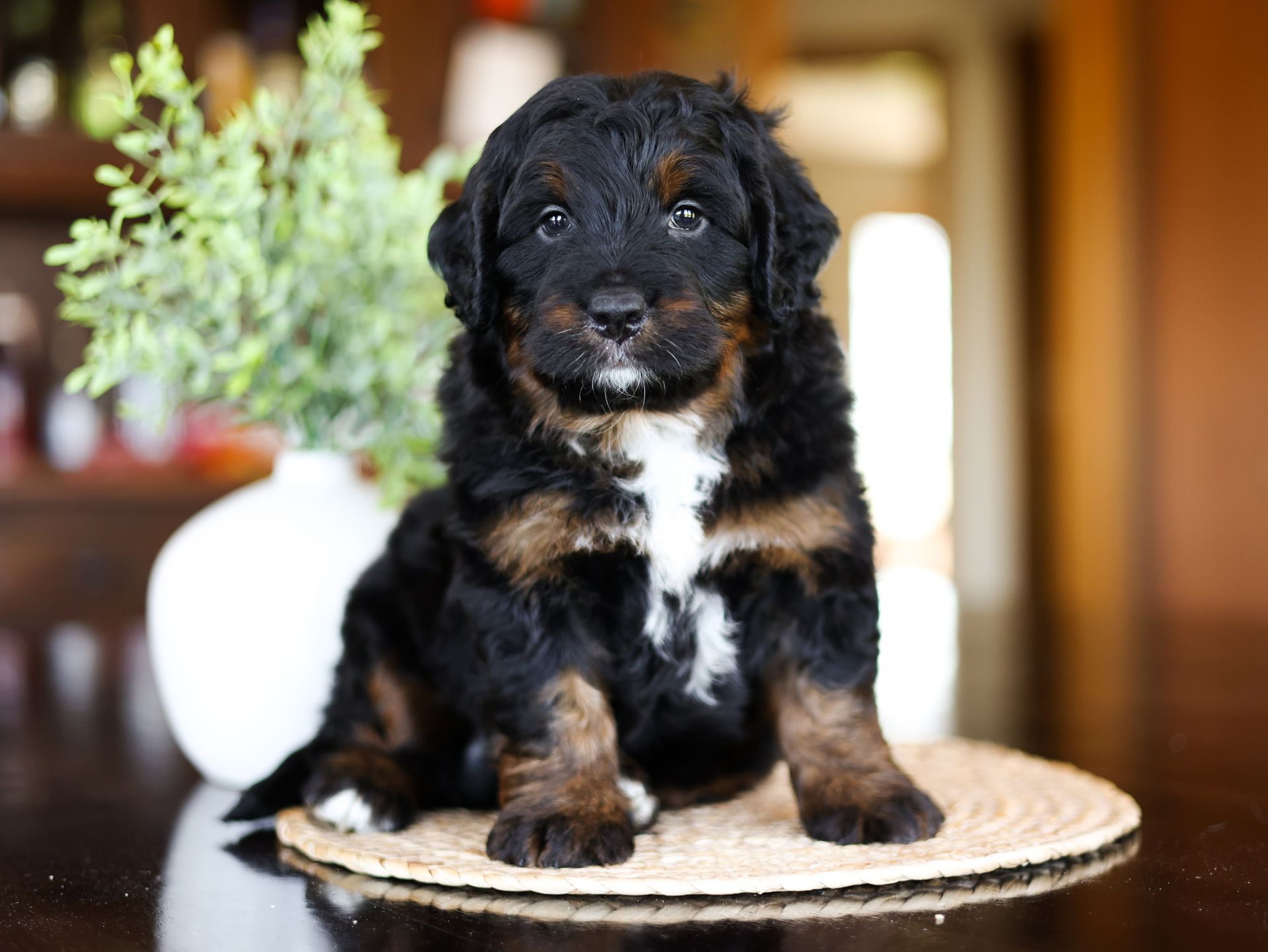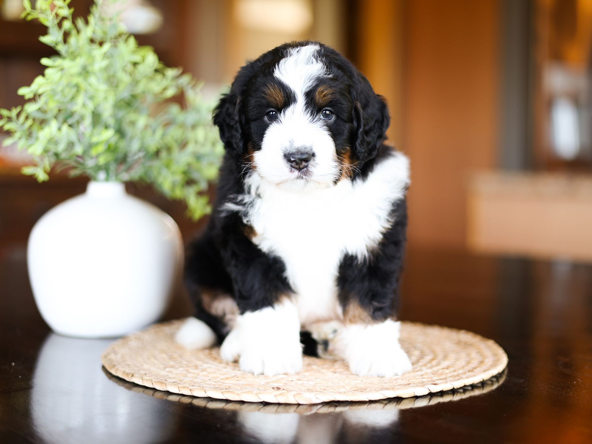 Aayla is simply a good-natured girl. She adores the company of everyone from dogs, people, especially children. Aayla can be best described as happy go lucky. She is lovable, goofy, and extra affectionate. Aayla is the perfect blend of social yet patient. She loves to be included in all actives from fetch, romping around, and walks through the forest. Aayla is charming and will melt your heart in seconds. She bonds naturally with all. Aayla has been a perfect companion for Kimberlee's children and is a gentle giant. Aayla features a large and noble looking structure. She is thick and blocky all around. Aayla's coat is shiny and healthy. She features all the classic Bernese mountain dog markings from four white mittens to lots of rich copper. Aayla is almost 80 pounds. She was born and raised here at our kennel!