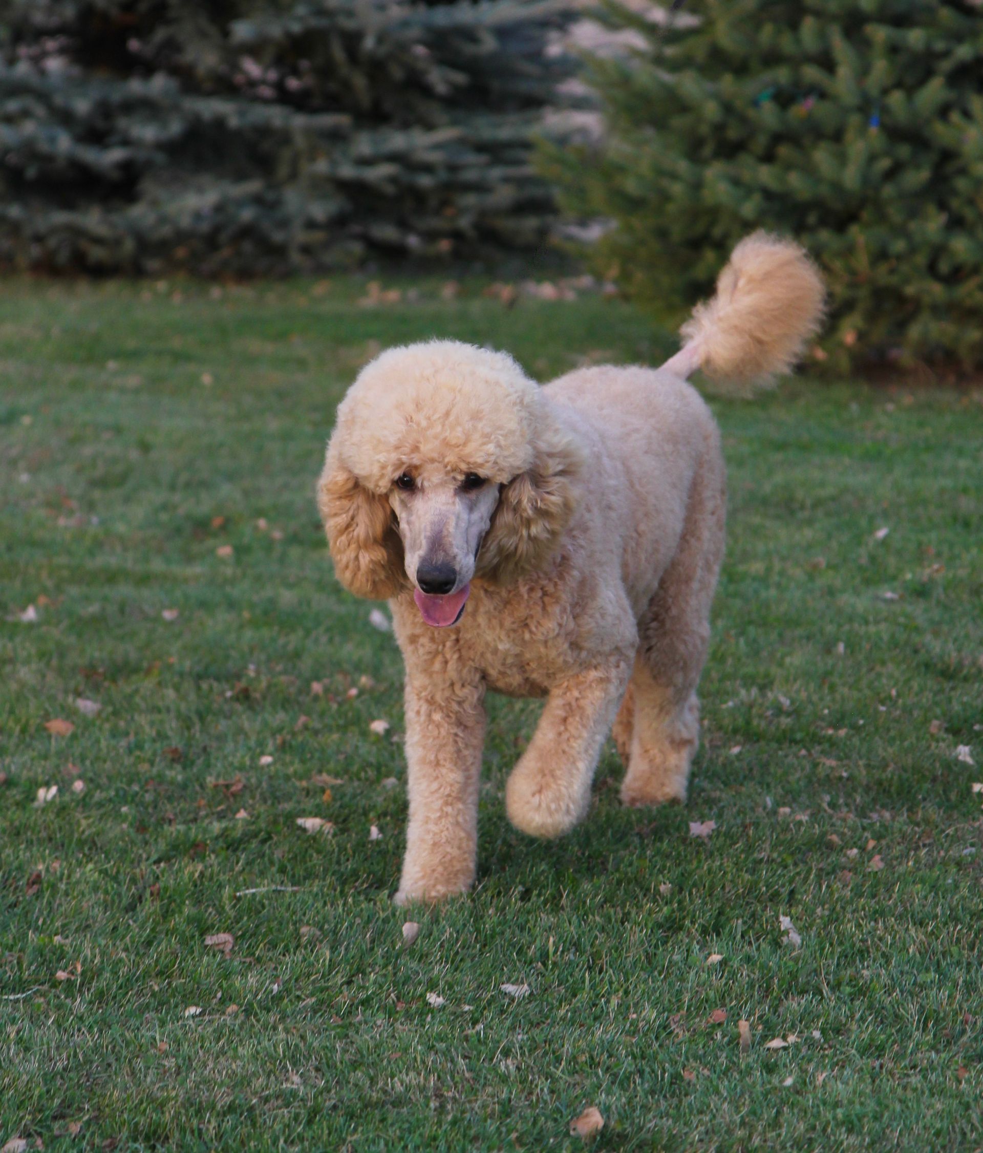 Brilliant Brittany is offspring from our famous Falcon and Farrah lines. She is the most stunning cream poodle. Her build is athletic and square. Brittany has the biggest sweet brown eyes and her coat is thick and curly. She is currently 70 pounds with an athletic build. Brittany has certainly been a staff favorite. She holds herself with pride and an air of dignity. She knows she is a perfect mother always attentive to her puppies. Brittany handles stress well and has lots of patience. She was a breeze to train with strong people orientation. She loves to strut her stuff when she's been fully groomed! Brittany has lots of personality and we know this will passes down to her beloved puppies.