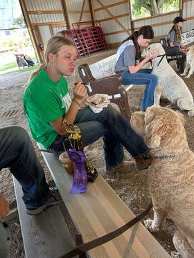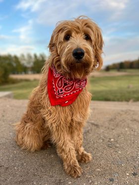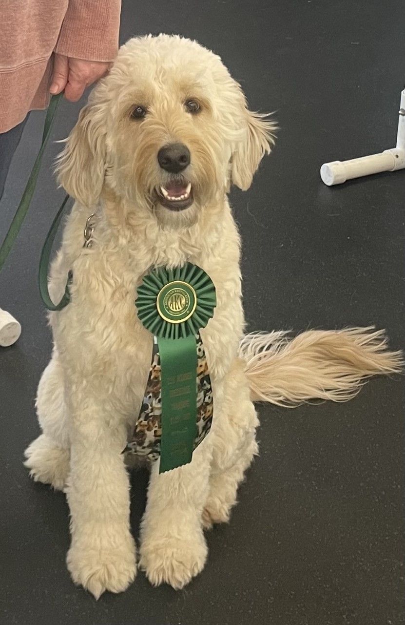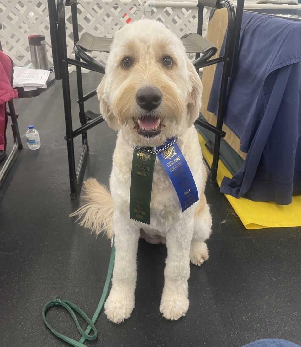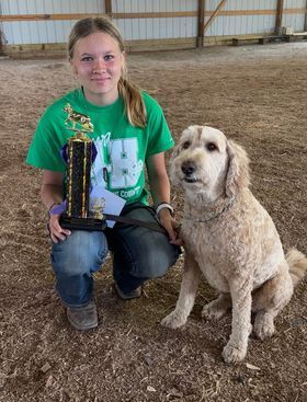 Addison & Piper entered the Muscatine county Fair obedience for the first time ever this year and was a champion winner! Piper is a gorgeous standard F1b goldendoodle from Skye's litter. Piper is about five years of age and a great family member. Piper "gets a long with every dog in the neighborhood and loves play dates. I’ve had many handfuls of dogs over the years. Best dog ever!"