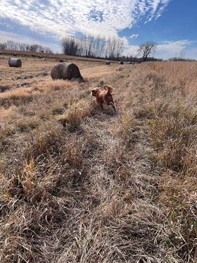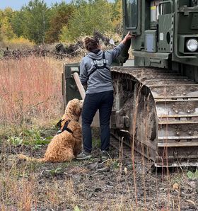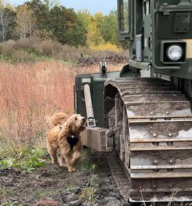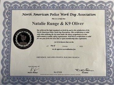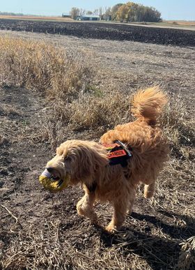 "His name is Oliver Hero. I just wanted to thank you for this dog! He is incredible! He is what is called an Area Search Dog. We volunteer for the Central Lakes Search and Rescue Unit. He is certified in both area search and building searches. He is super fast, so sometimes it is hard to get pictures of him while in active training. This guy is exceptionally unique and he does brilliant work! He is from Jedi and Daisy's litter from 2021. It typically takes a dog 2 years to certify and he did it in just 5 months! He truly is a special dog and so amazing at his job! He was going to be a therapy dog for my mental health practice, but I found he was super passionate about searching for people so we went that route instead. I actually participated in cognition testing with him and his memory is so stellar that he ACED it! I've done a lot of work with him to figure out what he is most passionate about and this is it! I threw in a picture of his sister from the same litter. She too is training as a service dog. The two of them are best friends!" - Natalie Runge.