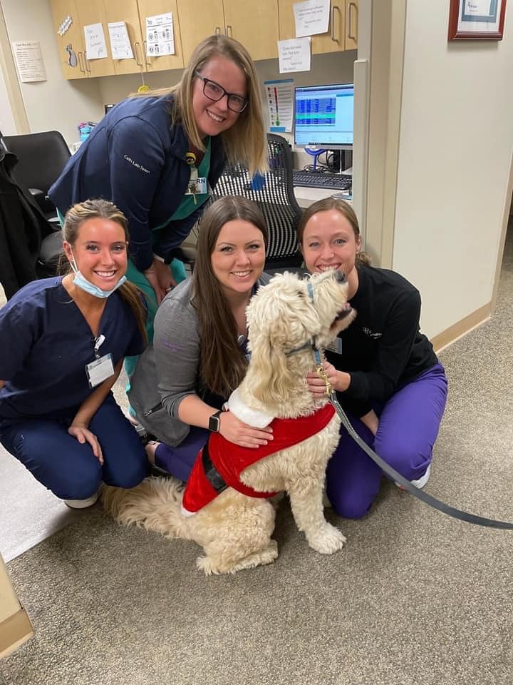 "Ozzie and I are members of Love on a Leash pet therapy group. Our volunteer visits include Mercy Mental Health adolescents and adults, Mercy CHI and University of Nebraska medical staff, the Children’s department of our local public library, destressing university students during finals week, nursing homes, and public school visits."We were part of Mercy/cHI Wellness Day. The staff loved interacting with Ozzie. It’s been such a stressful year for health care workers."