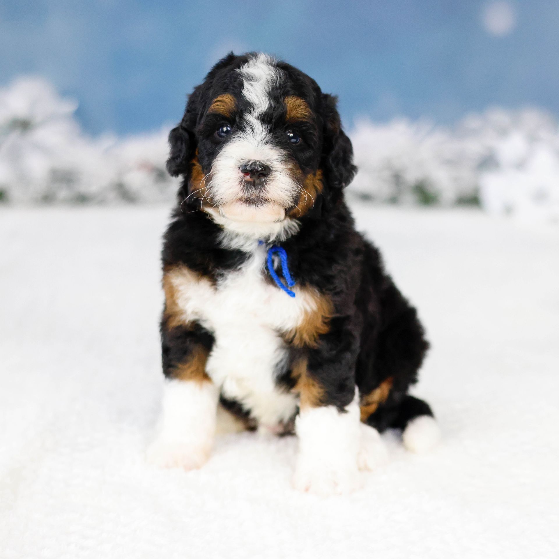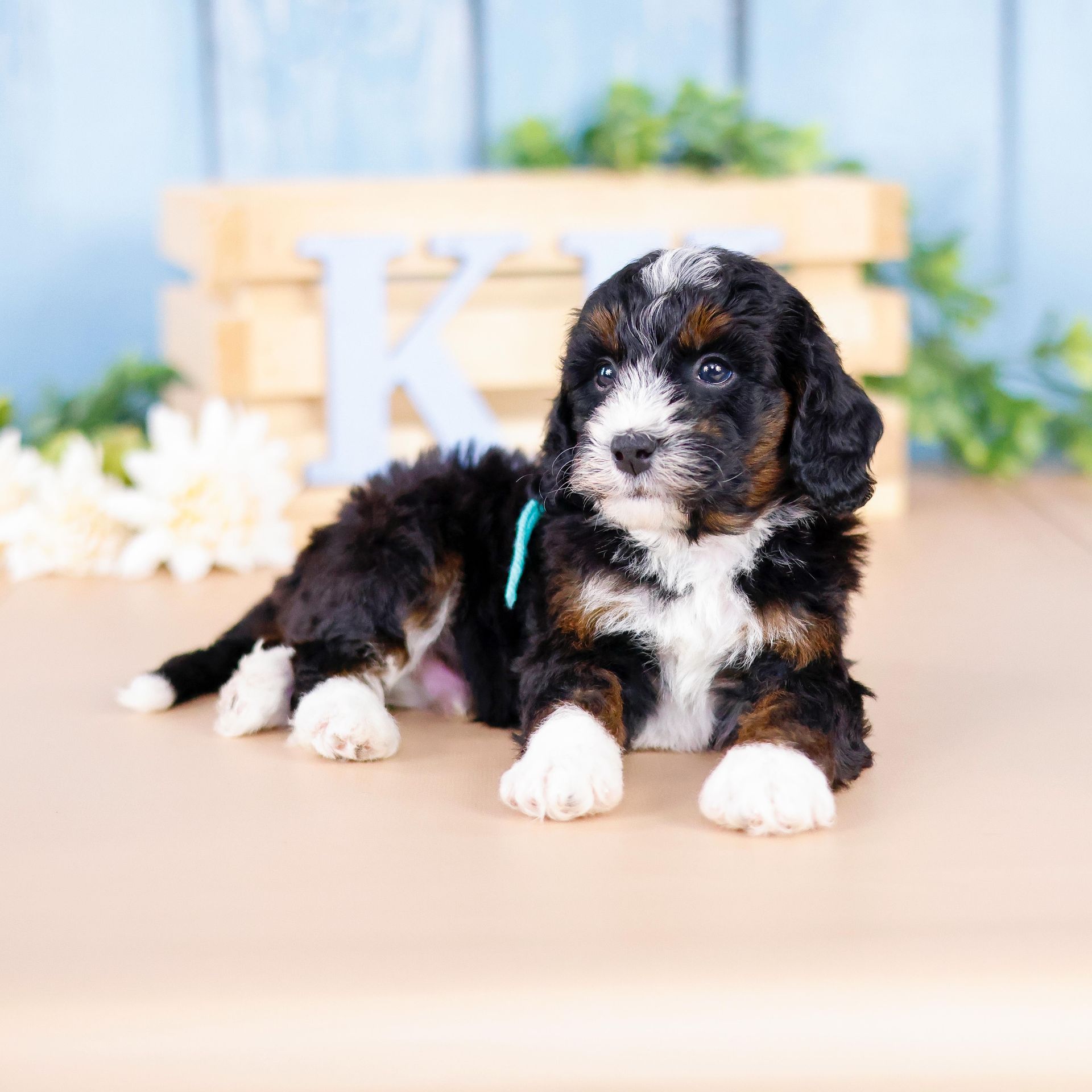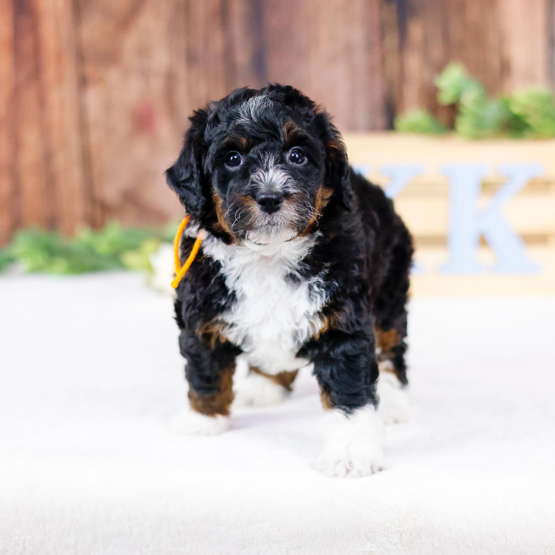 Draco is our top stud here for our miniature bernedoodle line. He has great genetics, see below. He weighs just about 15 pounds and stands 14" to the withers. He is non-fading and carries two genes of proper coat. He is a sweet natured boy that enjoys people, plays well with other dogs and is a joy to have as part of our program.