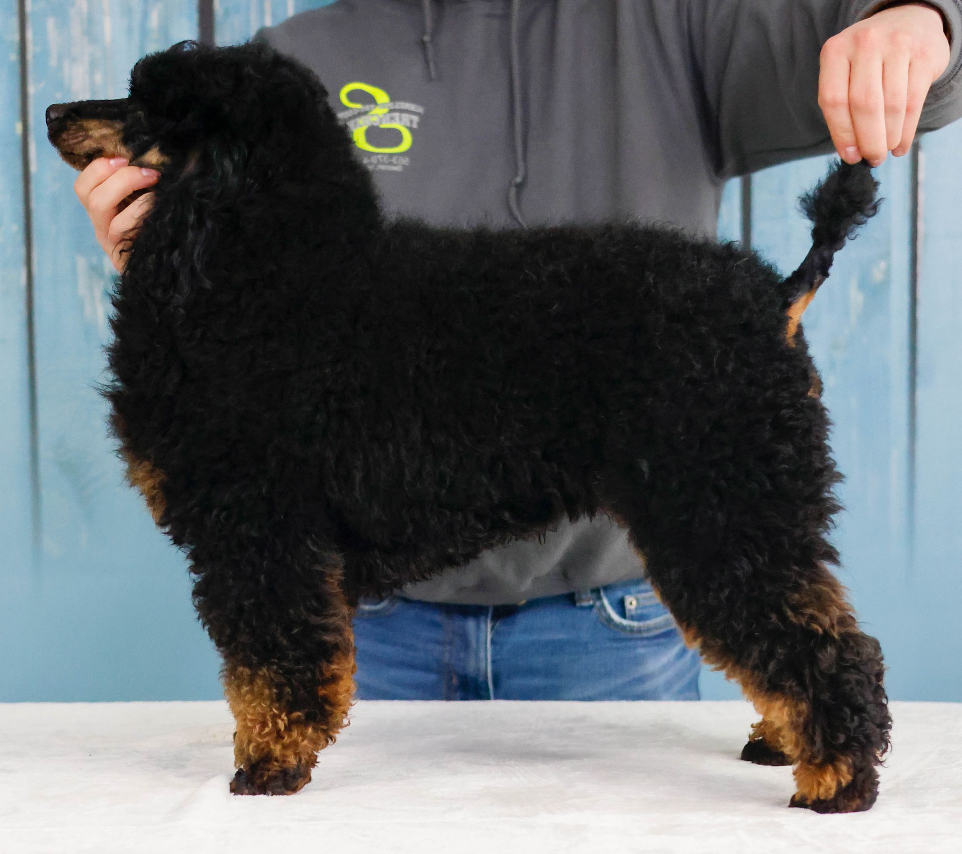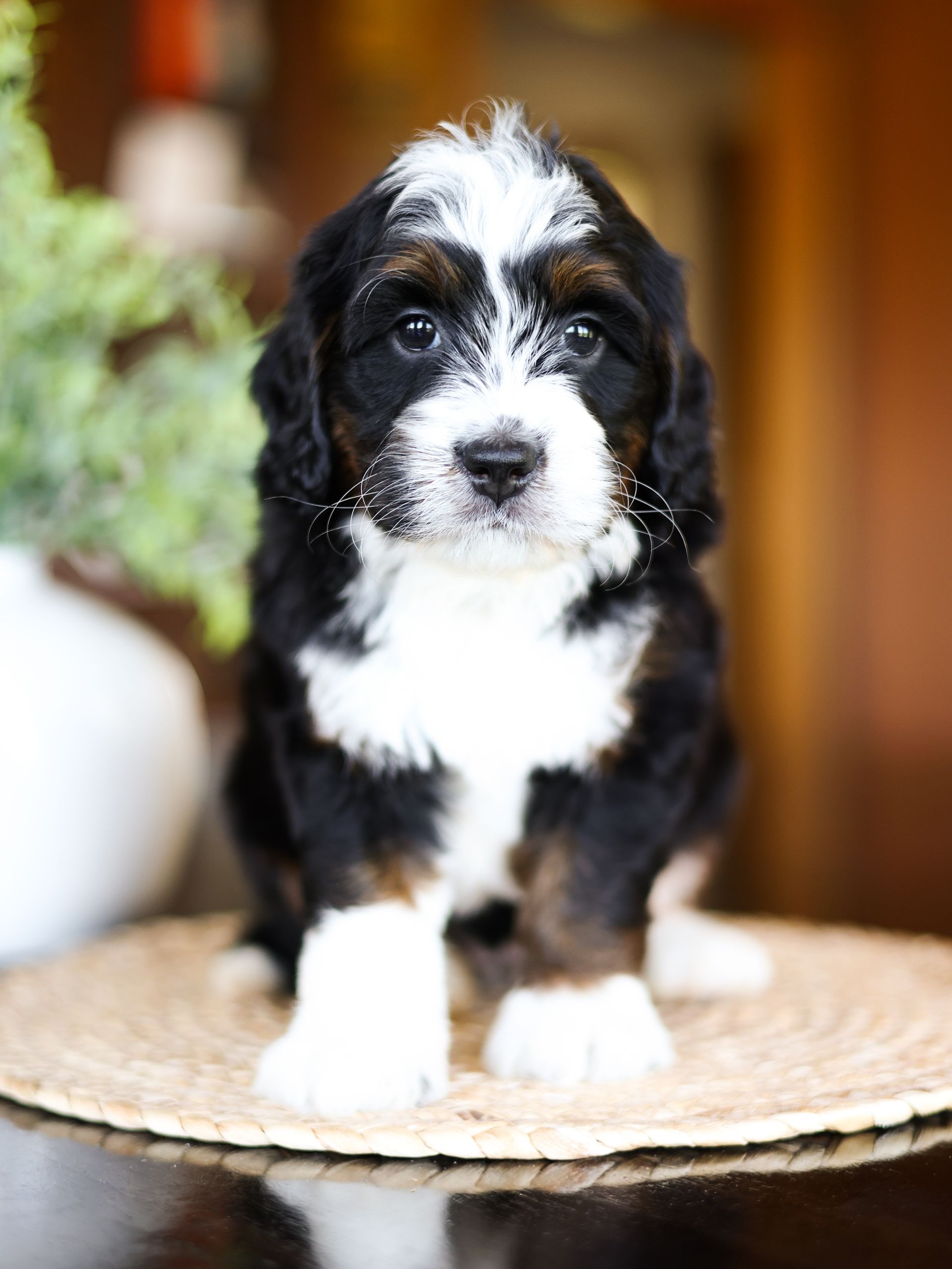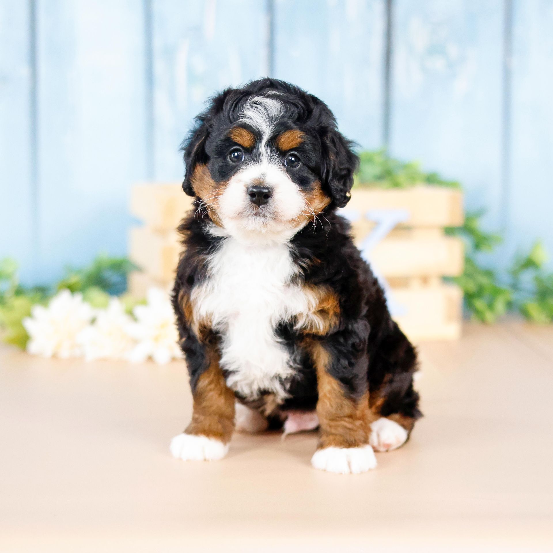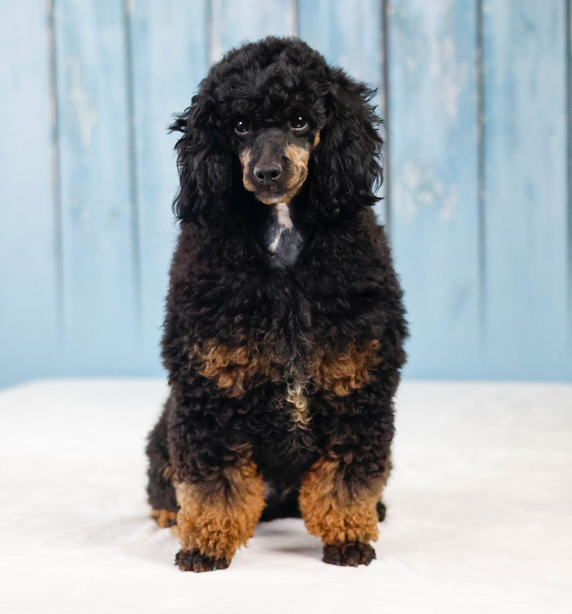 Draco is our top stud here for our miniature bernedoodle line. He has great genetics, see below. He weighs just about 15 pounds and stands 14" to the withers. He is non-fading and carries two genes of proper coat. He is a sweet natured boy that enjoys people, plays well with other dogs and is a joy to have as part of our program.