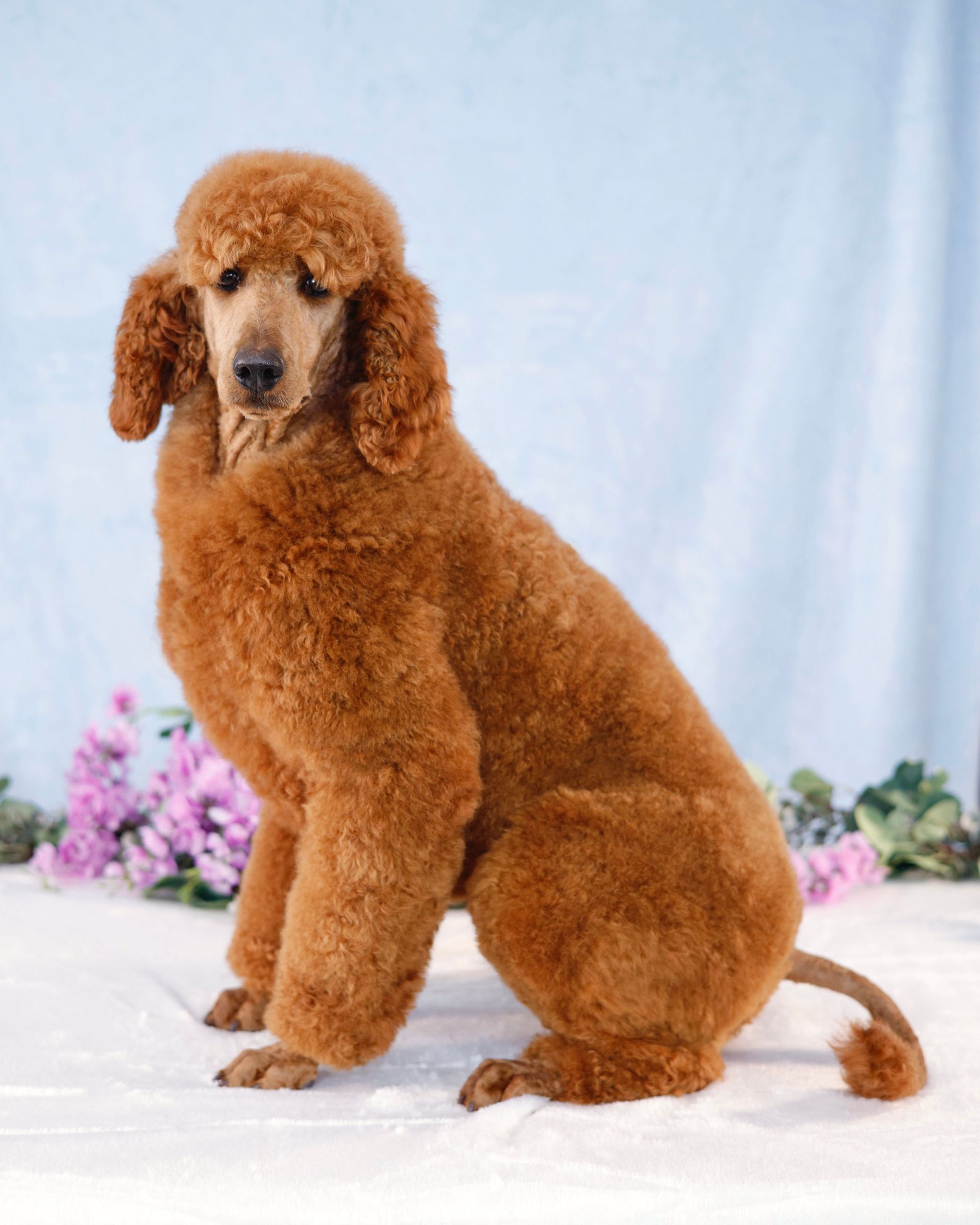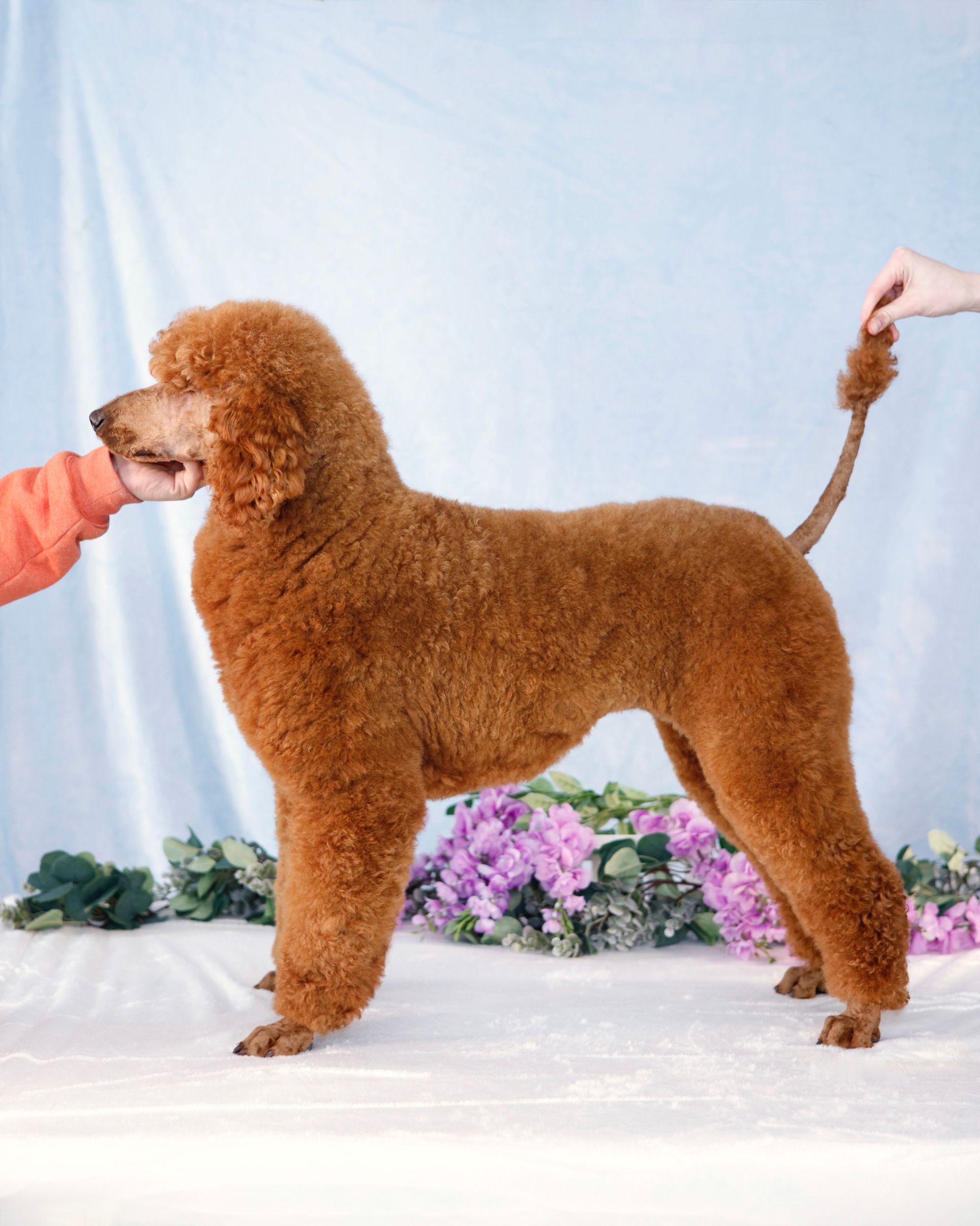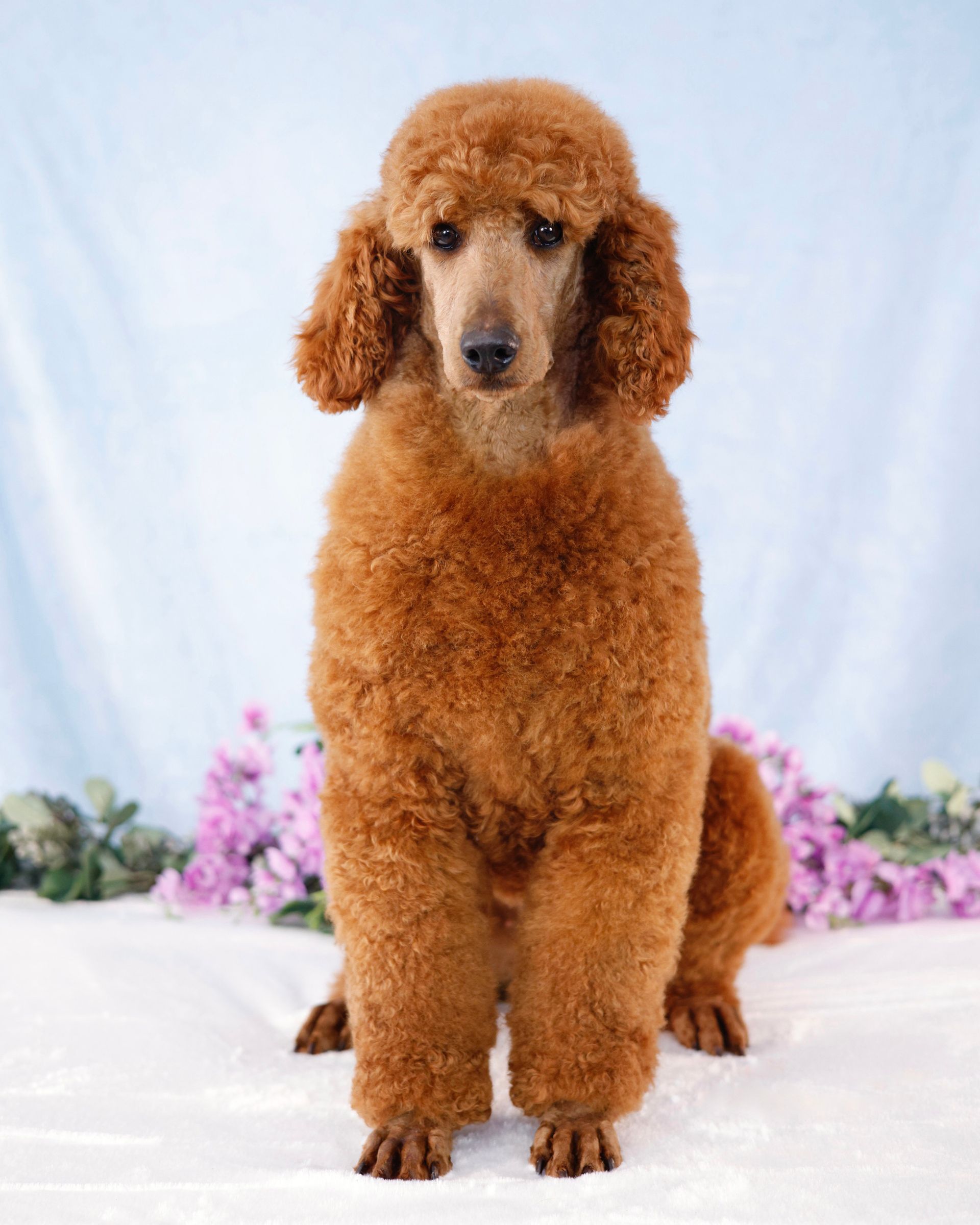 Graceful Ginger is a show-stopping poodle! Her vibrant red coat and round puppy-dog eyes turns heads wherever she goes. Her coat is thick and shiny with the softest curls. Her coat is one of many defining features. Ginger features a perfect build; a square body, straight back, and an overall air of elegance to herself. Ginger has long low-set ears and a black button nose giving her the cutest cartoon expression. Ginger is 39 pounds and over 22 inches to her shoulders. Ginger can simply be described as "extra sweet". She loves love and is the most loyal girl. Ginger is always happy to greet you and will do a whole body wiggle to show how happy she is! Ginger loves being pampered, snuggling, and ear scratches. There is no mean bone in Ginger's body as she gets along with new people and all dogs. Ginger has absolutely stole the hearts of everyone she meets. She is the type of poodle that everyone strives to have. Her personality is safe and family friendly. Ginger loves all treats, especially a cold pup cup on warm summer days. Ginger loves playing fetch and romping around our creek. Her calm confidence lets her handle stress with ease. Nothing phases our Ginger. We could truly go on forever about Ginger's loving and caring temperament. Ginger is also a nurturing and patience mother who deeply bonds with her puppies.