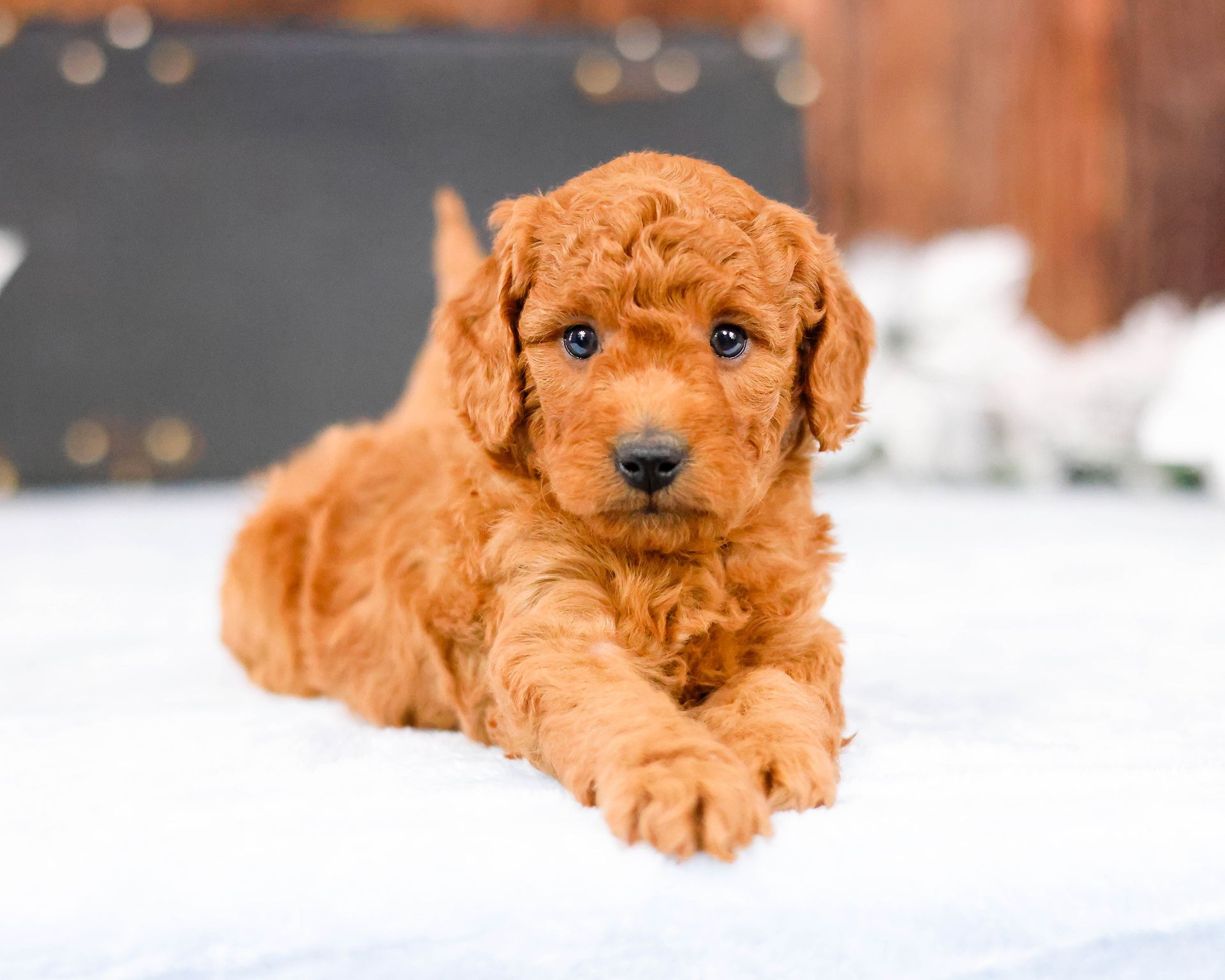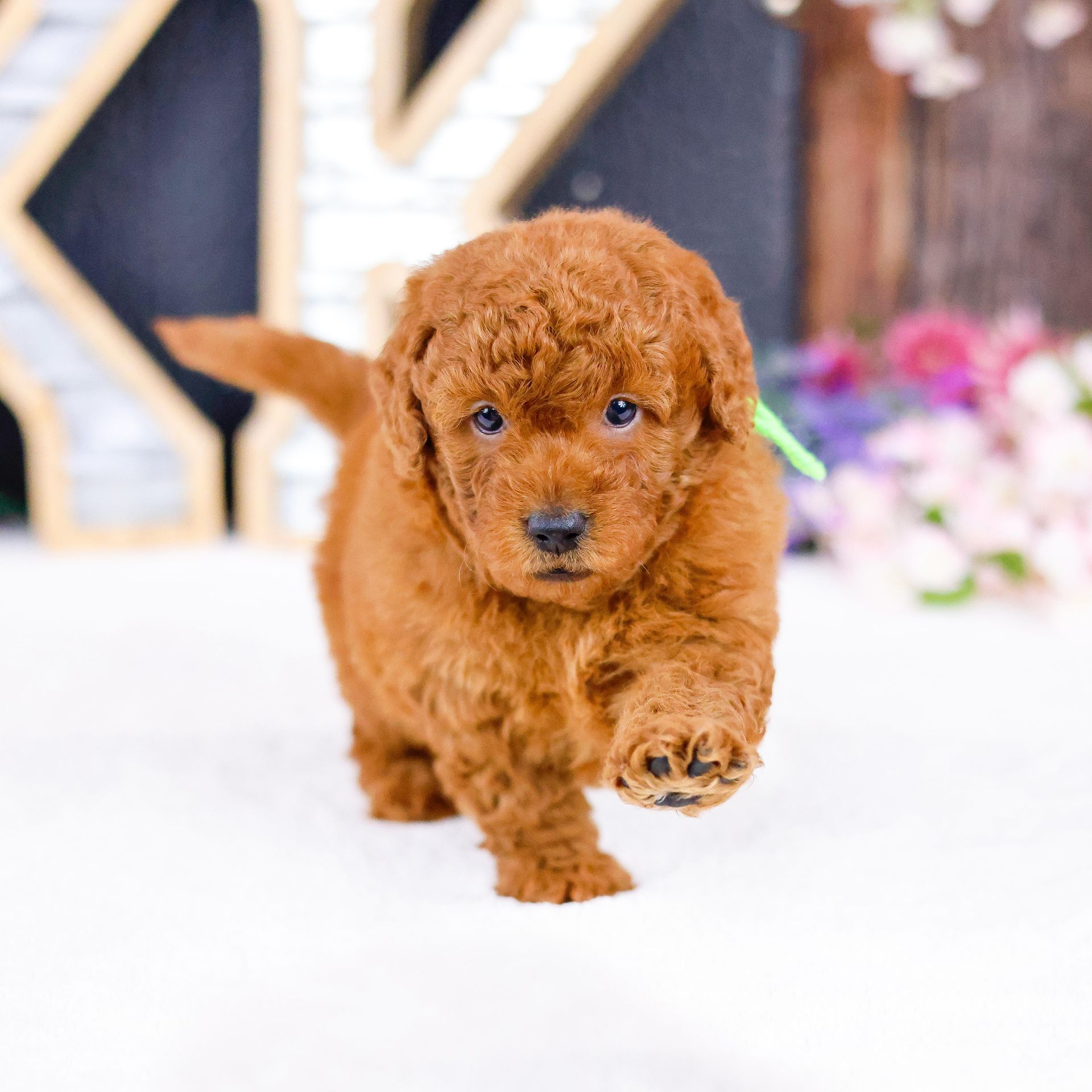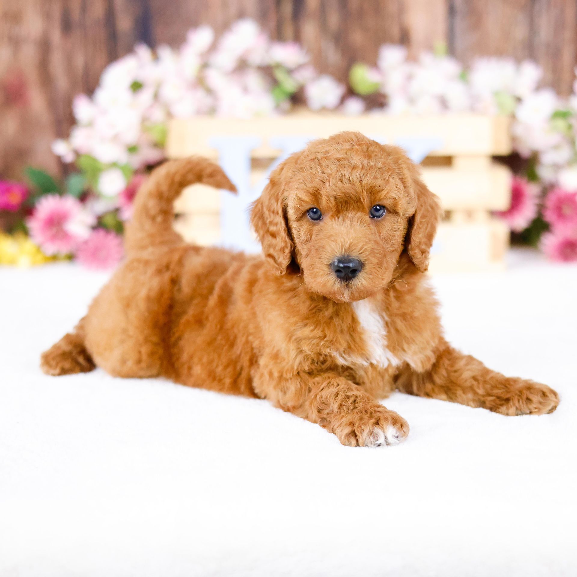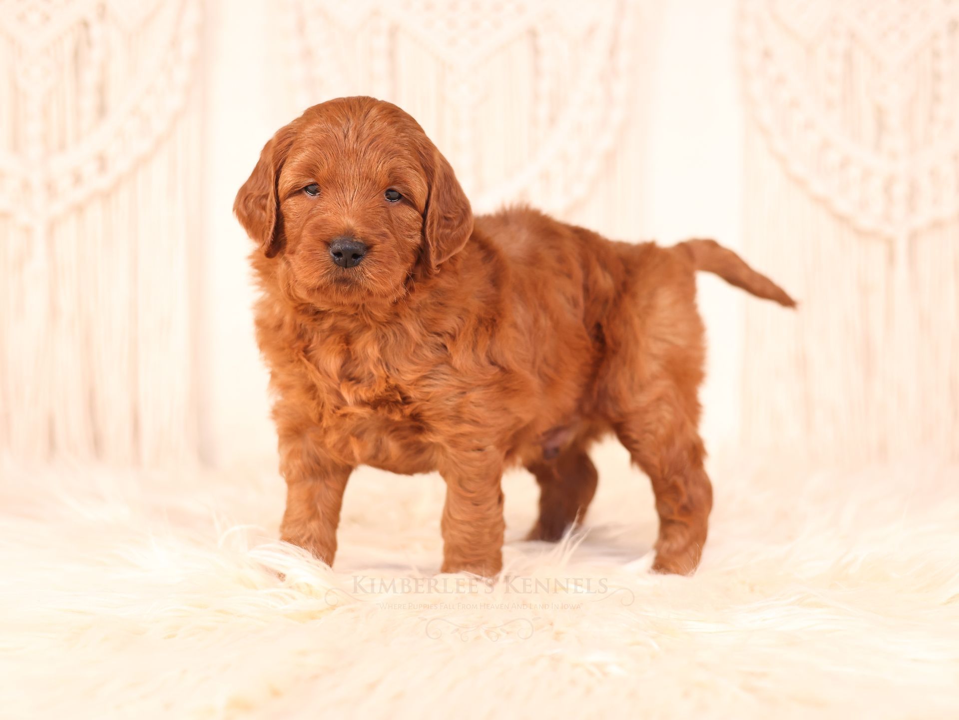 Harley comes from our famous T-Rex line and is currently a top producer for our goldendoodle line. He has an amazing coat which is thick and plush which produces outstanding goldendoodles as he carries two genes of proper coat. We also pride ourselves in breeding for temperament, and this guy nails it in temperament as he is intelligent, charming, quiet-natured and loving. He gets along well with other dogs and is always ready to have a good time playing with my 7 children and greeting guests upon arrival. He has outstanding genetics, see below. You can feel confident purchasing one of his puppies. You won't be disappointed. Harley's weight is 15 pounds and he stands 14" to the withers.