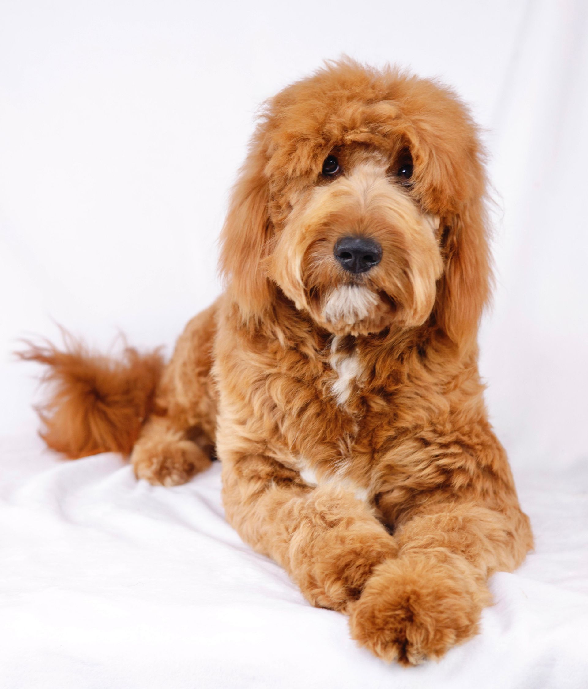 Happy Honey is one stunning goldendoodle! Her coat is straight and fluffy with a silky soft texture. Honey has thick full furnishings, long ears, and pouty eyes giving her a cartoon appearance. Her white tipped chin and black button nose add to her sweet looks. Honey's coat is a bright rich red color and she has a white tuxedo chest which adds nice contrast. Honey features an athletic blocky build with rounded features. She is 53 pounds. Overall Honey features your classic goldendoodle structure. Momma Honey is the producer of our miniature F1b goldendoodle puppies. Her puppies typically mature between 28-35 pounds. Honey's previous puppies feature a nice variety of curly to wavy coats in a medium to deep red color with white abstract markings. Honey is outgoing and loves to run and play! During the summer and fall Honey enjoys hiking, going on walk, and romping around in our creek. She gets along with all dogs and everyone she meets. She is bubbly and her positive inviting demeanor seems to be contagious. She loves head scratches and bacon treats. She scores high in intelligence and has lots of interest in exploring our farm. Honey has endless love to offer and has been the best mom. She makes she her puppies are always clean and well feed with little round bellies. As they mature she enjoys playing with them, yet so is always so carful and gentle.