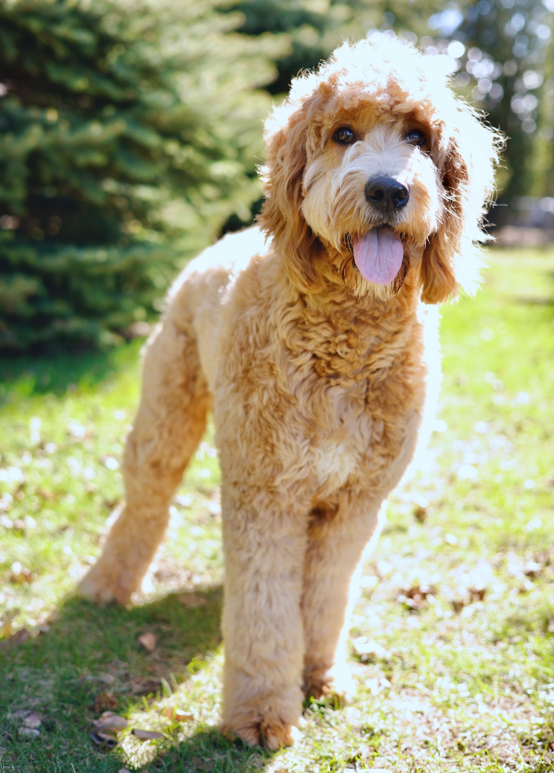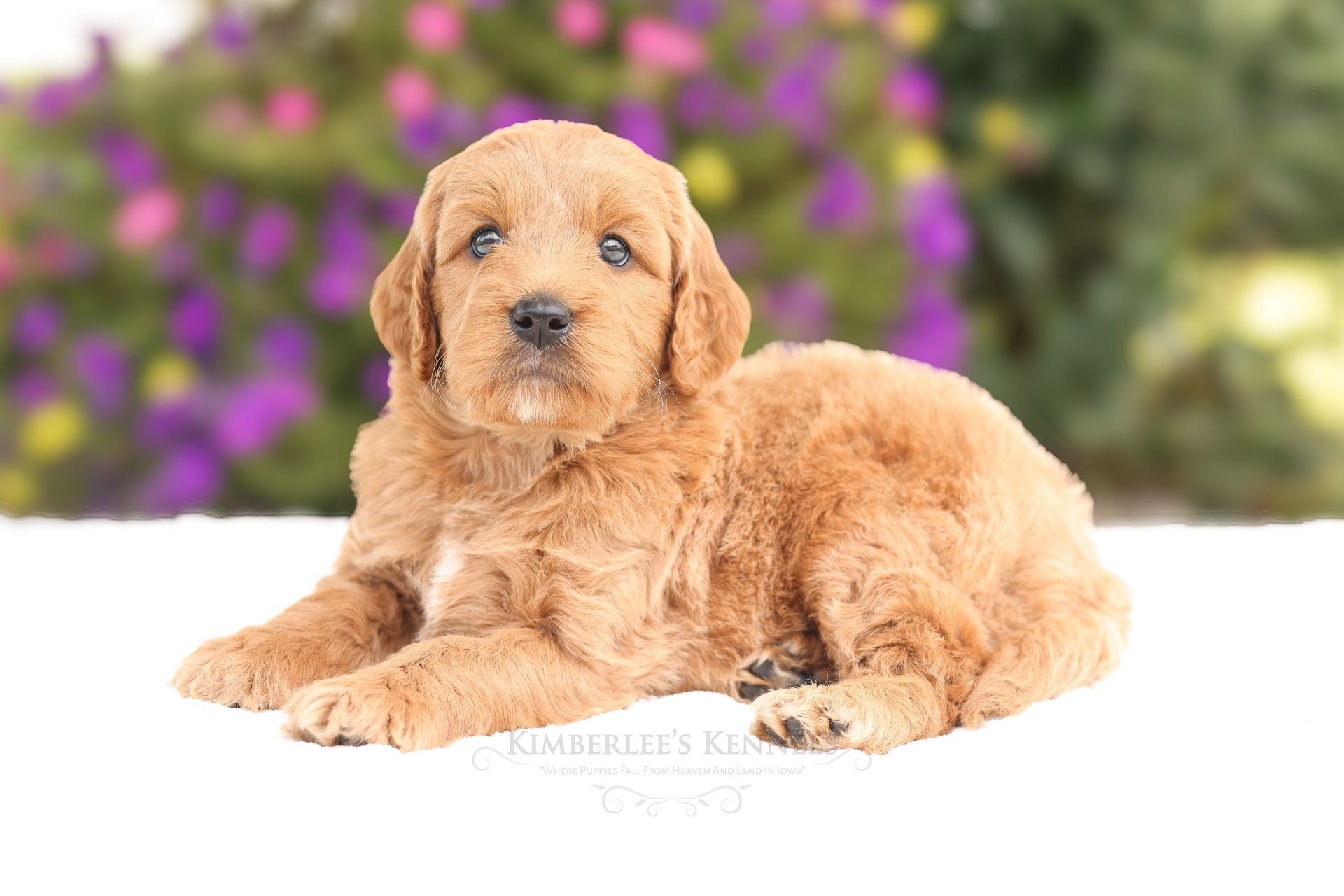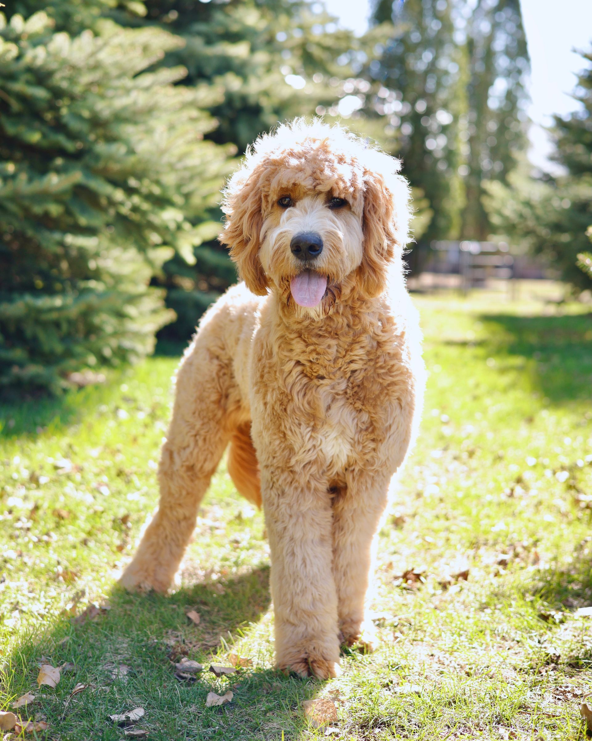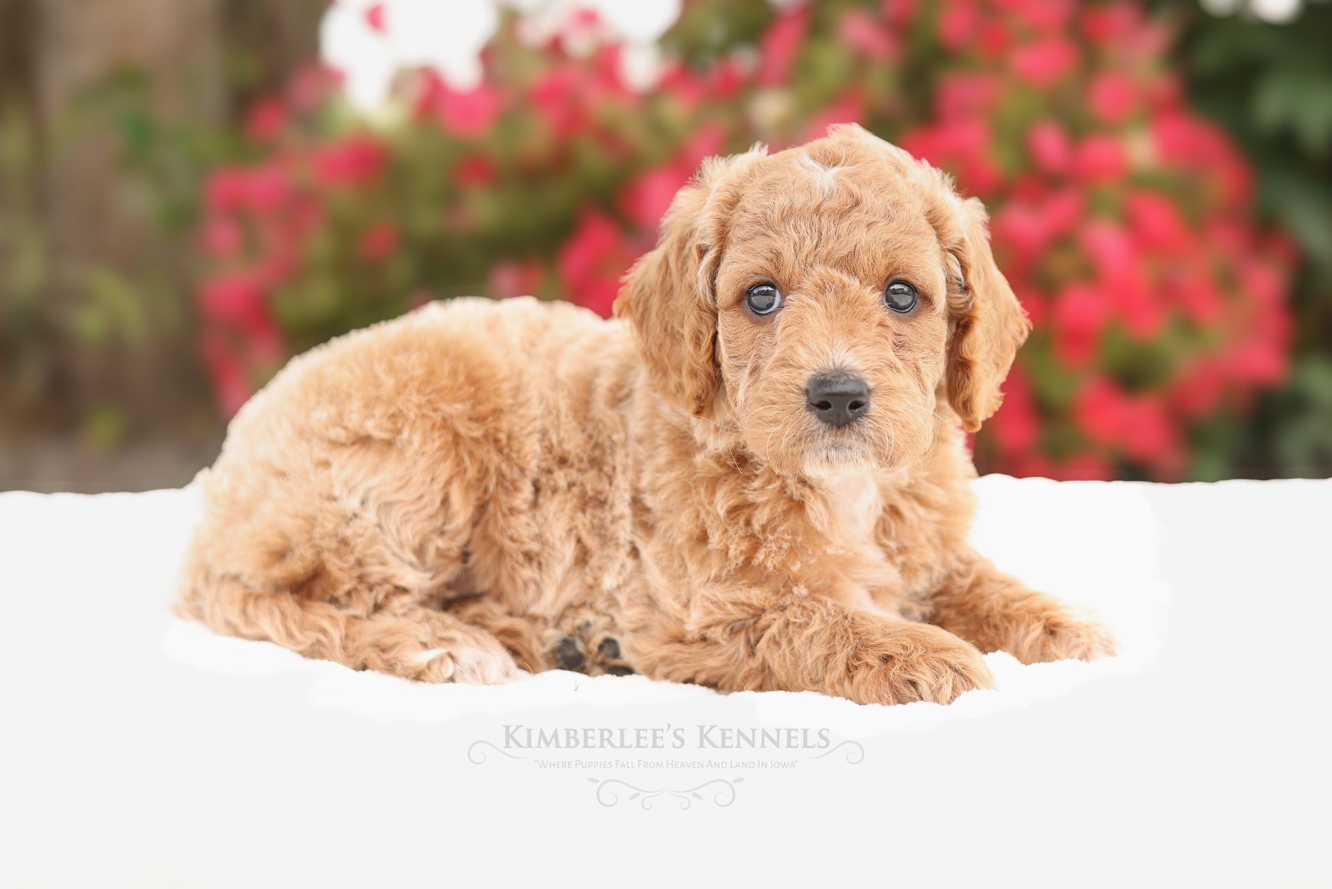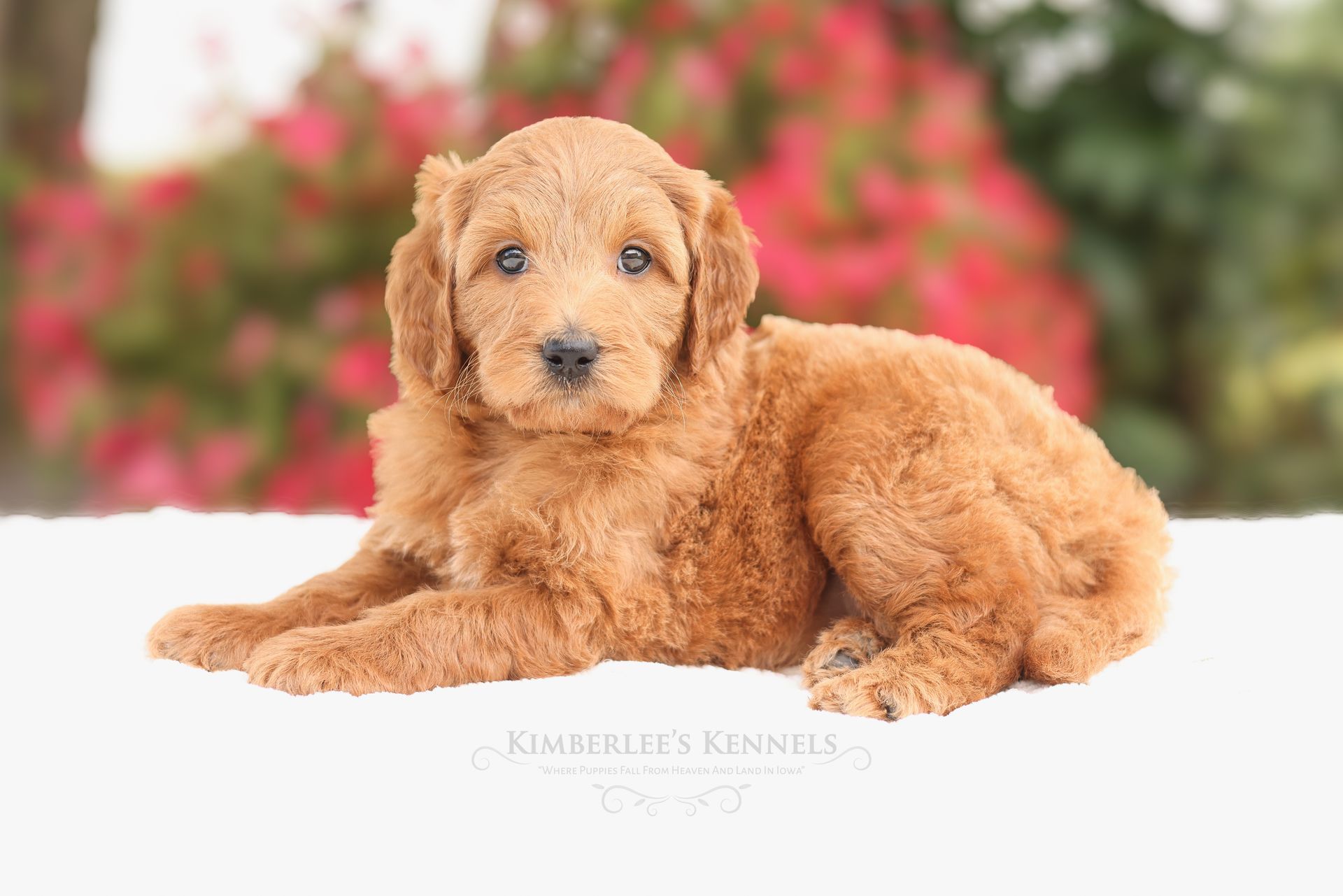 Miss Miley currently resides in a guardian home near Decorah! Miley has a puppy sister and they love to snuggle and go on walks together. Miley is soft and quiet in nature. She shows very strong human attraction and create deep bonds with her people. She is mellow and could cuddle all day. She too likes to go out and about for car rides, river days, and fun hikes. Miley has had no litters so far, but eventually may have a litter of miniature F1b englishdoodles. Miley has an athletic build with rounded features. She features an apple shaped head and shorter snout. Her round expressive eyes, big button nose, and floppy ears give her a real life doll appearance. Miley is 65 pounds. Her coat is fleecy soft with a loose wave. Miley's coat is a rich carmel color and she has a light cream patch on her snout, chest, and tail. Miley was born here at Kimberlee's kennels and raised in a home environment. She is from our previous Pearl and Klaus litter. Pearl is an AKC english-cream retriever while Klaus is an AKC standard poodle. Both of Miley's parents are now retired and live in wonderful pet homes. Miley comes from a long lineage of well breed, beautiful, healthy, and family-friendly tempered dogs.