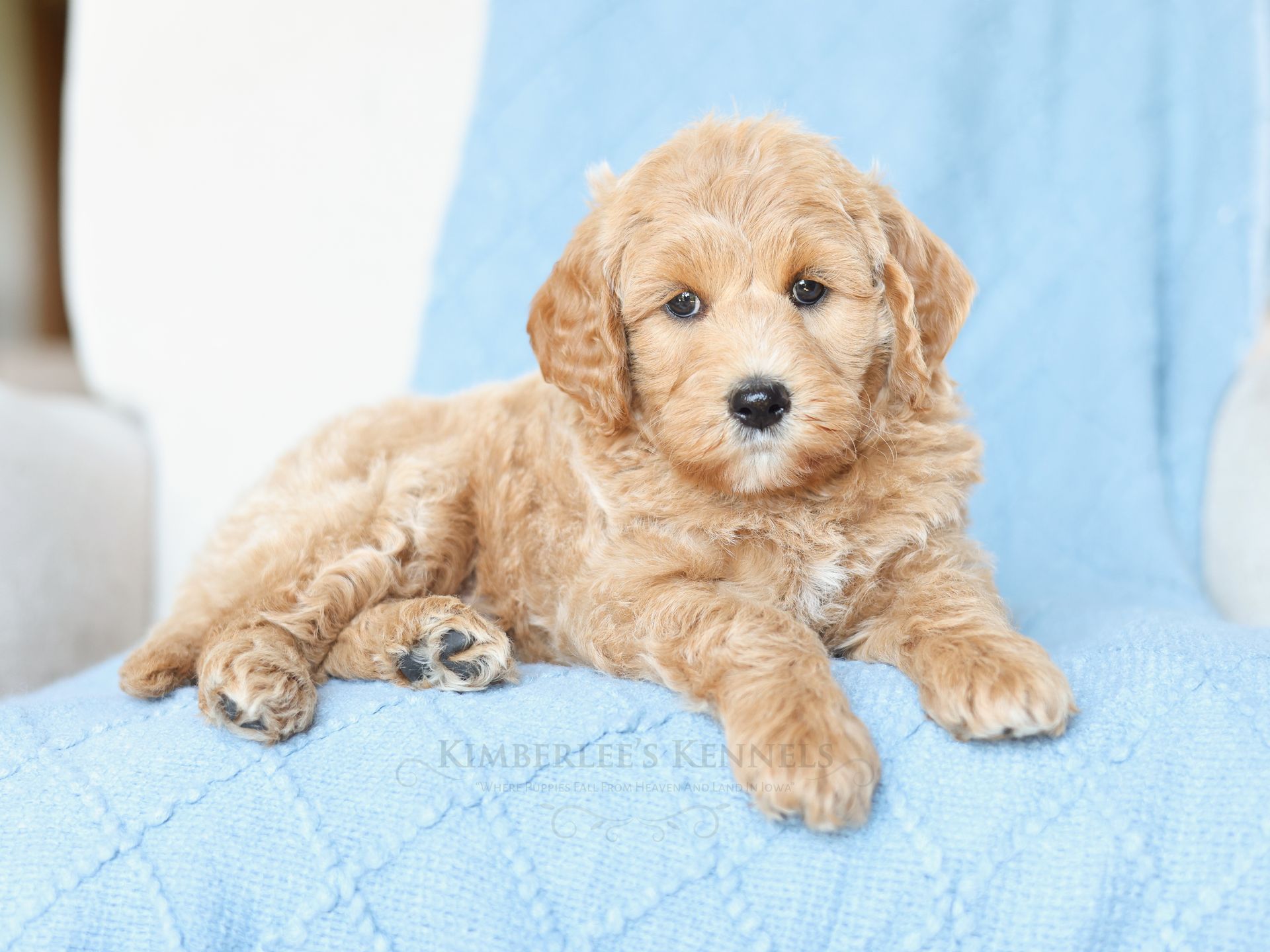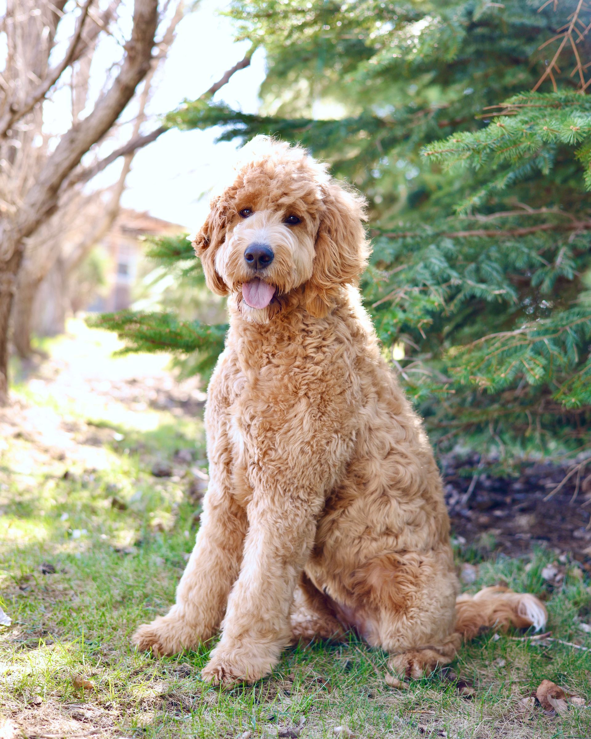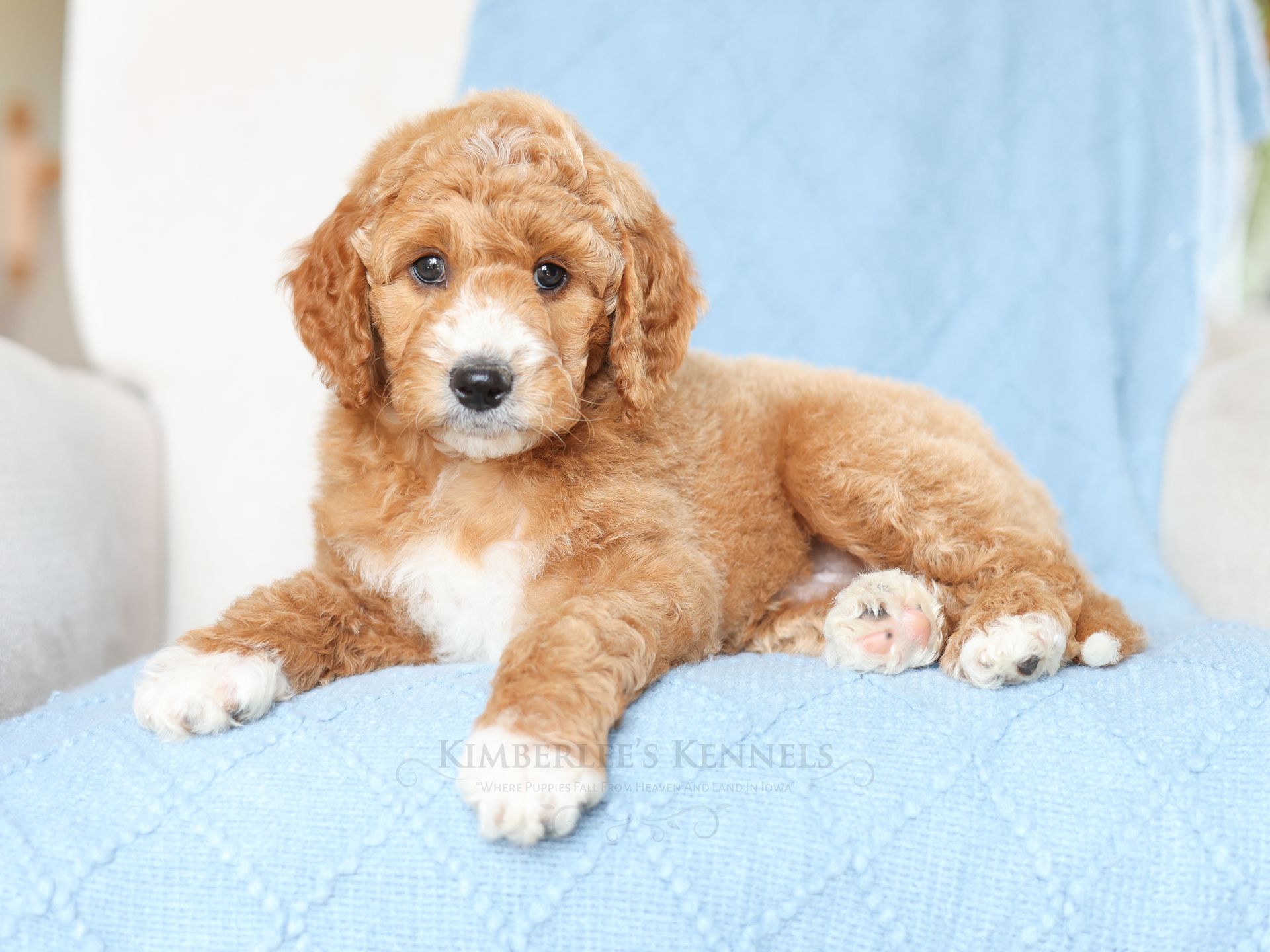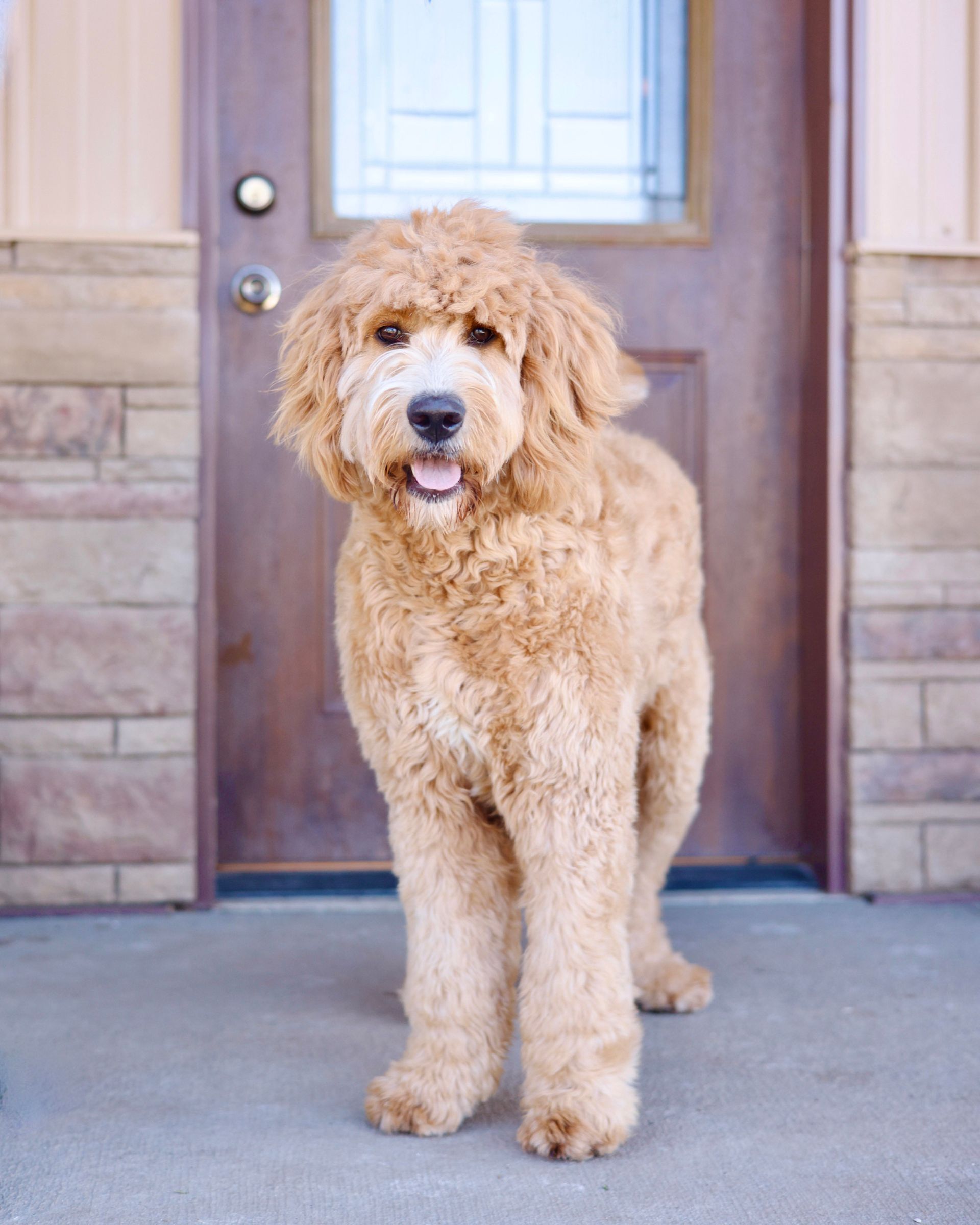 Miss Miley currently resides in a guardian home near Decorah! Miley has a puppy sister and they love to snuggle and go on walks together. Miley is soft and quiet in nature. She shows very strong human attraction and create deep bonds with her people. She is mellow and could cuddle all day. She too likes to go out and about for car rides, river days, and fun hikes. Miley has had no litters so far, but eventually may have a litter of miniature F1b englishdoodles. Miley has an athletic build with rounded features. She features an apple shaped head and shorter snout. Her round expressive eyes, big button nose, and floppy ears give her a real life doll appearance. Miley is 65 pounds. Her coat is fleecy soft with a loose wave. Miley's coat is a rich carmel color and she has a light cream patch on her snout, chest, and tail. Miley was born here at Kimberlee's kennels and raised in a home environment. She is from our previous Pearl and Klaus litter. Pearl is an AKC english-cream retriever while Klaus is an AKC standard poodle. Both of Miley's parents are now retired and live in wonderful pet homes. Miley comes from a long lineage of well breed, beautiful, healthy, and family-friendly tempered dogs.