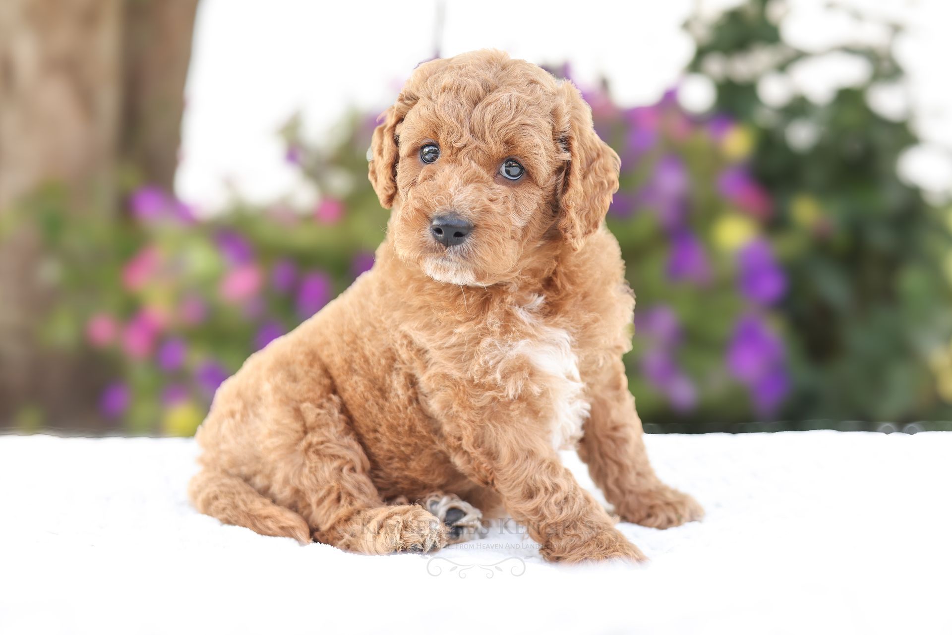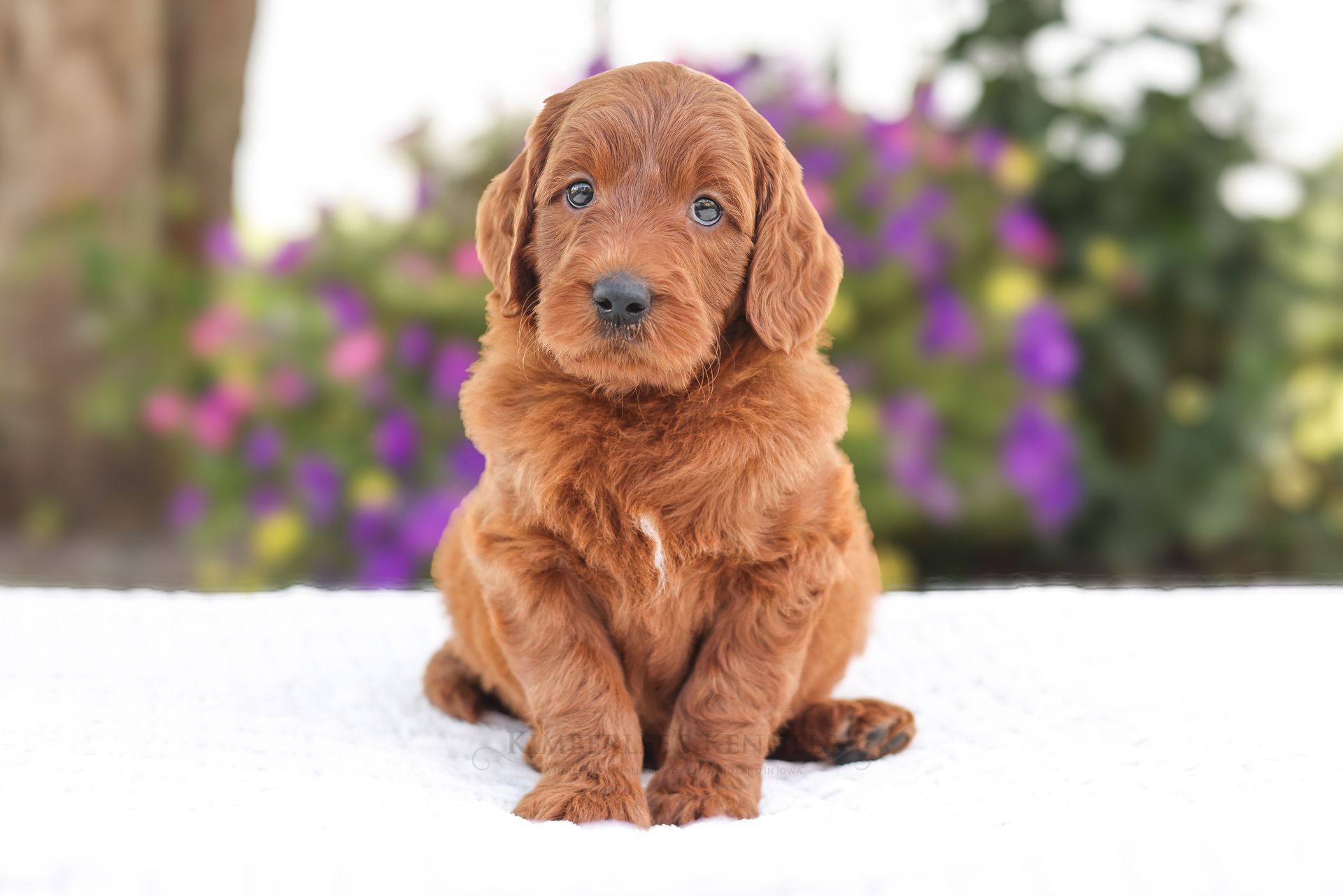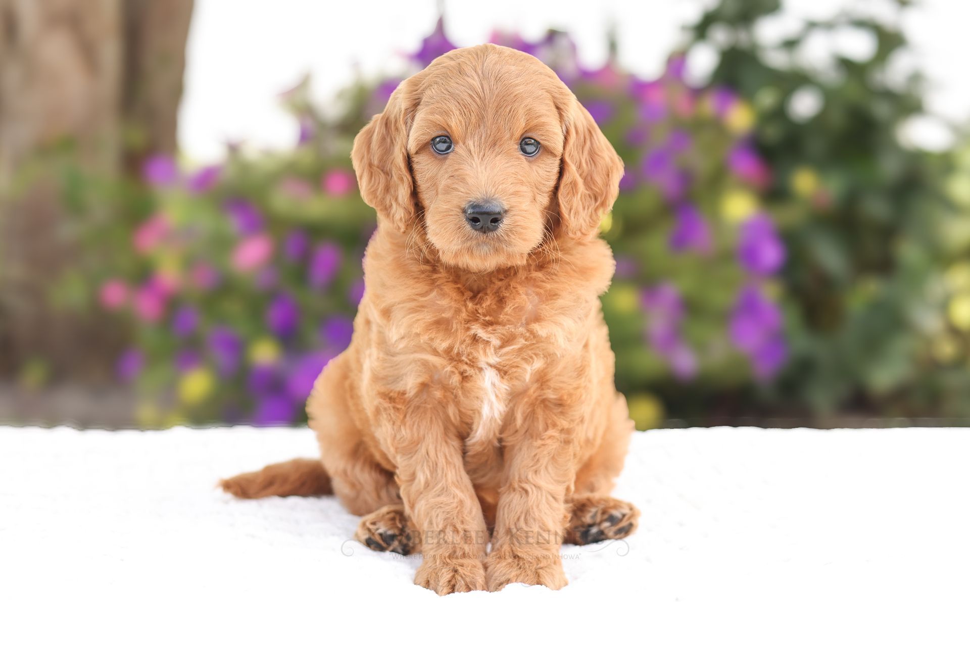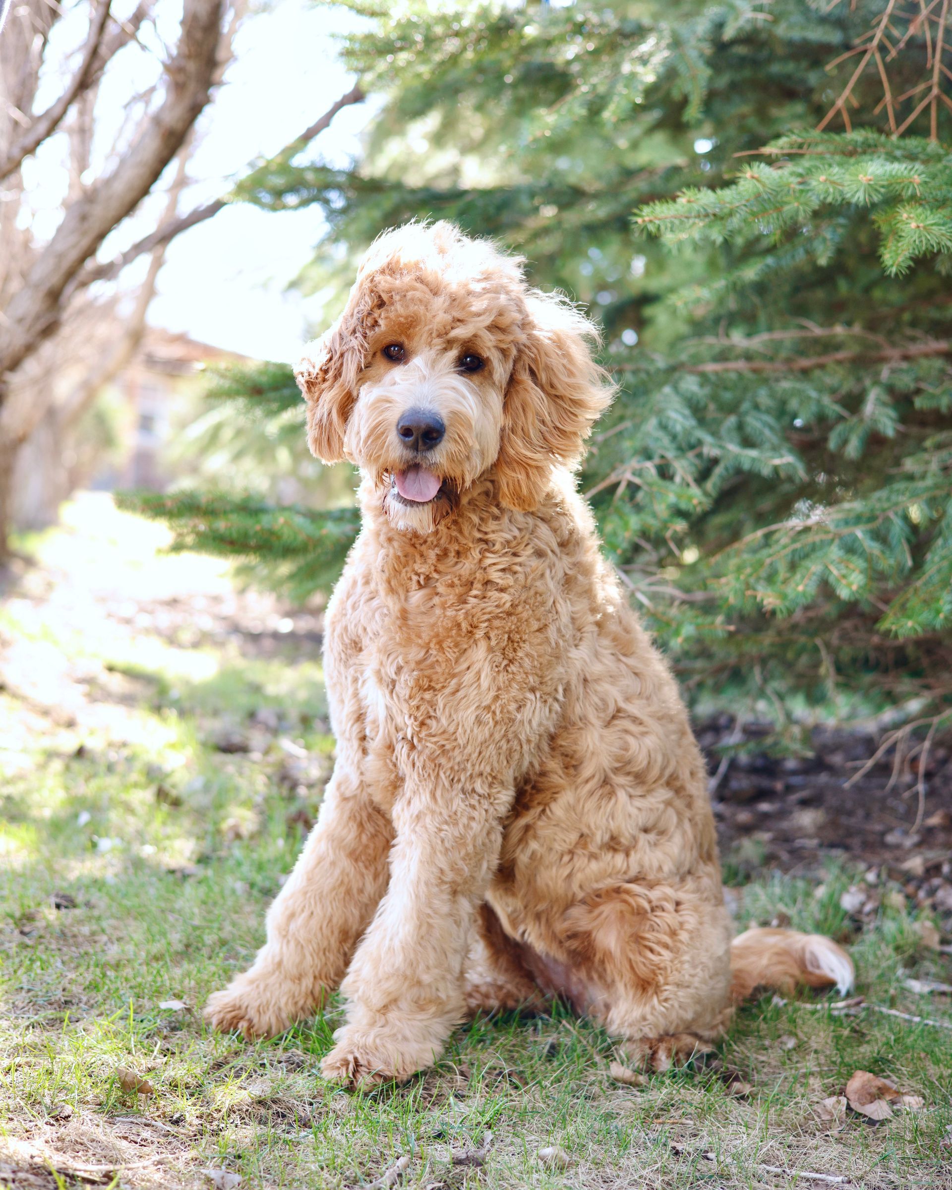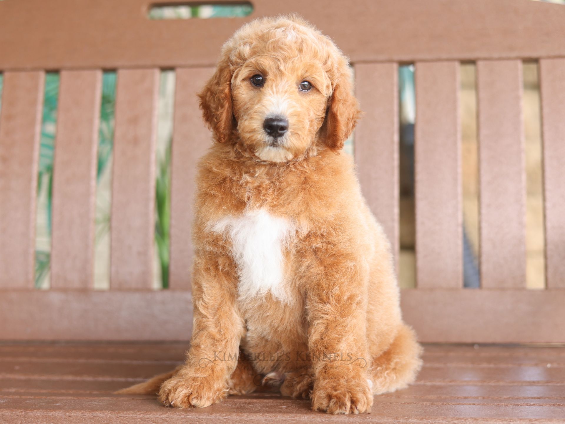 Miss Miley currently resides in a guardian home near Decorah! Miley has a puppy sister and they love to snuggle and go on walks together. Miley is soft and quiet in nature. She shows very strong human attraction and create deep bonds with her people. She is mellow and could cuddle all day. She too likes to go out and about for car rides, river days, and fun hikes. Miley has had no litters so far, but eventually may have a litter of miniature F1b englishdoodles. Miley has an athletic build with rounded features. She features an apple shaped head and shorter snout. Her round expressive eyes, big button nose, and floppy ears give her a real life doll appearance. Miley is 65 pounds. Her coat is fleecy soft with a loose wave. Miley's coat is a rich carmel color and she has a light cream patch on her snout, chest, and tail. Miley was born here at Kimberlee's kennels and raised in a home environment. She is from our previous Pearl and Klaus litter. Pearl is an AKC english-cream retriever while Klaus is an AKC standard poodle. Both of Miley's parents are now retired and live in wonderful pet homes. Miley comes from a long lineage of well breed, beautiful, healthy, and family-friendly tempered dogs.