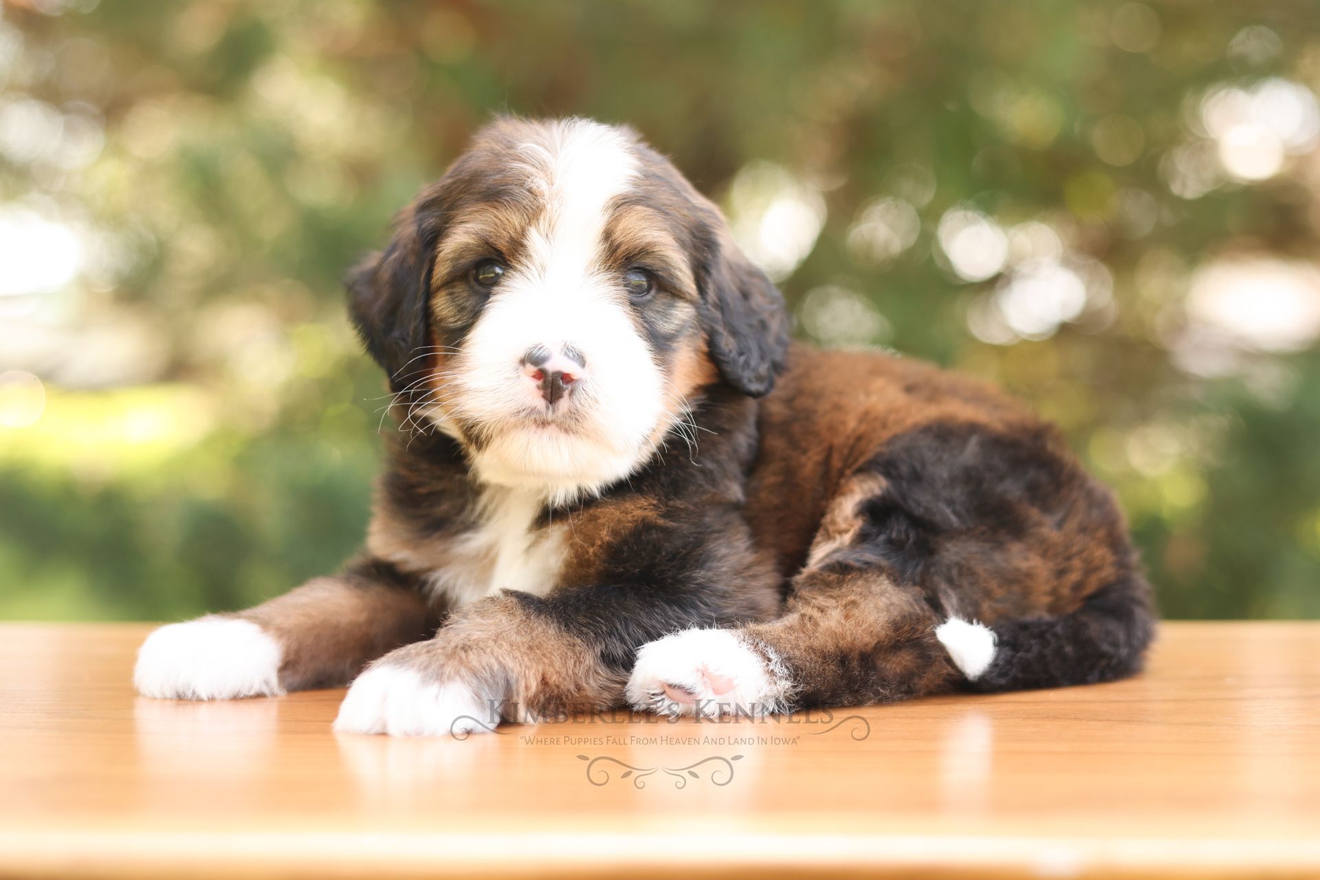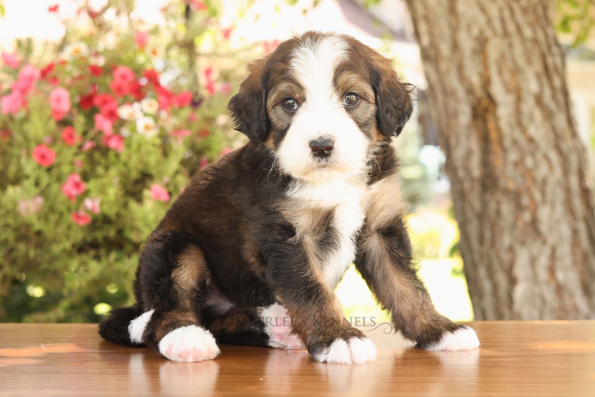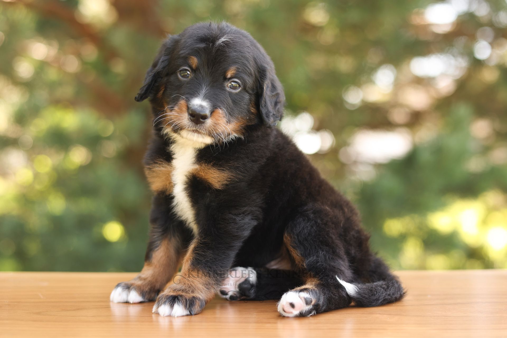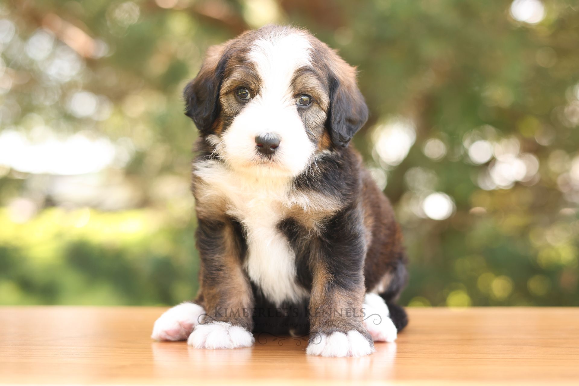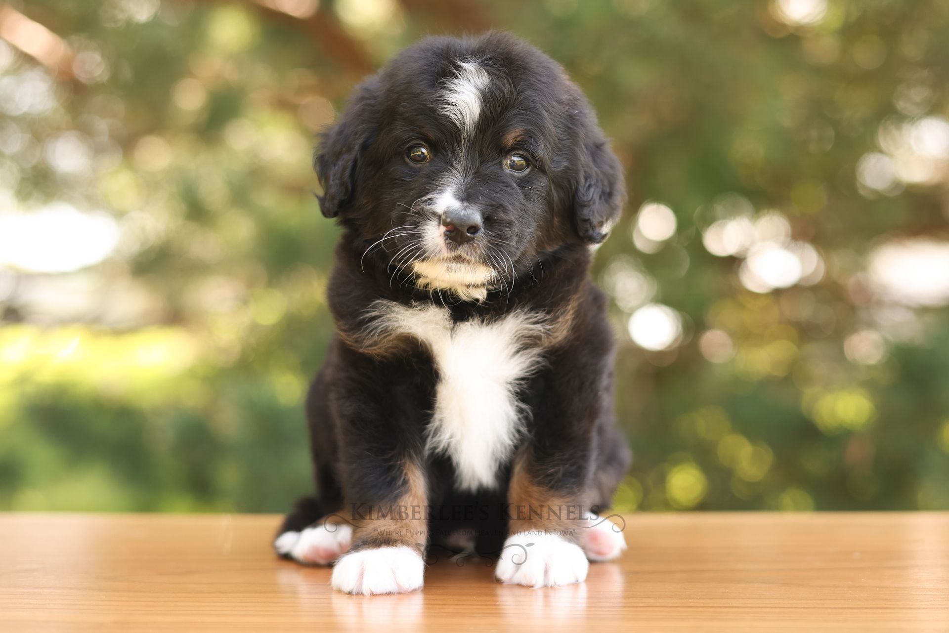 Mocha is the perfect blend of playful, active, and affectionate. She loves to run, romp in our creek, and play with her puppies. Mocha is a wonderful momma as her puppies are always socialized and very well cared for. Mocha was born and raised here at our kennel and stands out for her bubbly and goofy demeanor. She quickly befriends everyone she meets and has a sweet personality. Mocha has an athletic build with a straight and fluffy coat. She features beautiful brindle markings and hazel round eyes. Mocha is truly a special bernedoodles and passes down her excellent temperament to each of her puppies.