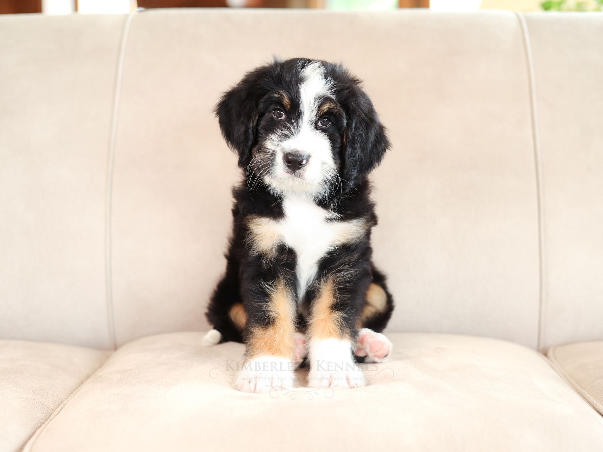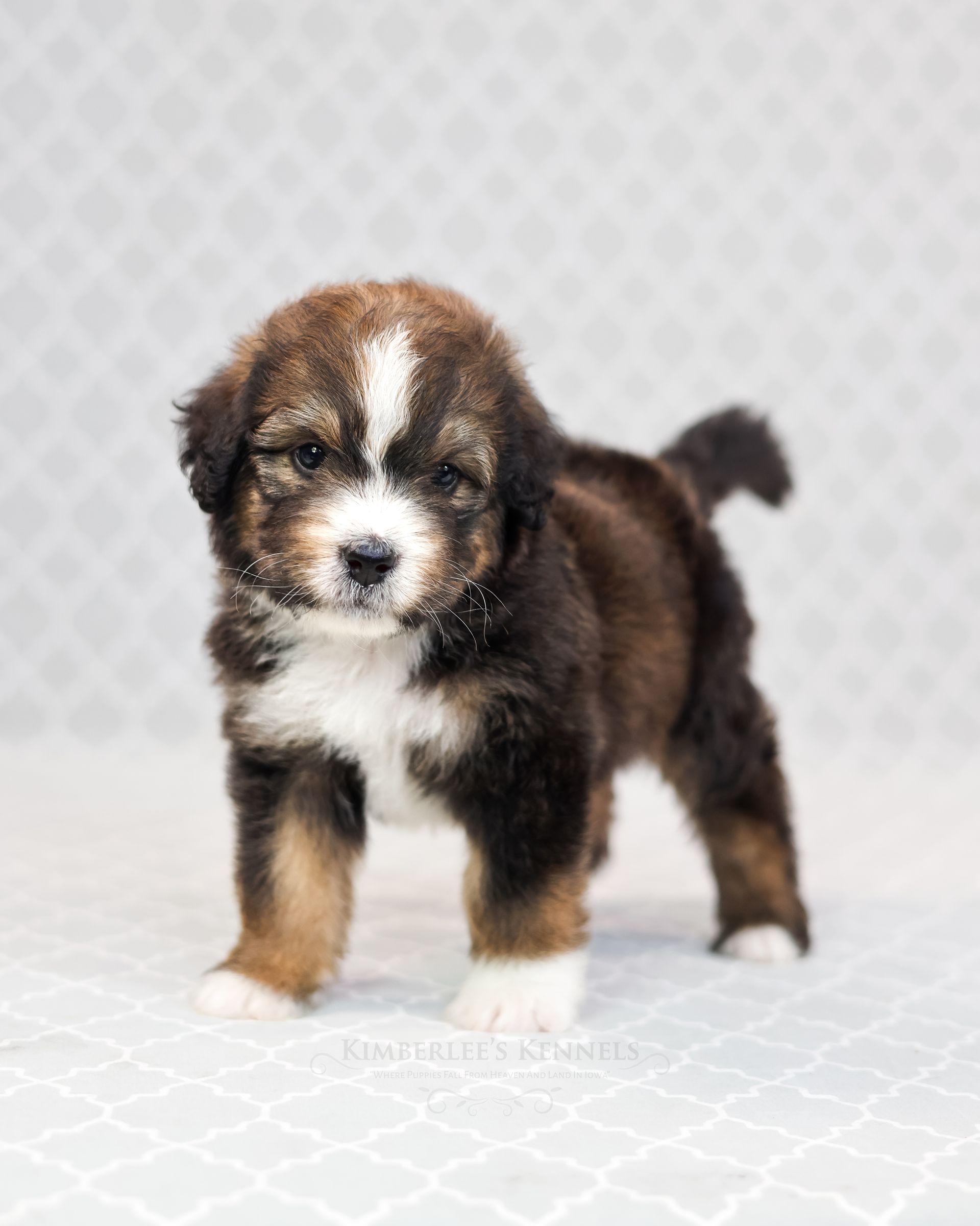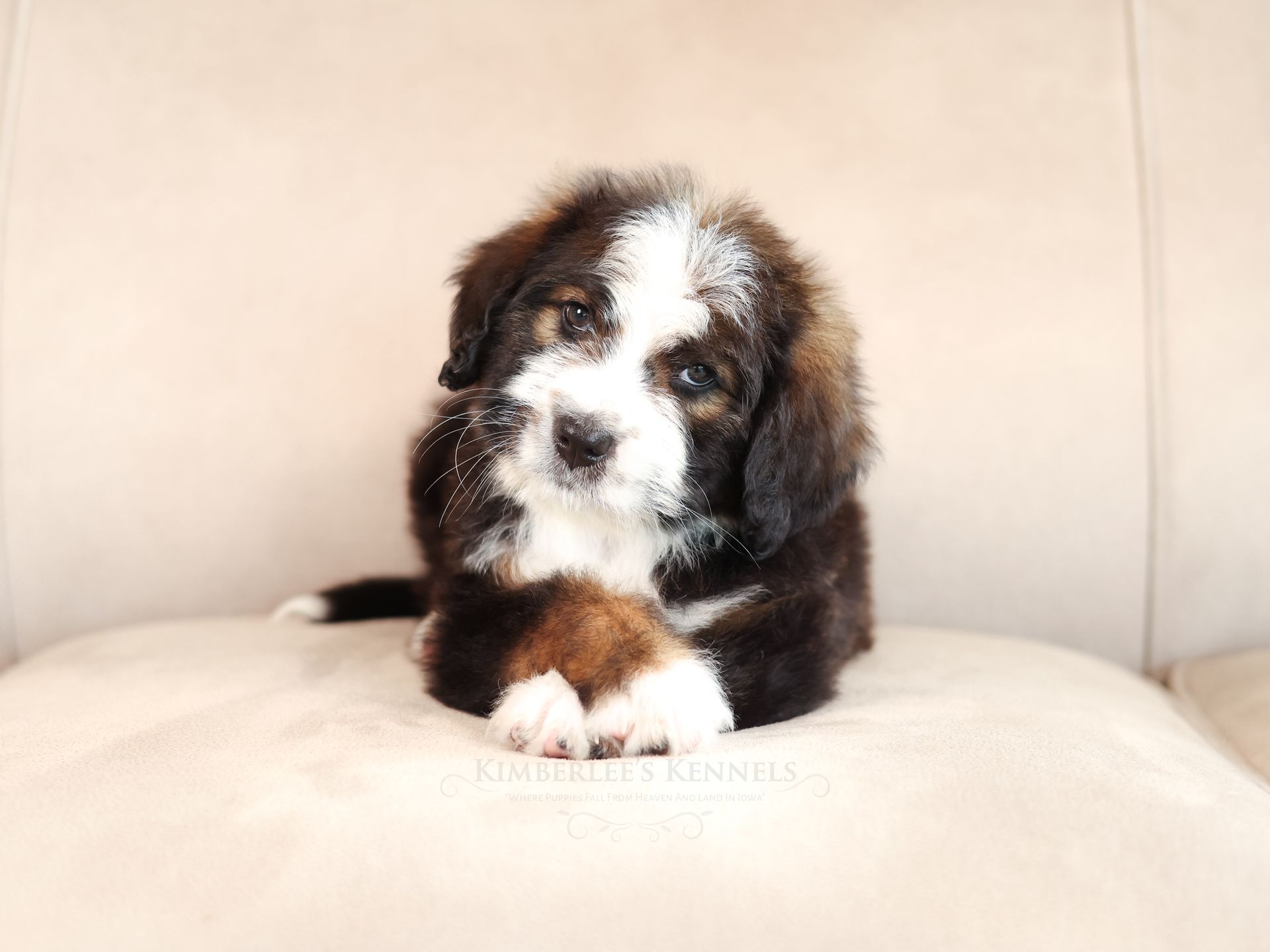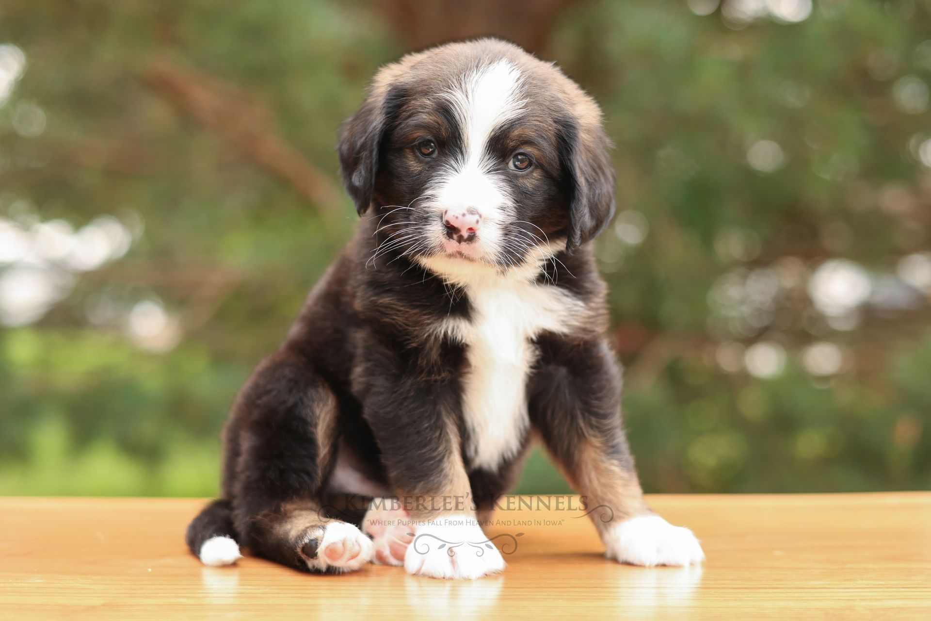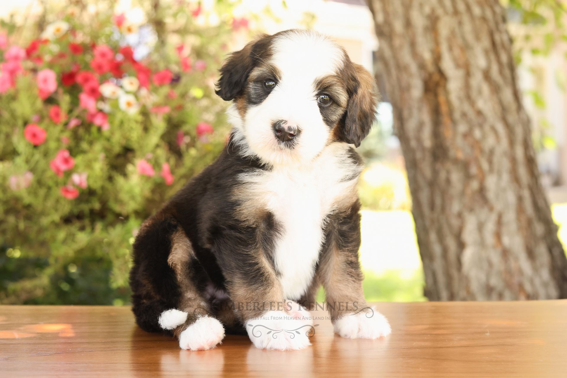 Mocha is the perfect blend of playful, active, and affectionate. She loves to run, romp in our creek, and play with her puppies. Mocha is a wonderful momma as her puppies are always socialized and very well cared for. Mocha was born and raised here at our kennel and stands out for her bubbly and goofy demeanor. She quickly befriends everyone she meets and has a sweet personality. Mocha has an athletic build with a straight and fluffy coat. She features beautiful brindle markings and hazel round eyes. Mocha is truly a special bernedoodles and passes down her excellent temperament to each of her puppies.