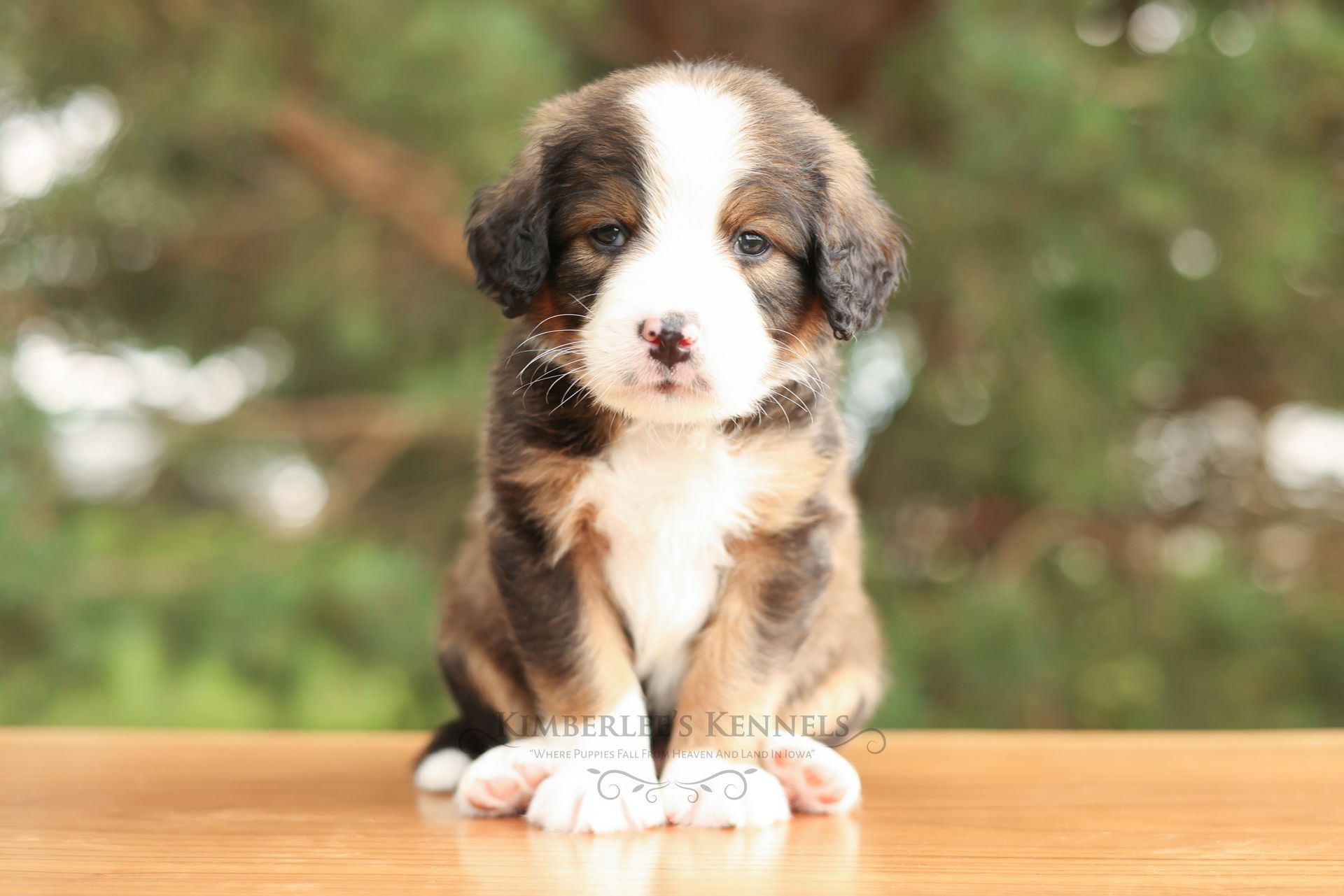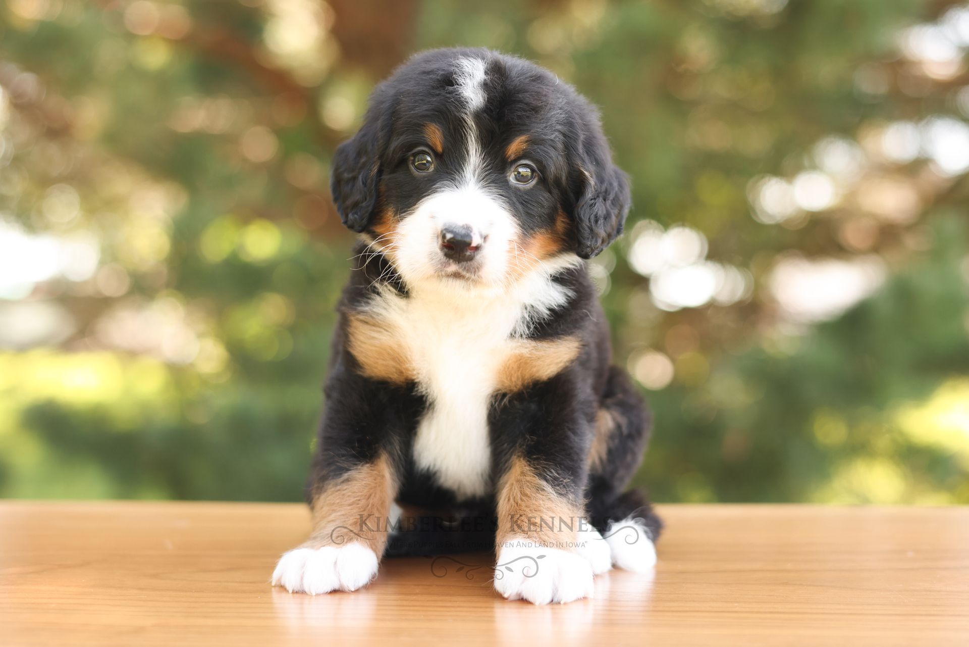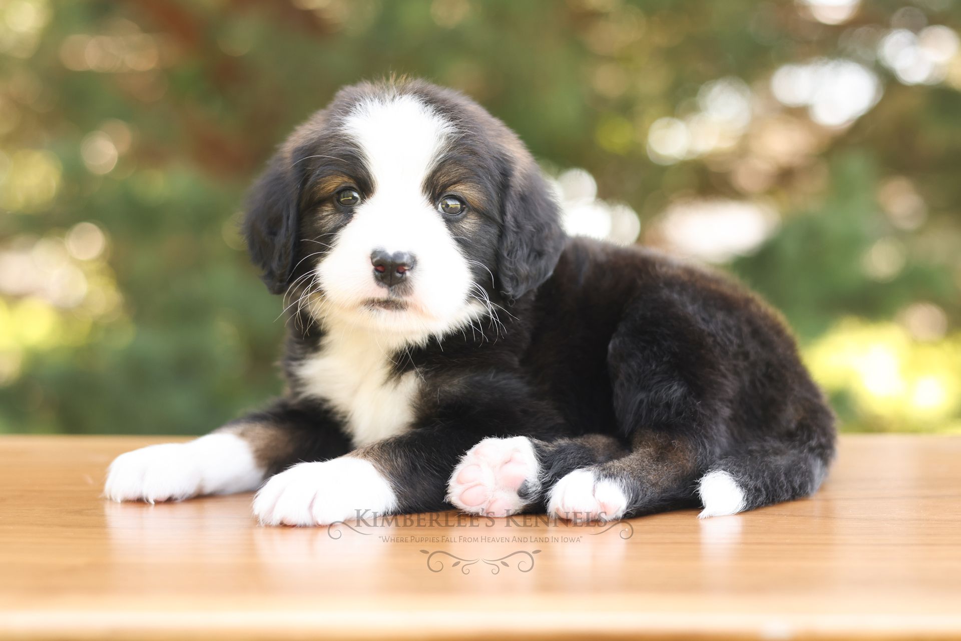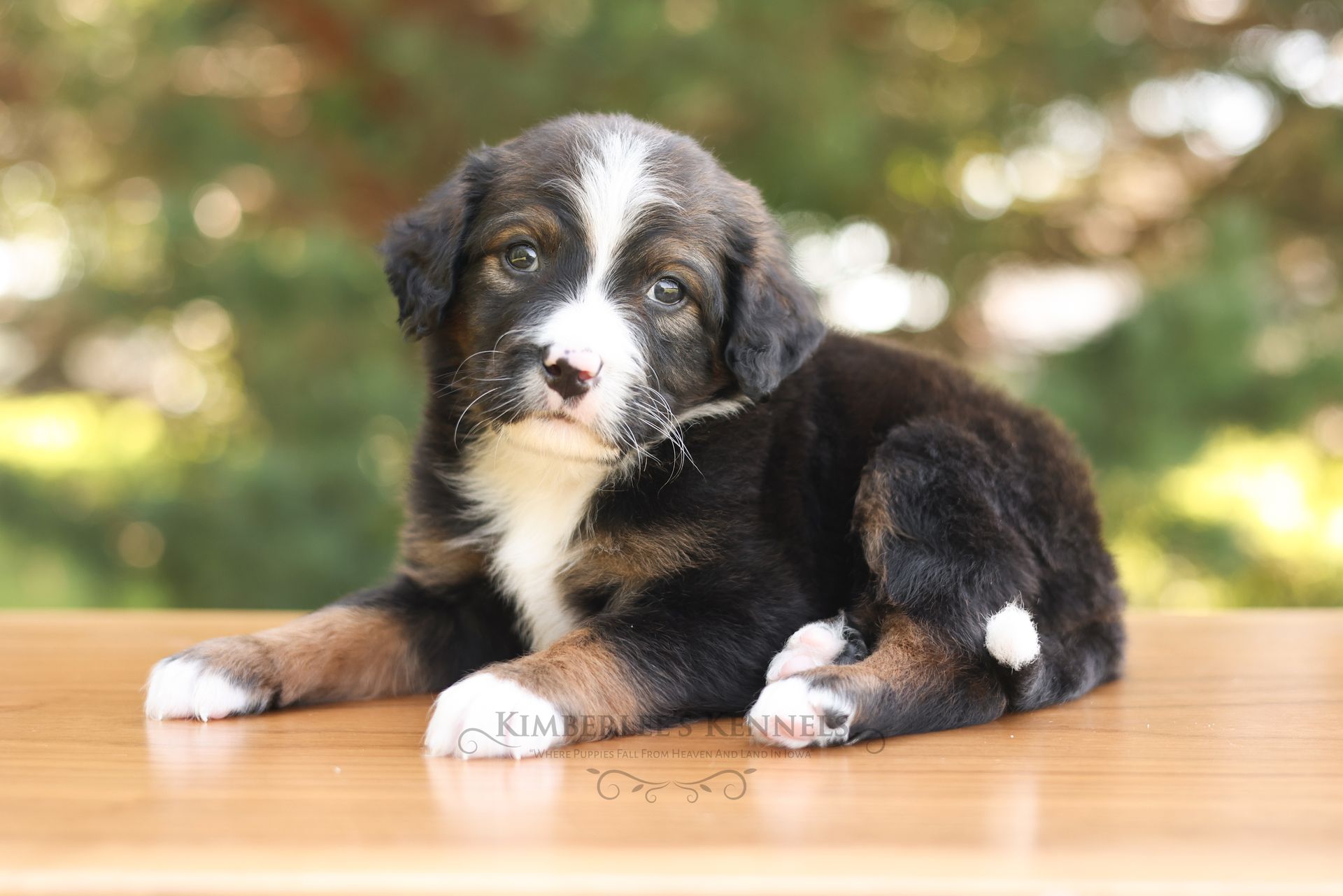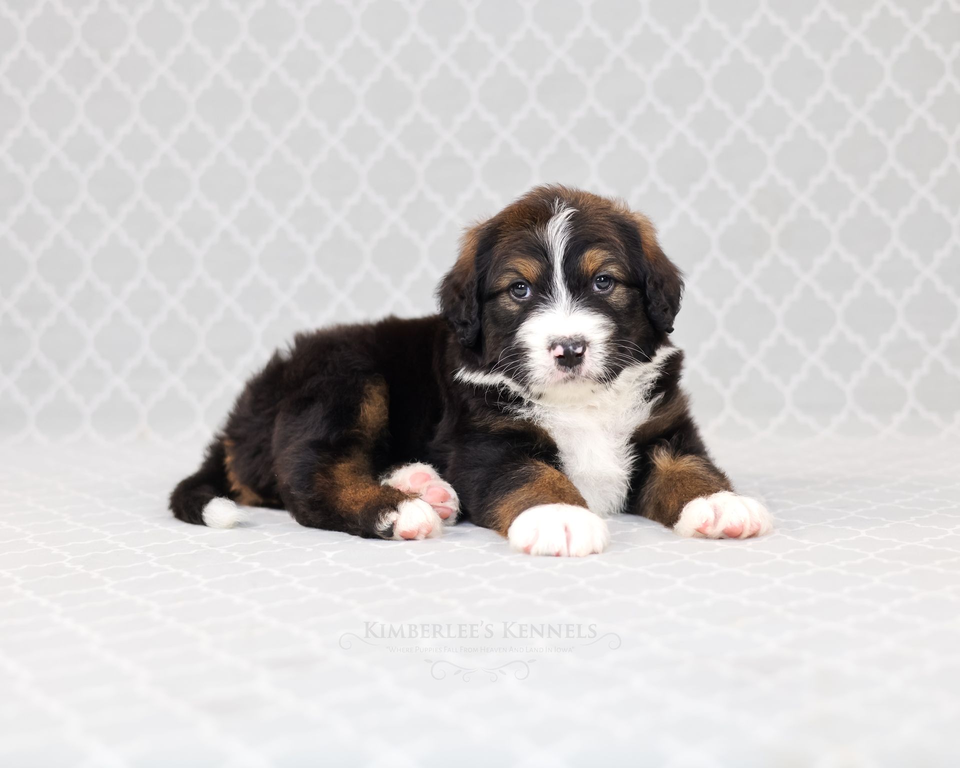 Mocha is the perfect blend of playful, active, and affectionate. She loves to run, romp in our creek, and play with her puppies. Mocha is a wonderful momma as her puppies are always socialized and very well cared for. Mocha was born and raised here at our kennel and stands out for her bubbly and goofy demeanor. She quickly befriends everyone she meets and has a sweet personality. Mocha has an athletic build with a straight and fluffy coat. She features beautiful brindle markings and hazel round eyes. Mocha is truly a special bernedoodles and passes down her excellent temperament to each of her puppies.