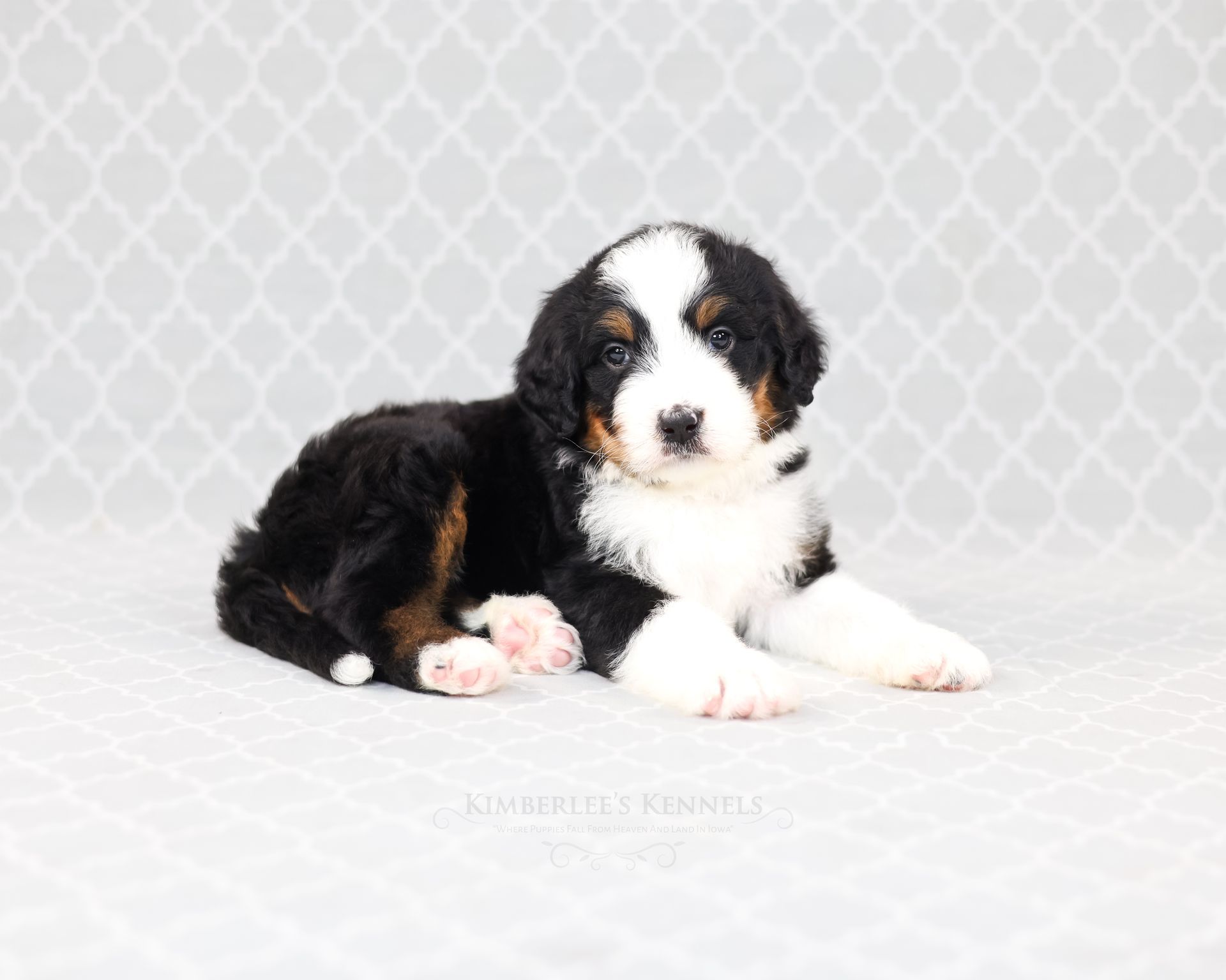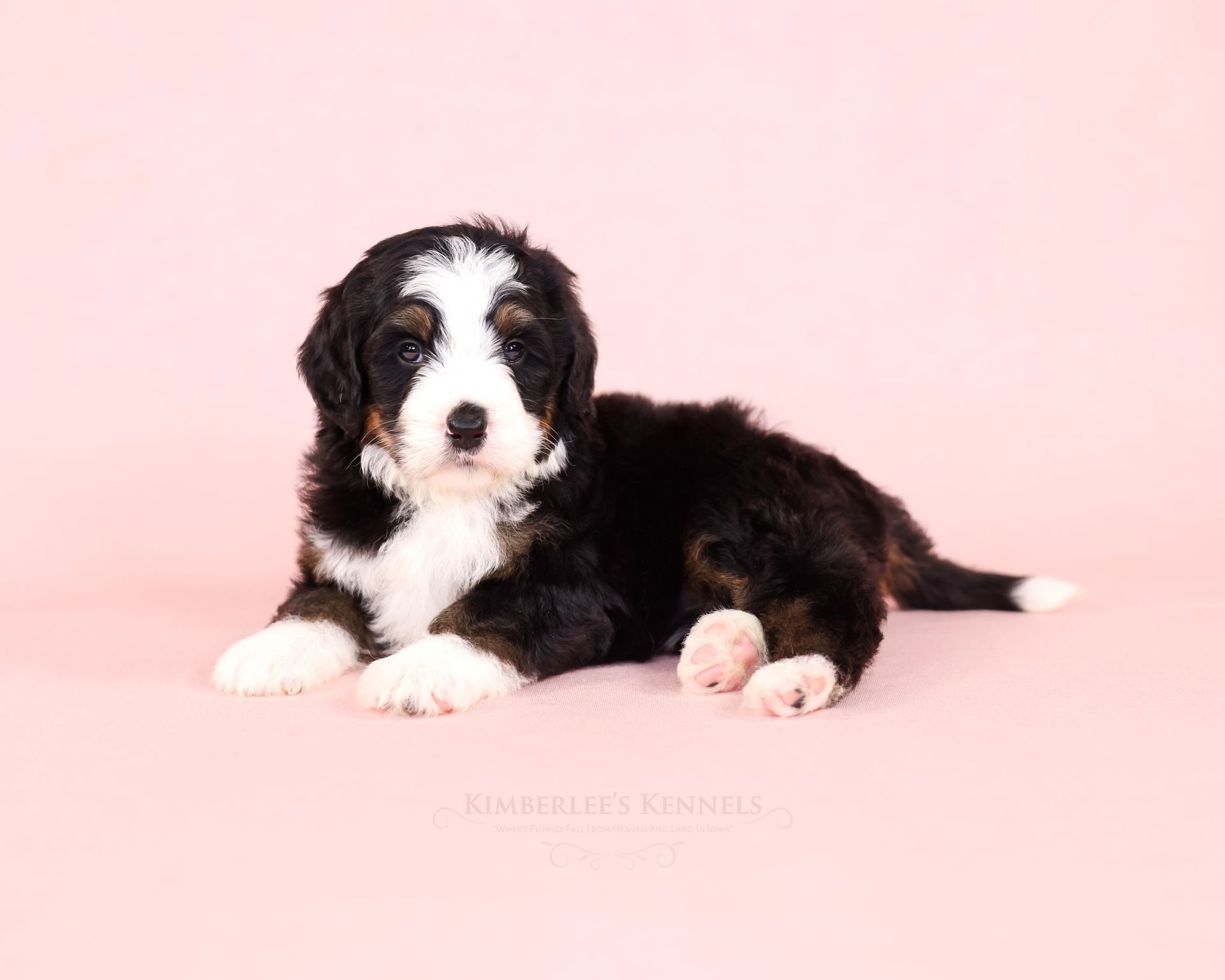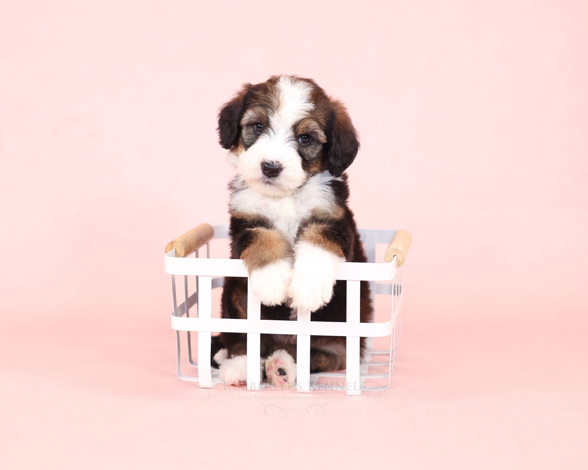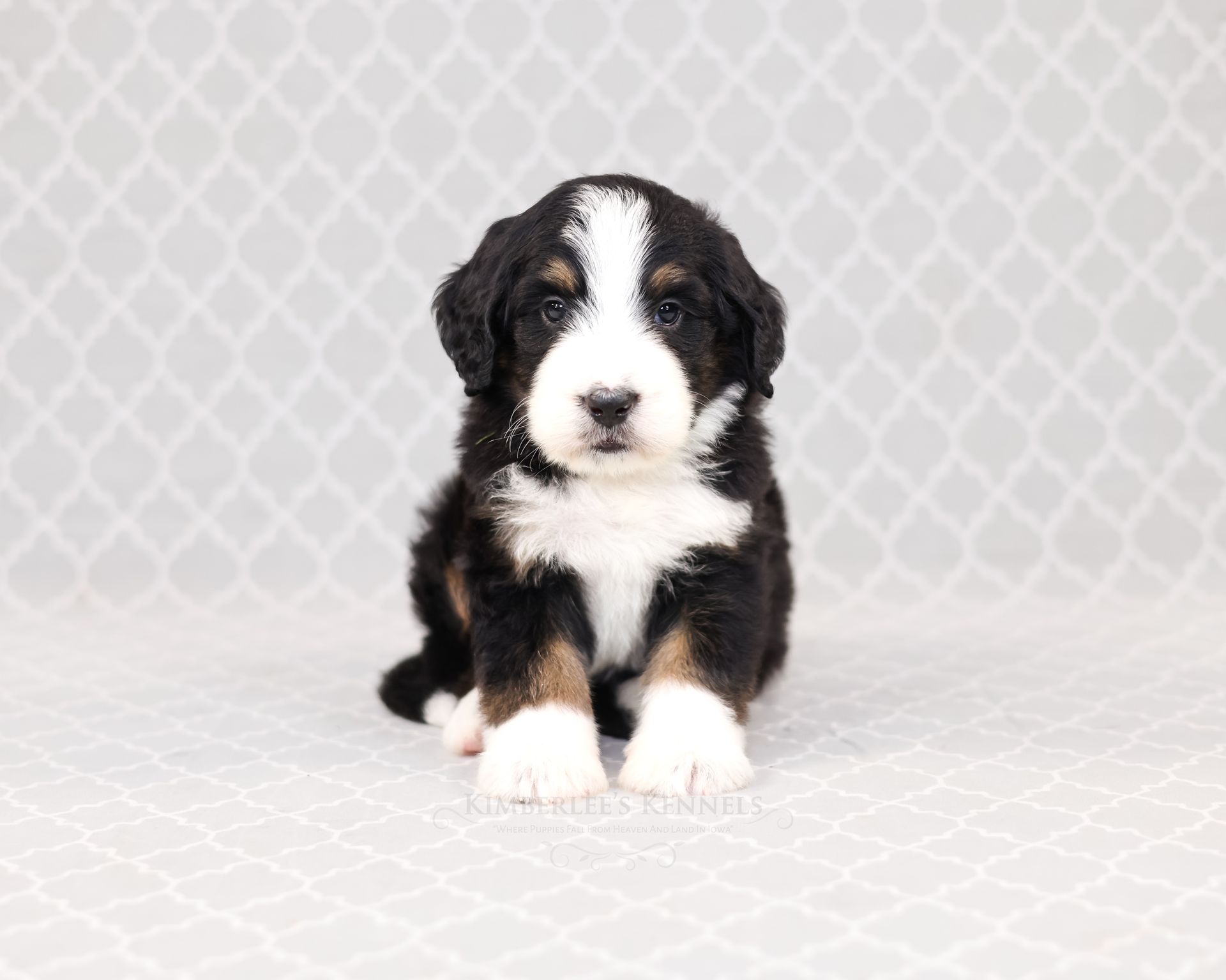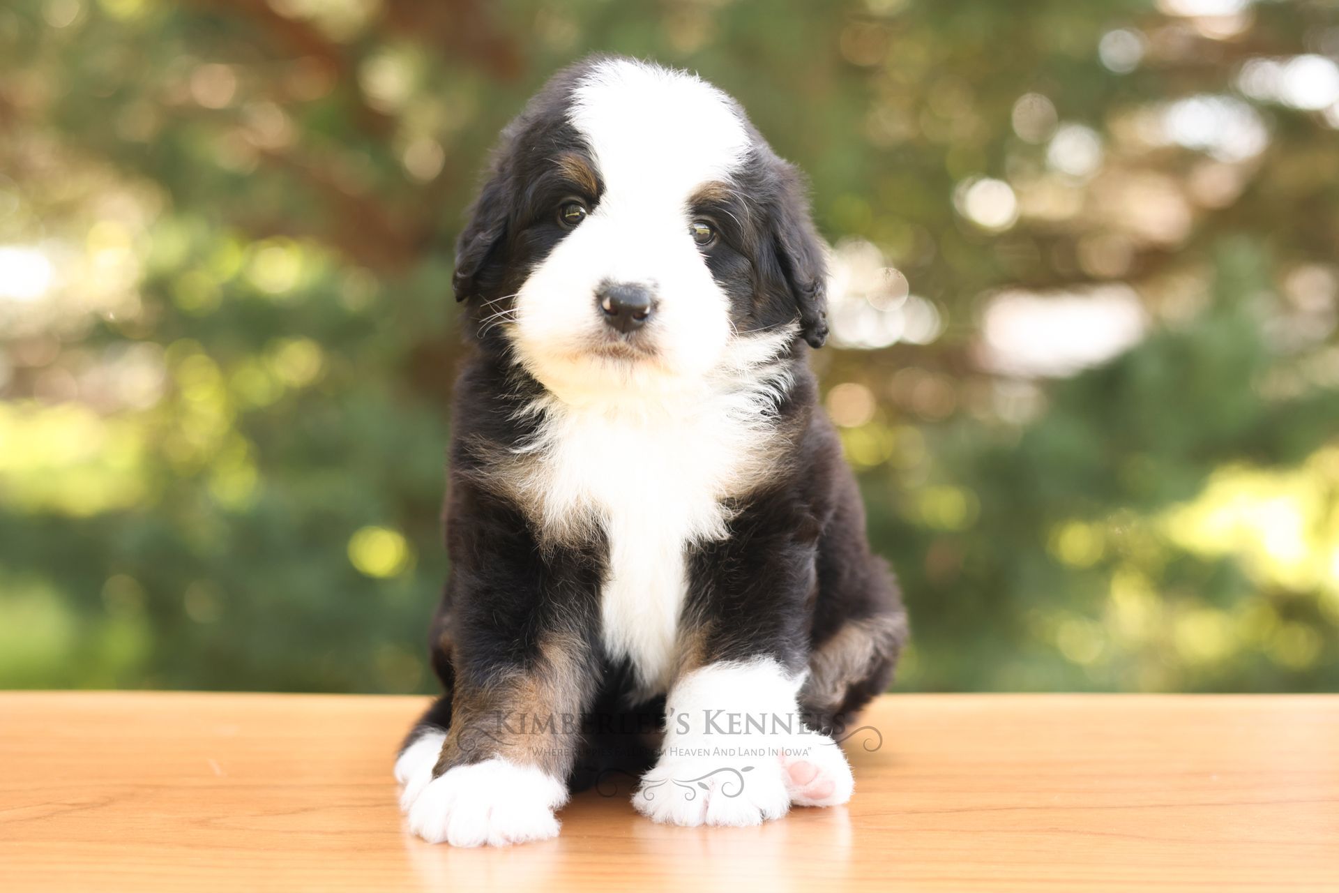 Mocha is the perfect blend of playful, active, and affectionate. She loves to run, romp in our creek, and play with her puppies. Mocha is a wonderful momma as her puppies are always socialized and very well cared for. Mocha was born and raised here at our kennel and stands out for her bubbly and goofy demeanor. She quickly befriends everyone she meets and has a sweet personality. Mocha has an athletic build with a straight and fluffy coat. She features beautiful brindle markings and hazel round eyes. Mocha is truly a special bernedoodles and passes down her excellent temperament to each of her puppies.