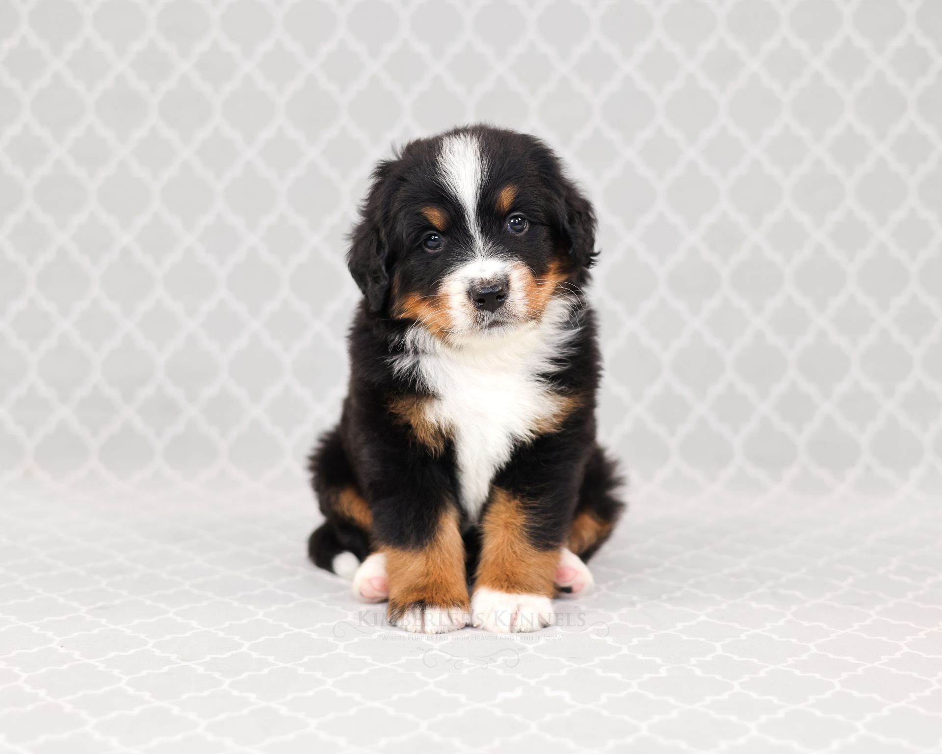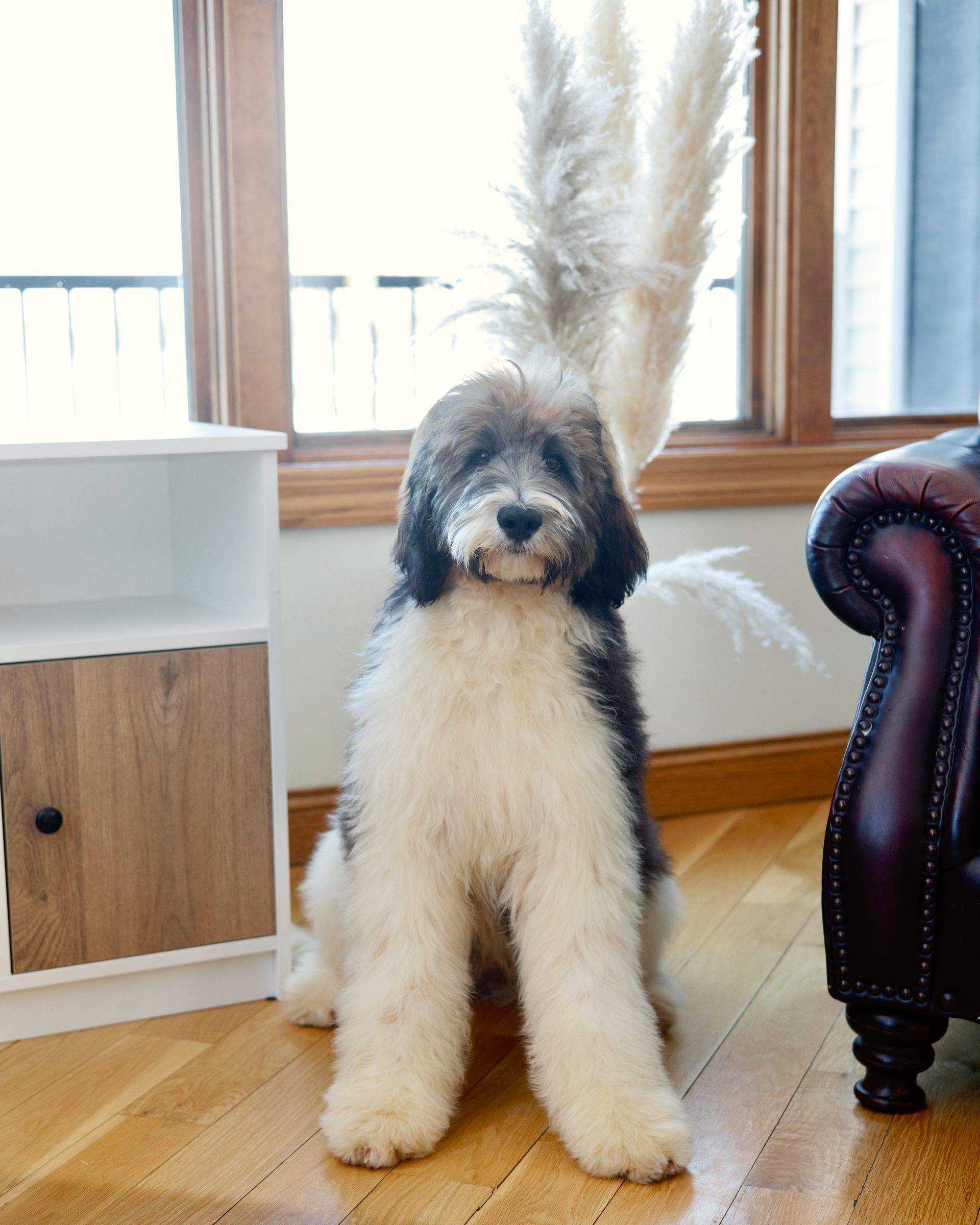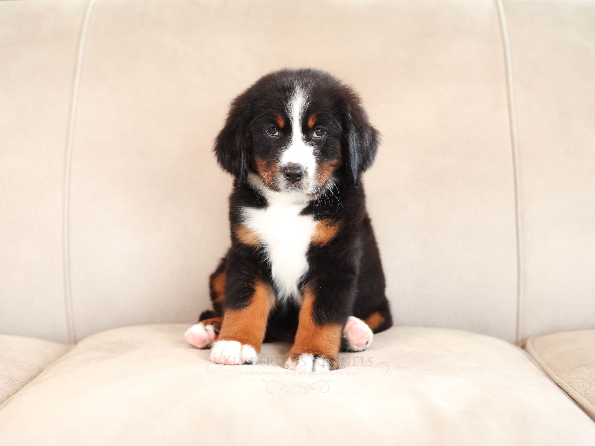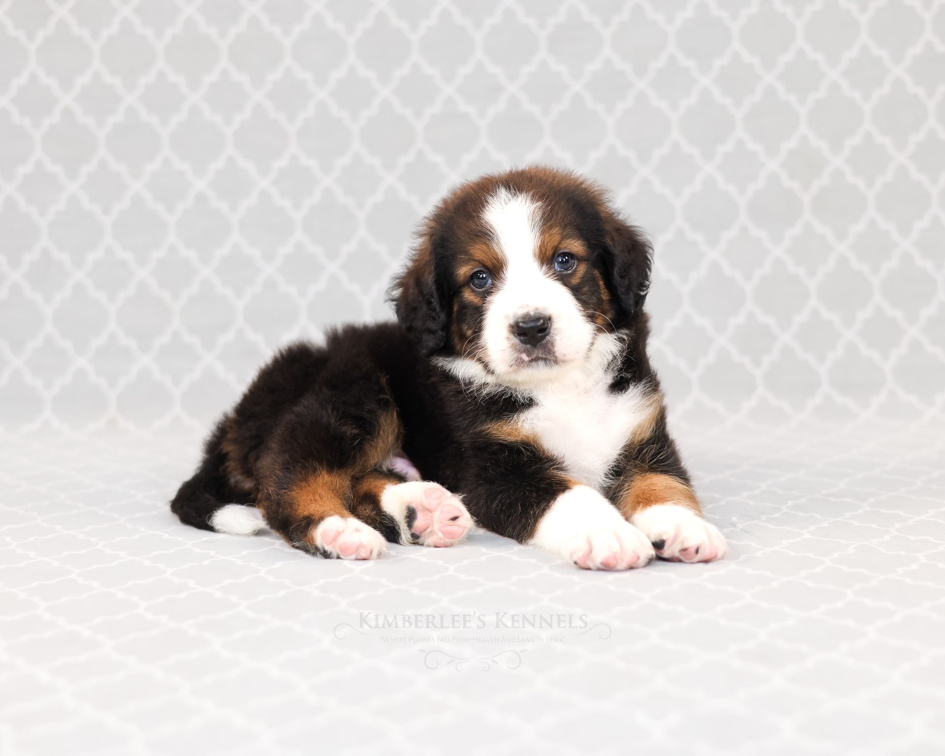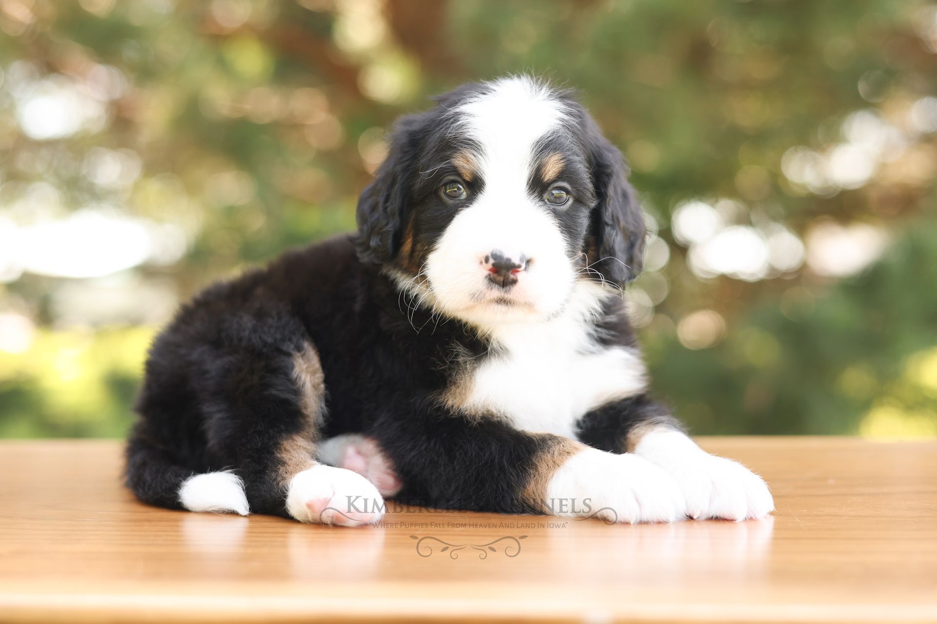 Mocha is the perfect blend of playful, active, and affectionate. She loves to run, romp in our creek, and play with her puppies. Mocha is a wonderful momma as her puppies are always socialized and very well cared for. Mocha was born and raised here at our kennel and stands out for her bubbly and goofy demeanor. She quickly befriends everyone she meets and has a sweet personality. Mocha has an athletic build with a straight and fluffy coat. She features beautiful brindle markings and hazel round eyes. Mocha is truly a special bernedoodles and passes down her excellent temperament to each of her puppies.