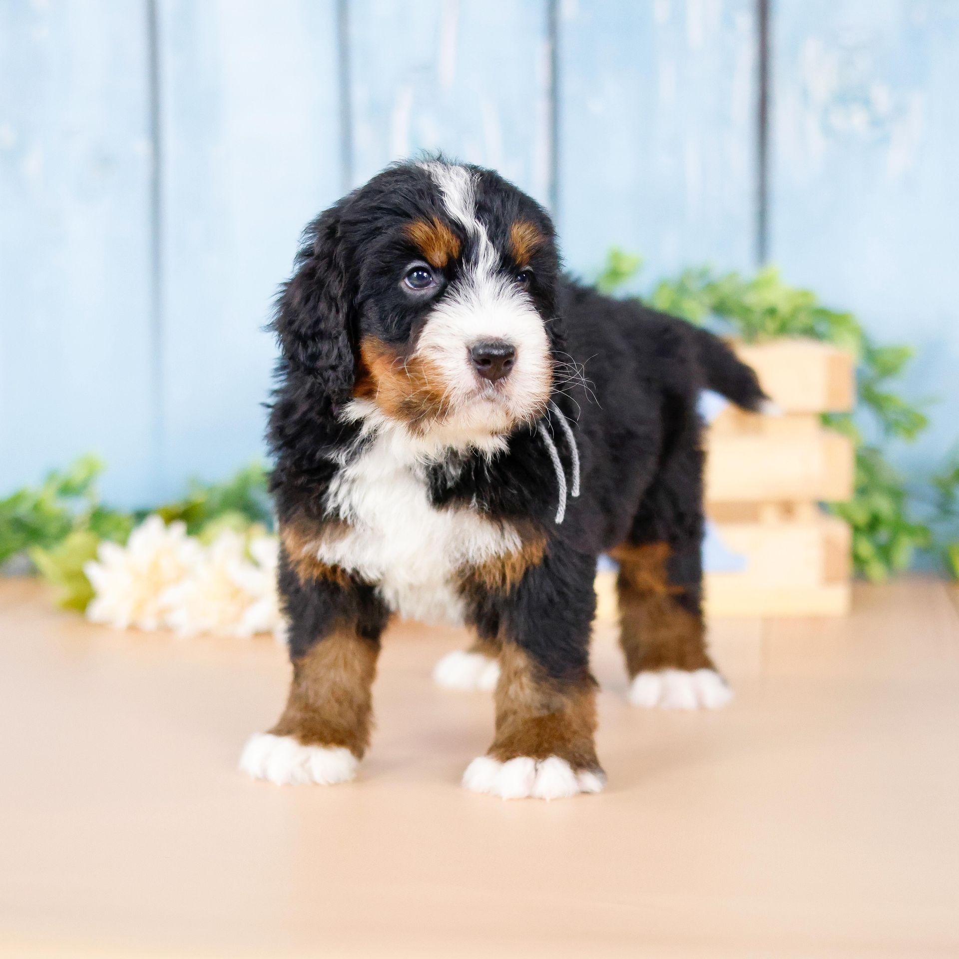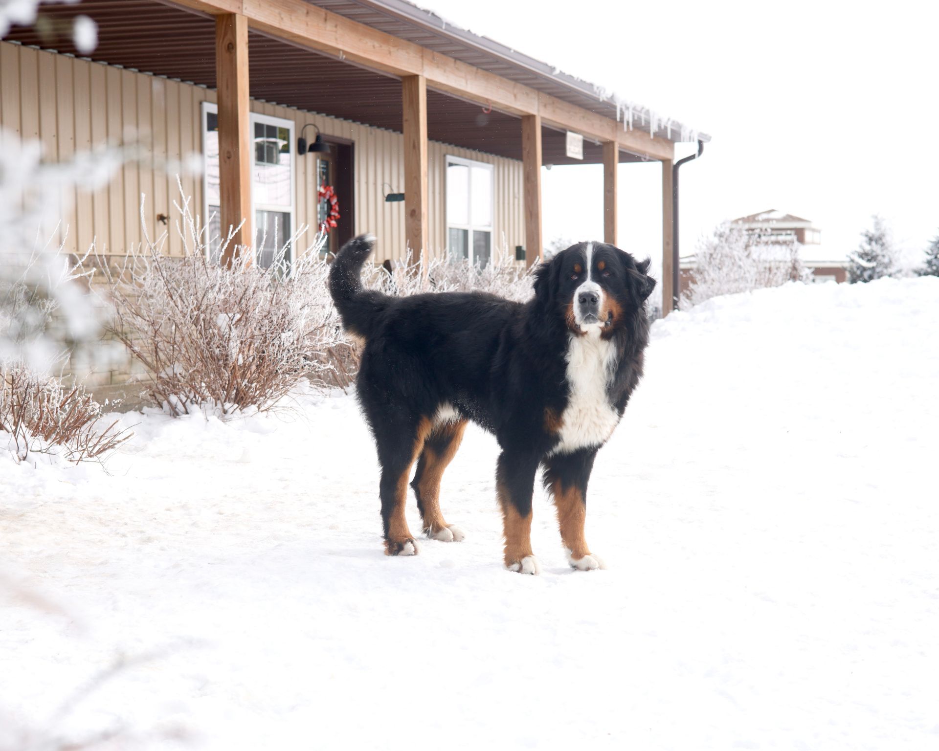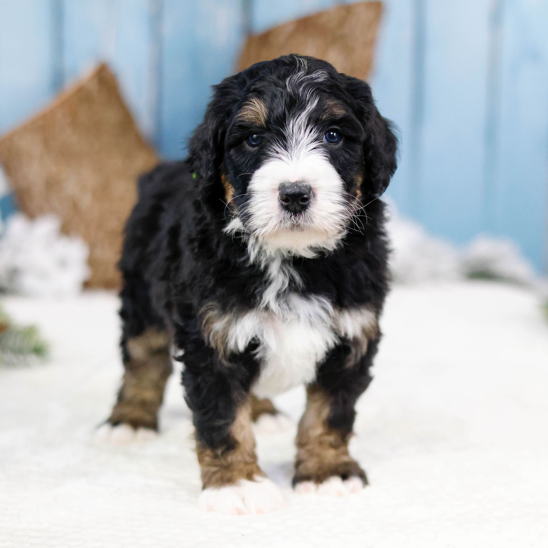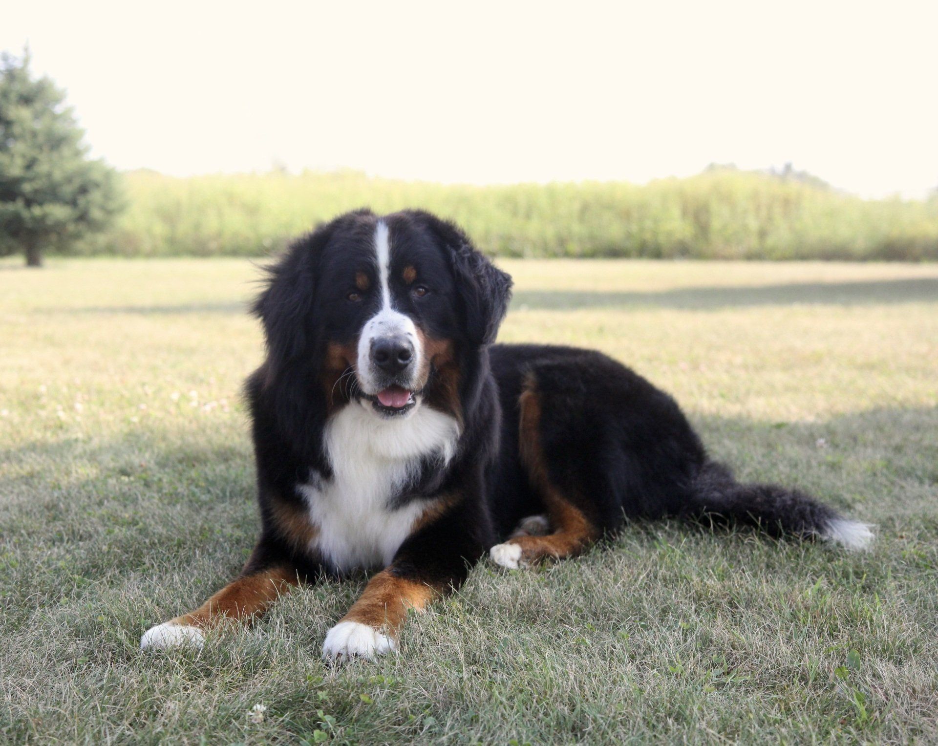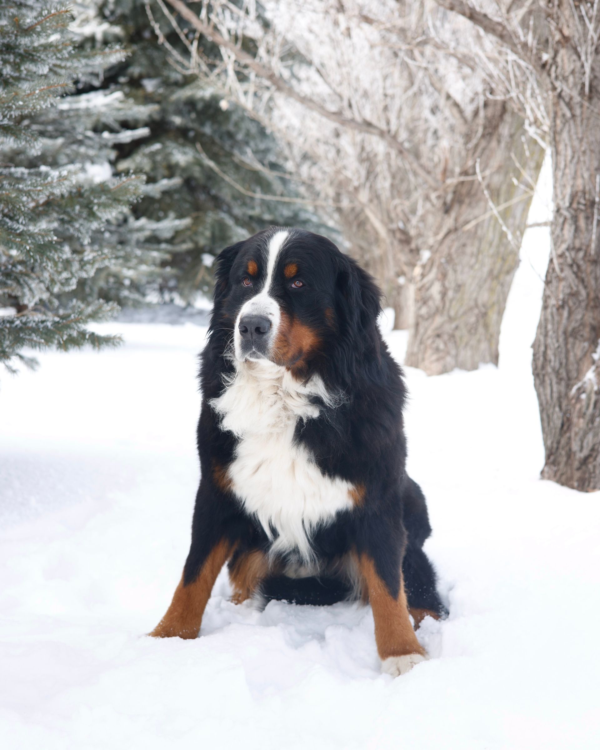 Rogue is our top stud for our standard bernedoodle line. He is husky and stocky. He is a well behaved, quiet-natured, loving and one loyal Bernese mountain dog. He weighs 100 pounds and 50% of that is his big heart! Innocence in his eyes, yet majestic in stature. His calming demeanor is part of his overall charm. He is one of Grant's favorite dogs and he has been spoiled rotten. He enjoys his days roaming our farm and he is one of the first dogs that may greet you upon arrival. You will not be disappointed if you want a large standard bernedoodle as he produces greatness. He is a carrier for DM, but when bred to a female that is all clear, he will not pass the disease unto his offspring.