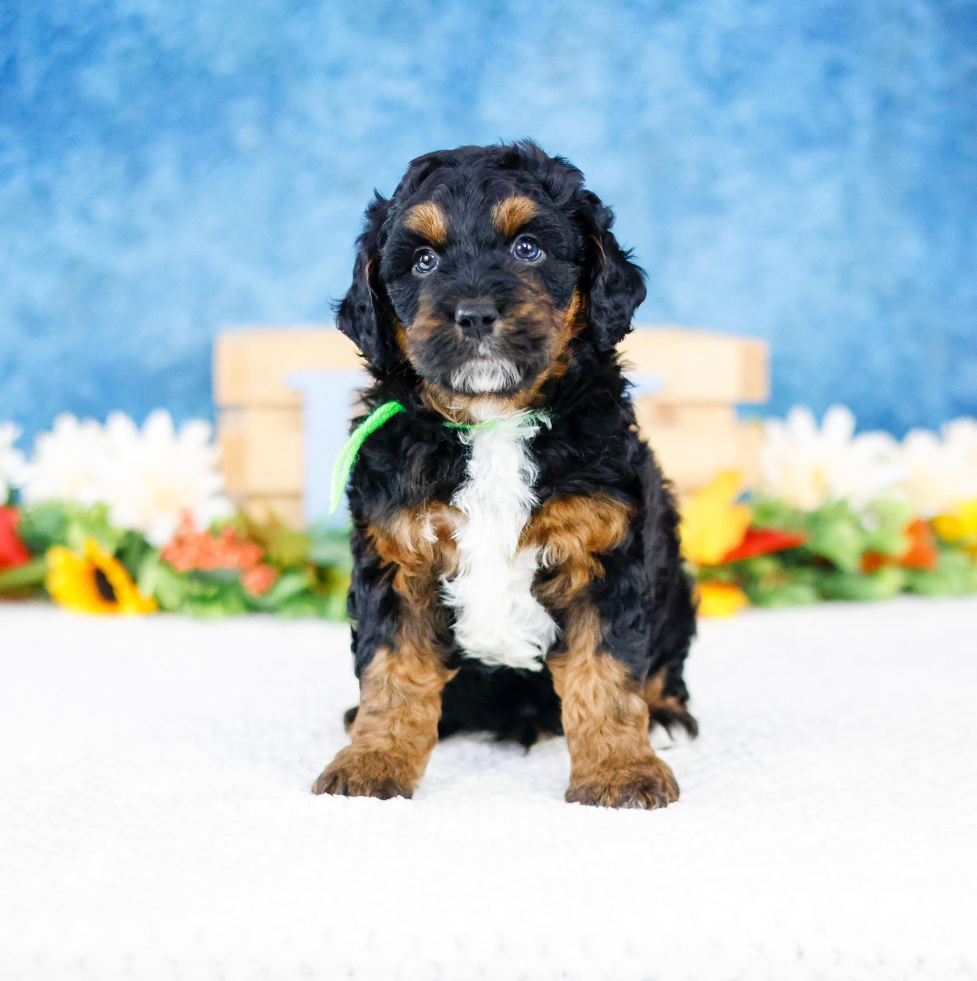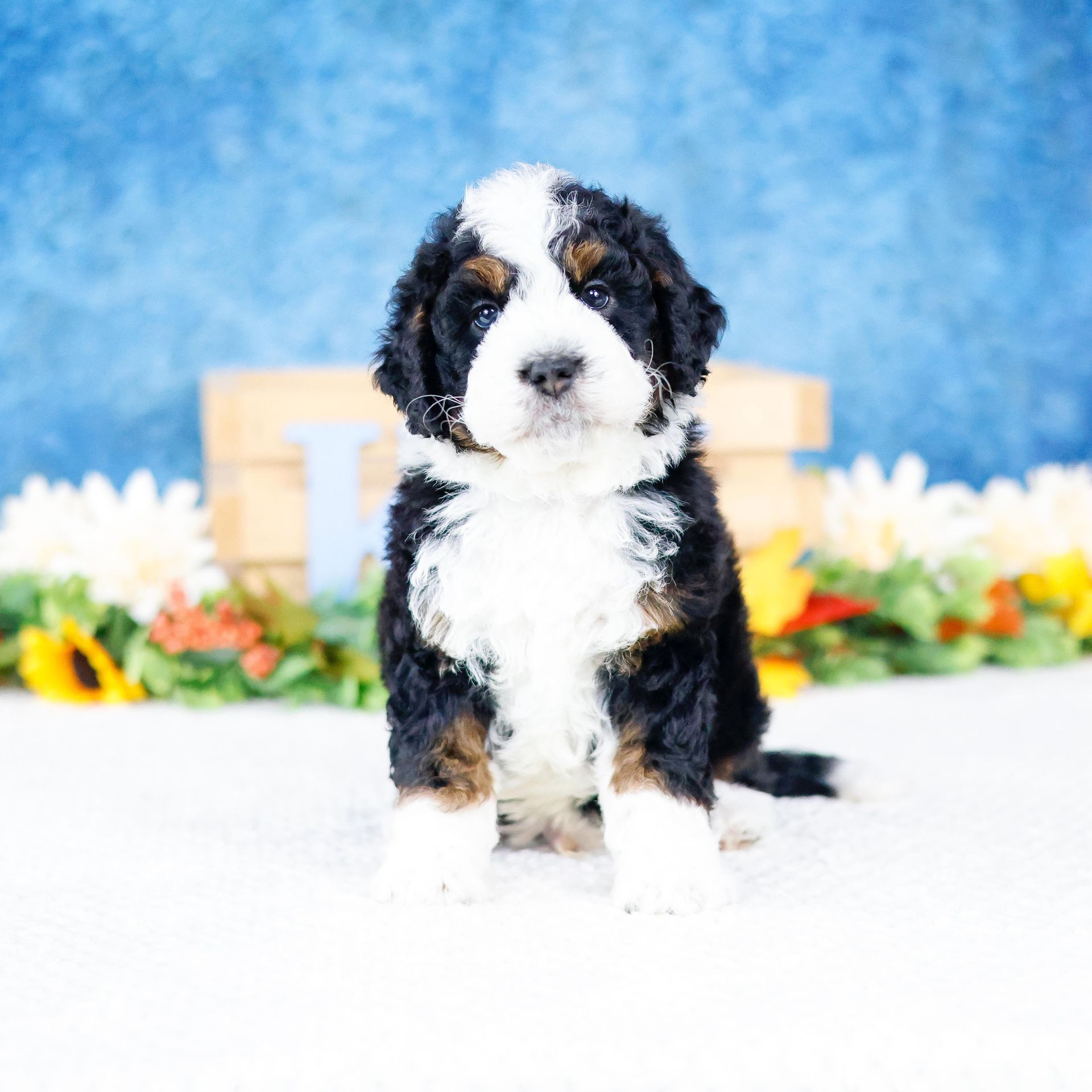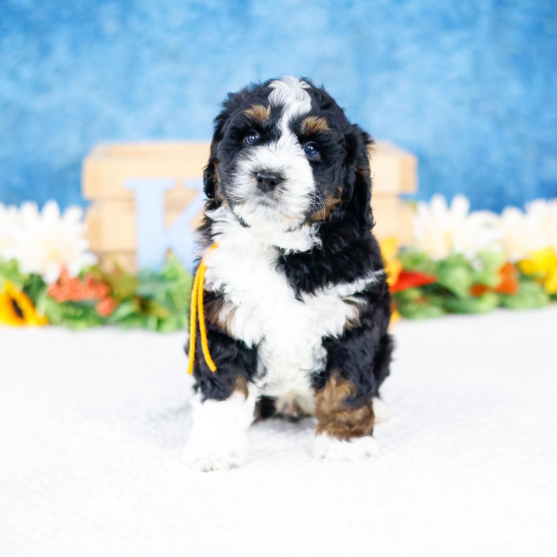 Nurturing Neveah is everything you could dream of in a bernedoodle and more! She has a beautiful tri-colored coat and a loyal loving personality to match. You can seem the sweetness in Neveah's endearing eyes. Neveah has light copper eyebrows along with light copper marbled onto her stockings. Her round white snout and long ears add to her cartoon looks. She's a big and shaggy real life teddy bear at 88 pounds! Neveah is a social butterfly as she will happily greet everyone she meets with kisses. She loves interacting in activities such as fetch or simply romping around outdoors. In the fall she loves to hop through the crisp leafs getting fresh air. Neveah radiates a warm and inviting energy that is hard to beat. She simply loves everyone from children to other dogs and wants to be everyones best friend. When it comes to her puppies Neveah is obsessed! She is so delicate and carful around them, always making sure they are safe and happy. Her puppies tend to have the same excellent temperament their wonderful momma Neveah has! Miss Neveah was born and raised here at Kimberlee’s Kennels from our previous Farrah and Rogue litter. Neveah comes from a long lineage of well breed, beautiful, healthy, and family-friendly tempered dogs.