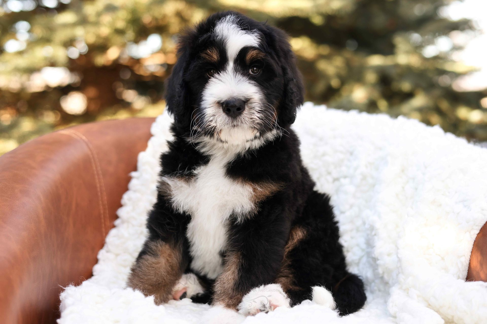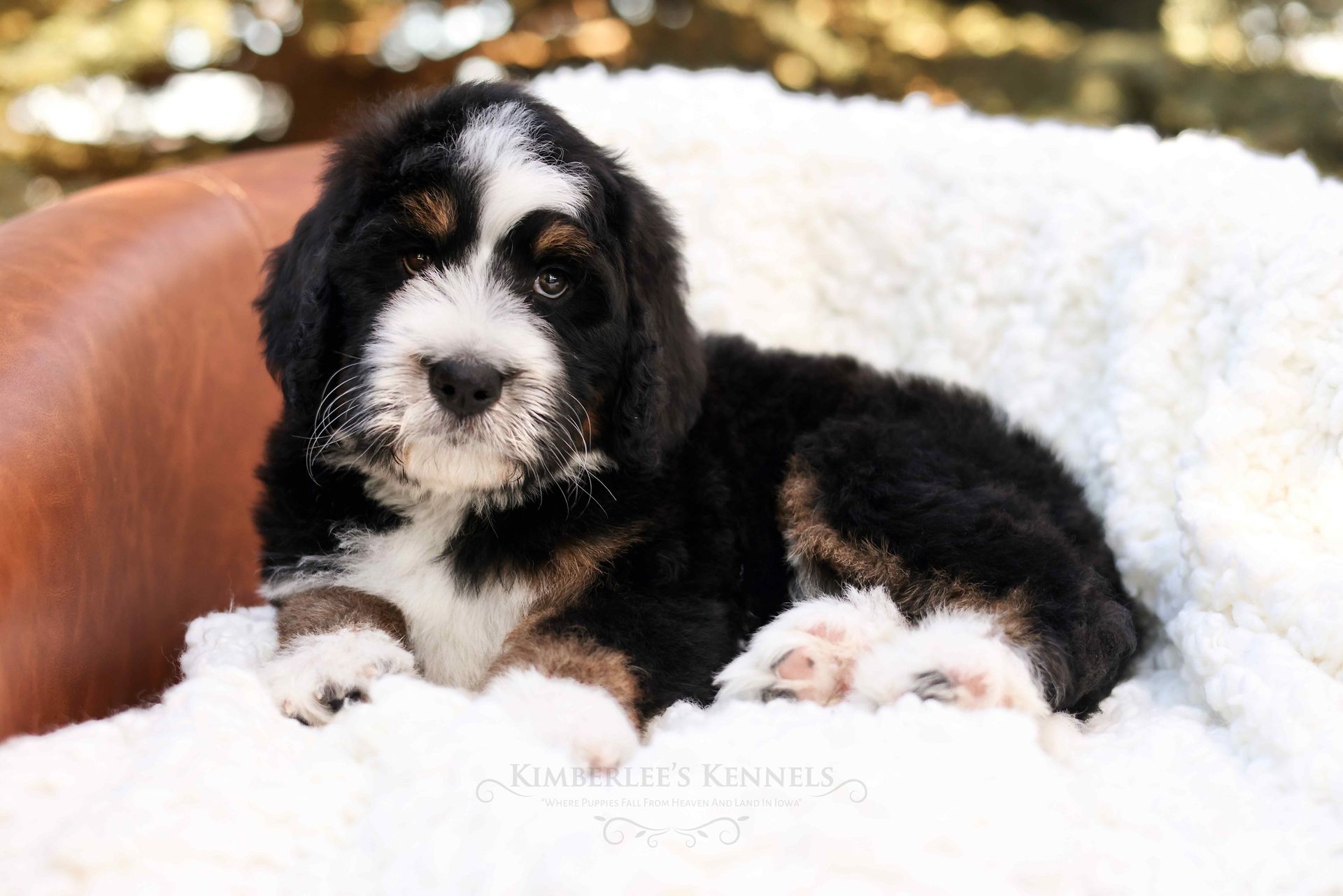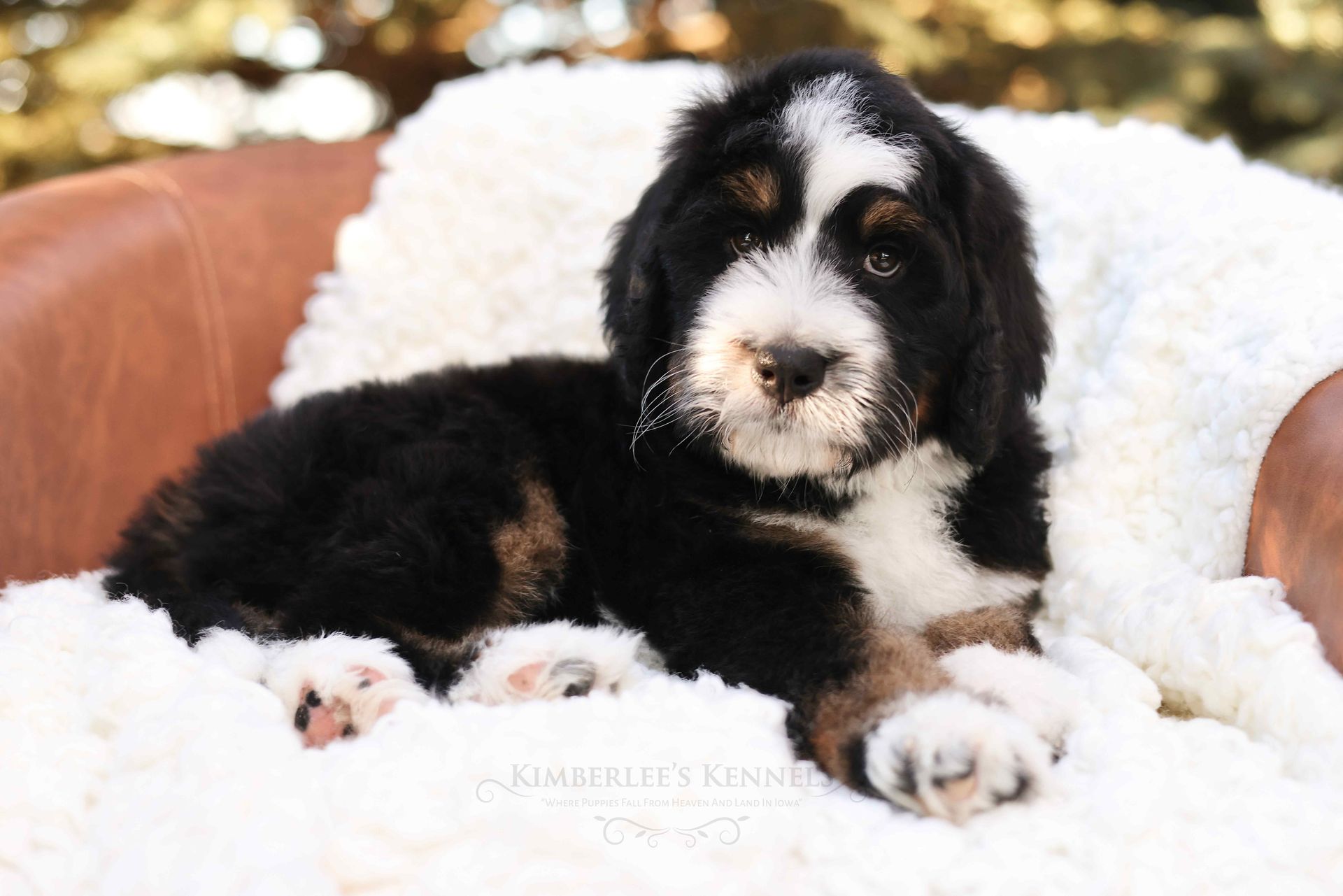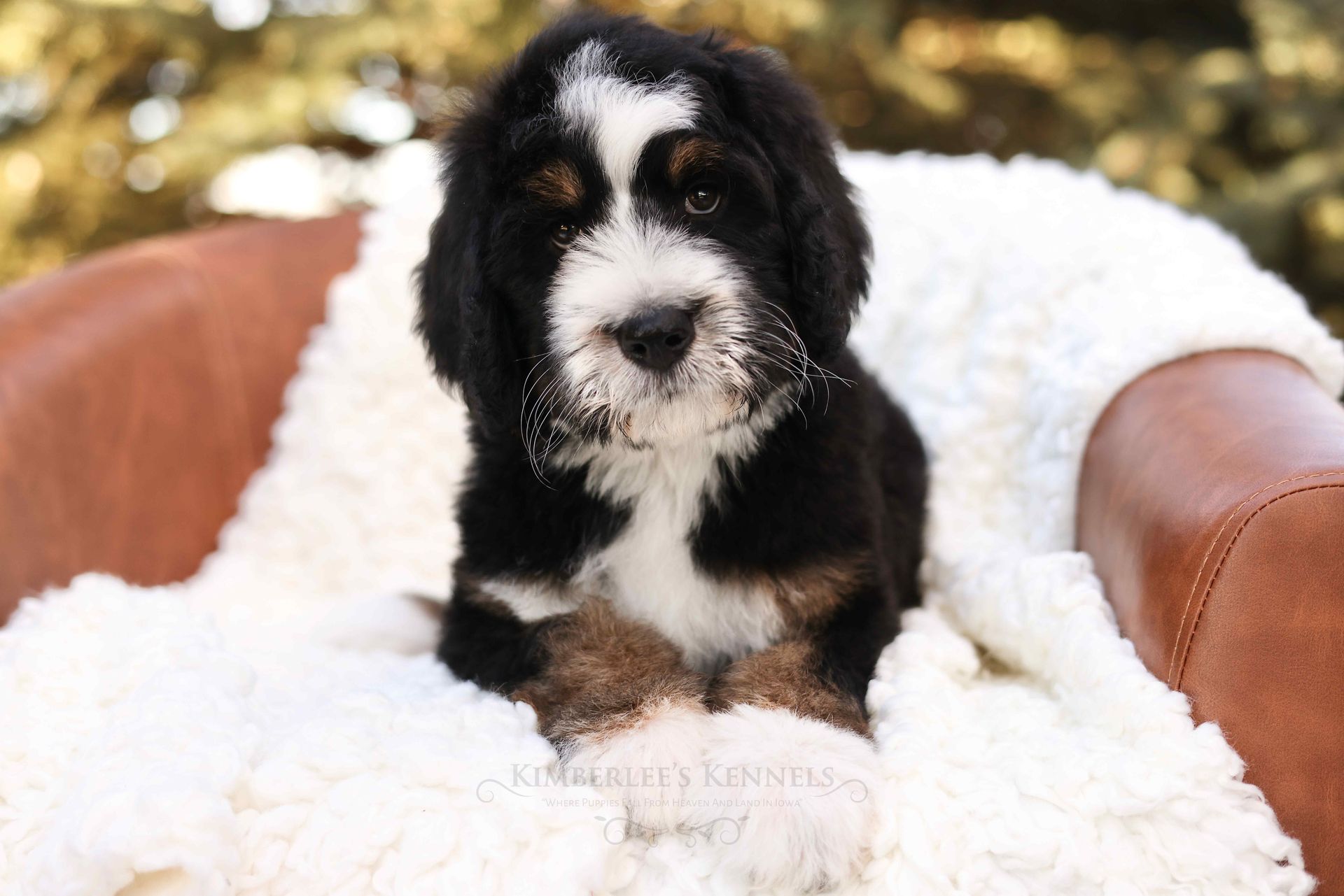 A standard bernedoodle is a cross between a standard poodle and a Bernese mountain dog. They are offered here primarily as F1s, but we can also produce F1bs. Berendoodles have been rapidly gaining popularity for their out of this world adorable appearance complimenting their loyal, childlike personalities. Bernedoodles make high quality family pets, good with children and other dogs. They are highly trainable and very intelligent. Poodles are in the top four breeds when it comes to intelligence. Poodles also have longer lifespans and are a healthy breed and not prone to cancer. Bernese mountain dogs are laid back, affectionate, and overall good natured. Breeding these two magnificent breeds together gives you a puppy that simply needs a light touch for training as they are both intelligent and sensitive. Being positive and patient in training is very important. Once trust and loyalty are established, you will have a life long companion. Bernedoodles create unbreakable bonds with their owners with a strong sense of loyalty. They are easy going, gentle, affectionate and always appear to be smiling, not just in their smile, but also in their eyes. They have classic "big, puppy, dog eyes." Bernedoodles also have that “teddybear look" that is a deeply desired trait that we all adore. Their husky and blocky builds create a real, live, shaggy teddy bear look. Bernedoodles can be hypoallergenic to minimal shedding. They offer uniqueness in coat, with their tricolored, bi-colored, or tri-parti markings. Here at Kimberlee's Kennels we offer F1's which is a 50-50 cross or F1b's which is a 75-25 cross. We recommend an F1b puppy for any family with allergy concerns as they have more poodle. Standards are between 23 and 29 inches and between 70 and 90 pounds. Life expectancy for a standard bernedoodle is 12+ years. If your family is considering a bernedoodle from your next companion, please send us a message today!