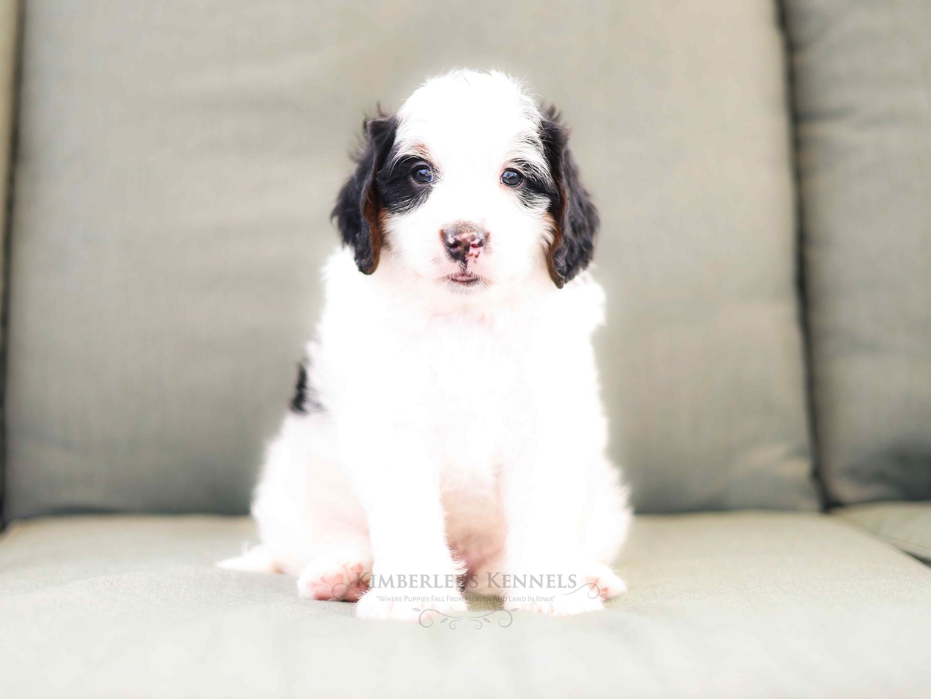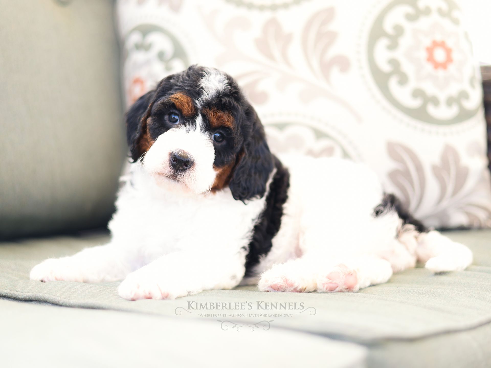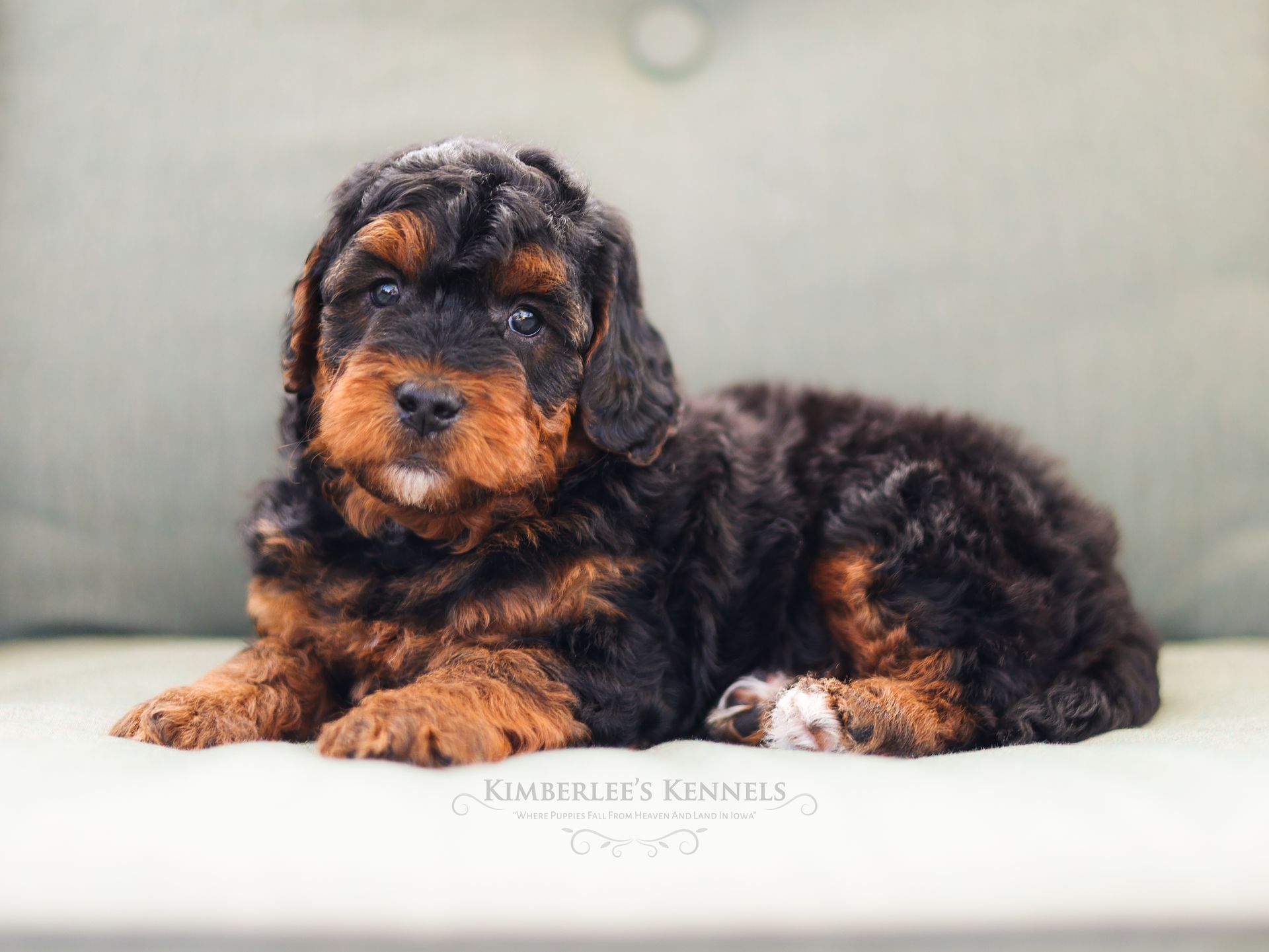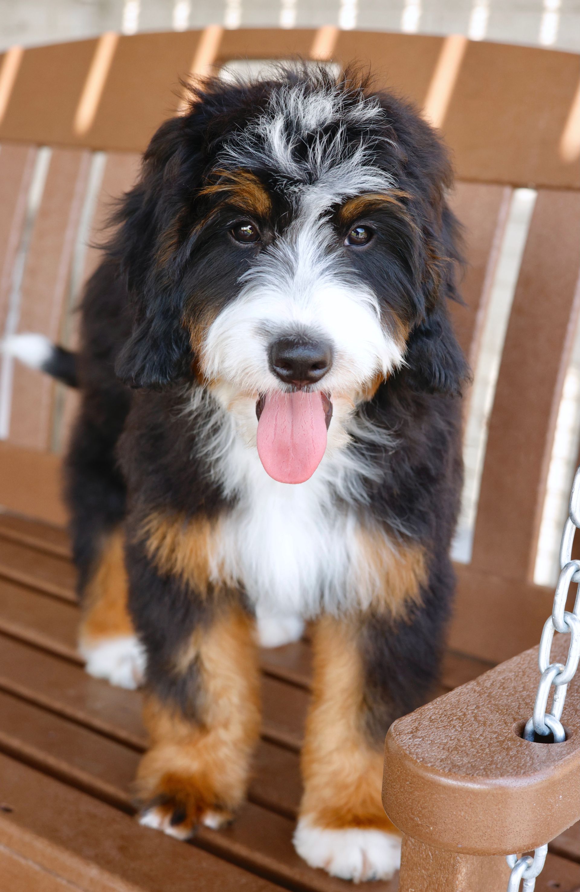 Sassy Stella loves to have a good time and be the center of attention! In the warmer months you can often find Stella "sunbathing" or even swimming in Kimberlee's swimming pool. She is an active girl and enjoys romping around with other dogs and people a like. Stella has a happy-go-lucky air of innocence to herself. She lives a care-free life and her favorite treats include but are definite not limited to; greenies, chicken nuggets, and puppy treats. Miss Stella is the goofiest girl and will always find a way to make you smile. Stella is a smaller more petite bernedoodle! She is about 18 inches to her shoulders and only 25 pounds. Stella has the most gorgeous tri-colored coat with vibrant copper and bright white markings. Stella features four copper mittens, copper on her chest, cheeks, and eyebrows. She features all of the classic markings and truly looks like a real life doll. Stella has a straight fluffy coat that is buttery soft to the touch. Stella was born and raised here at Kimberlee’s Kennels from our Nova and Draco litter.