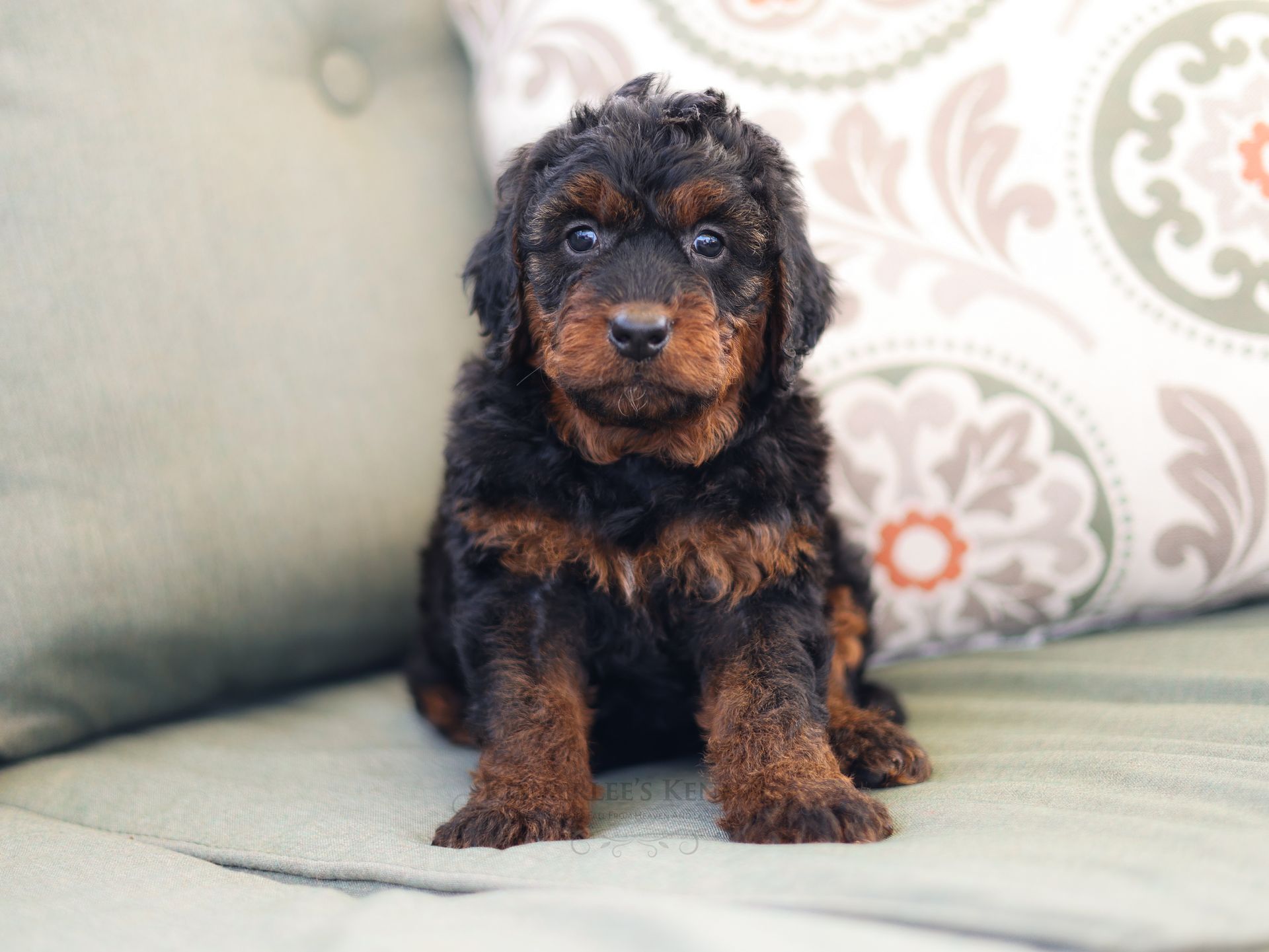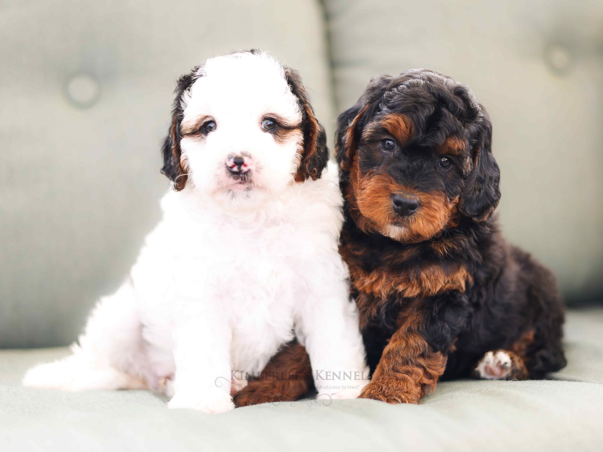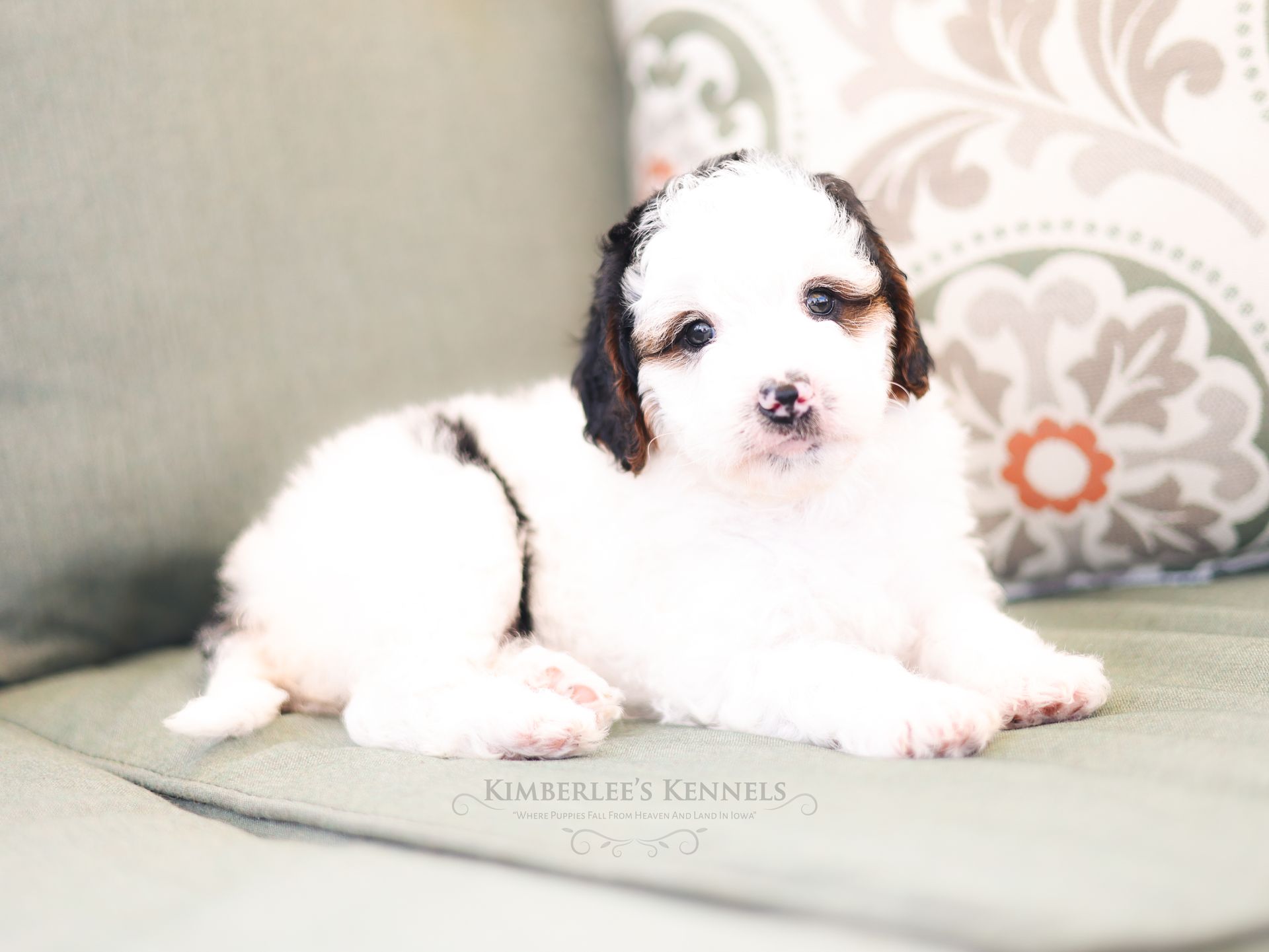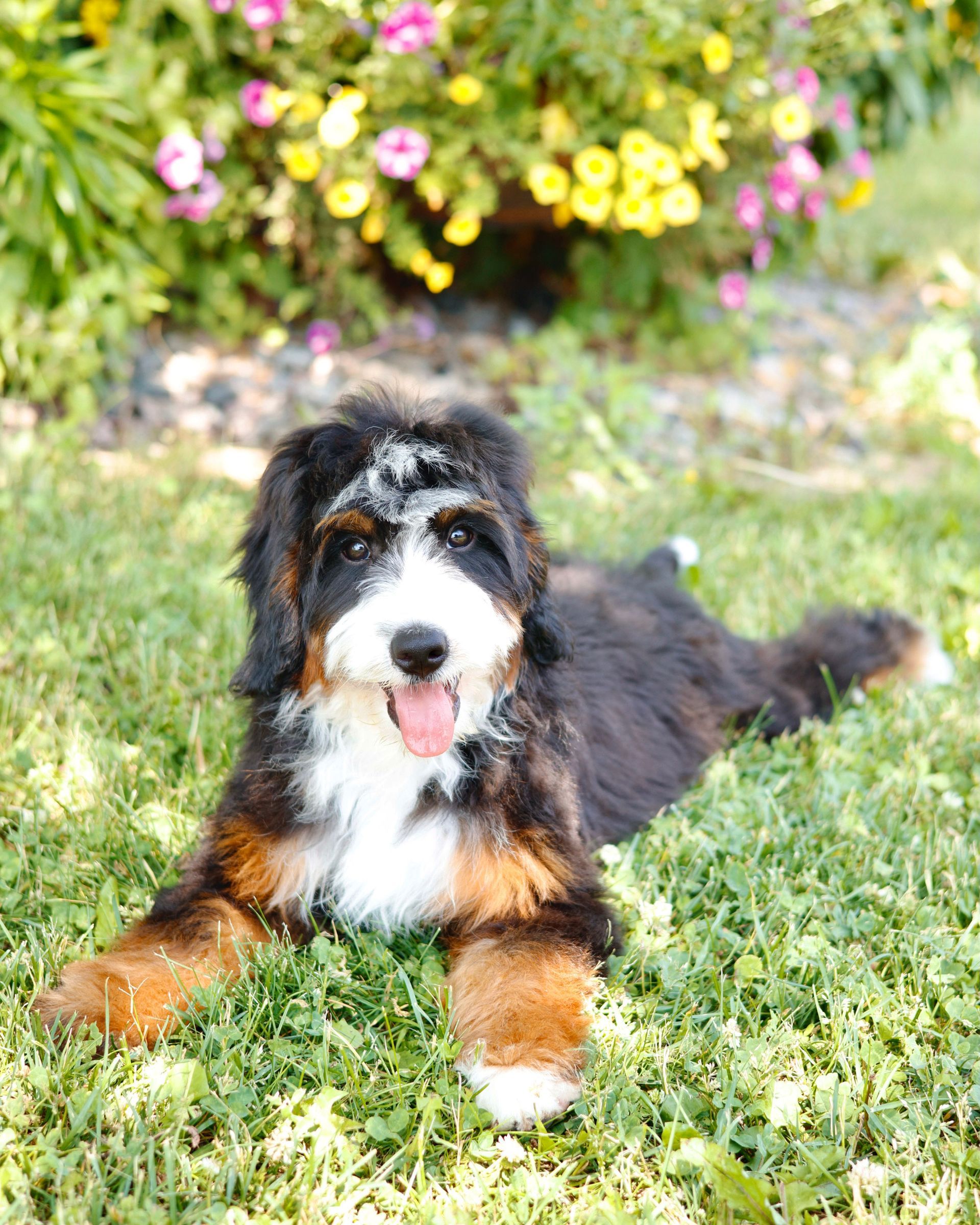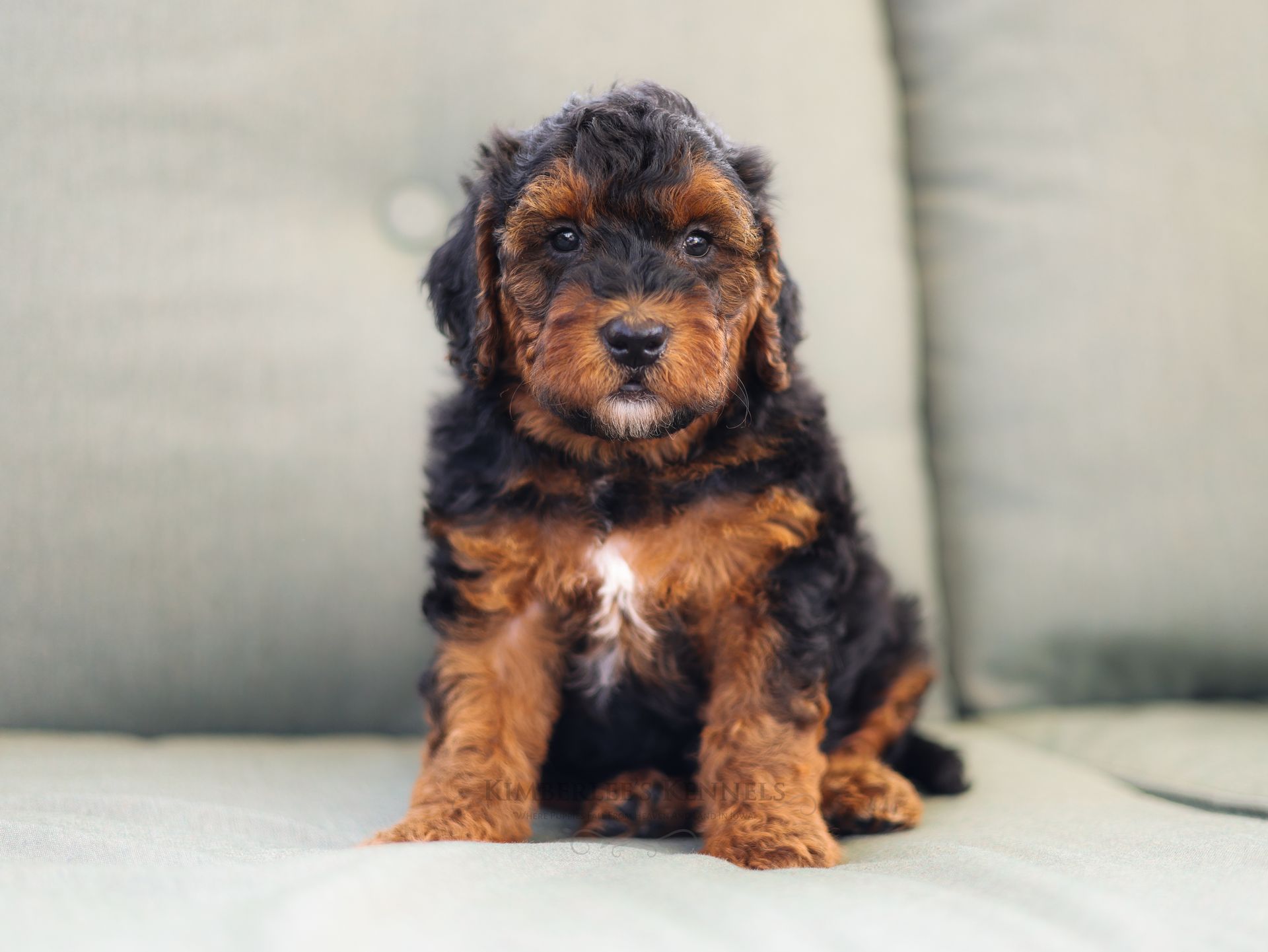 Sassy Stella loves to have a good time and be the center of attention! In the warmer months you can often find Stella "sunbathing" or even swimming in Kimberlee's swimming pool. She is an active girl and enjoys romping around with other dogs and people a like. Stella has a happy-go-lucky air of innocence to herself. She lives a care-free life and her favorite treats include but are definite not limited to; greenies, chicken nuggets, and puppy treats. Miss Stella is the goofiest girl and will always find a way to make you smile. Stella is a smaller more petite bernedoodle! She is about 18 inches to her shoulders and only 25 pounds. Stella has the most gorgeous tri-colored coat with vibrant copper and bright white markings. Stella features four copper mittens, copper on her chest, cheeks, and eyebrows. She features all of the classic markings and truly looks like a real life doll. Stella has a straight fluffy coat that is buttery soft to the touch. Stella was born and raised here at Kimberlee’s Kennels from our Nova and Draco litter.