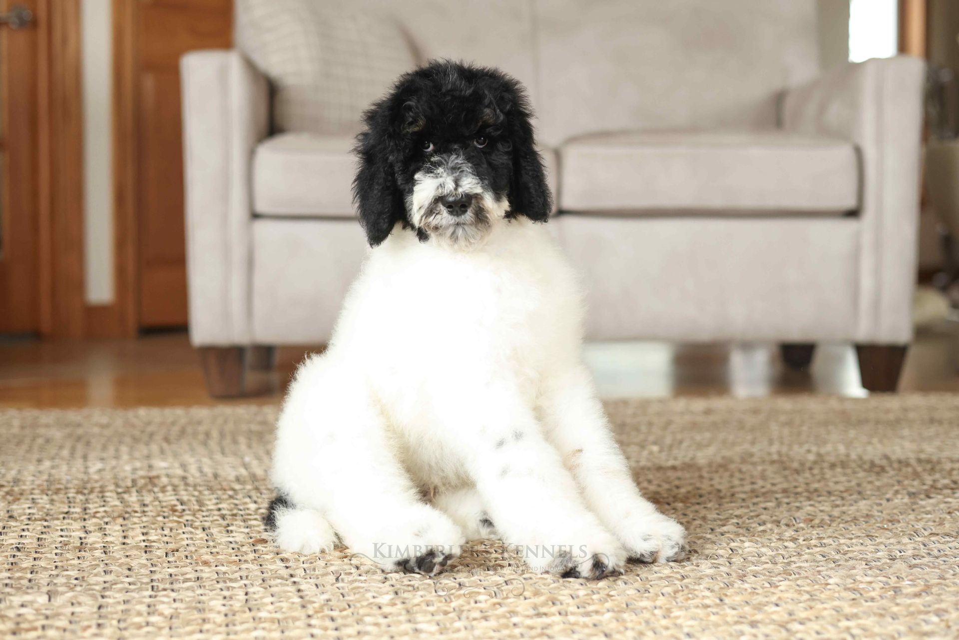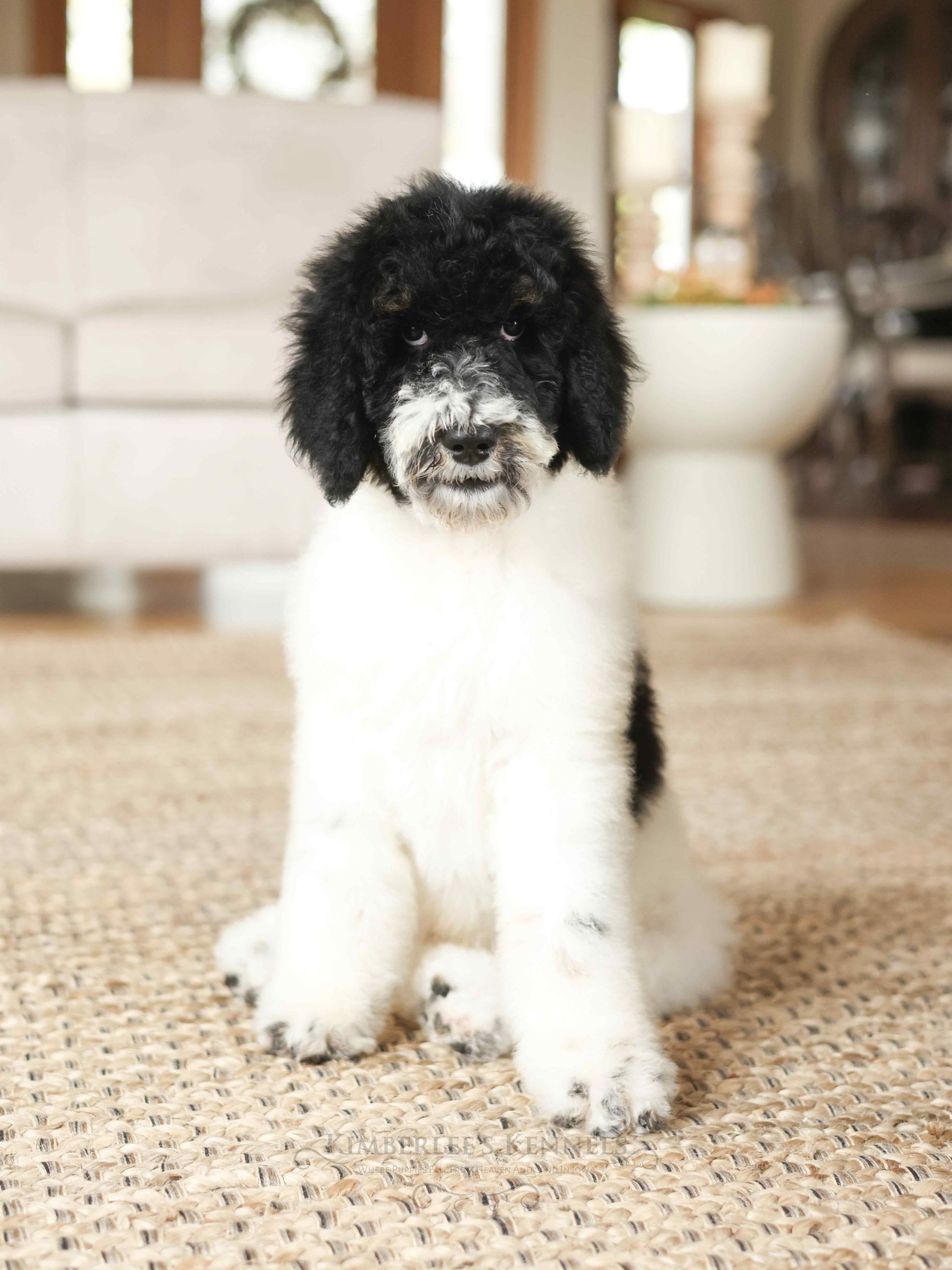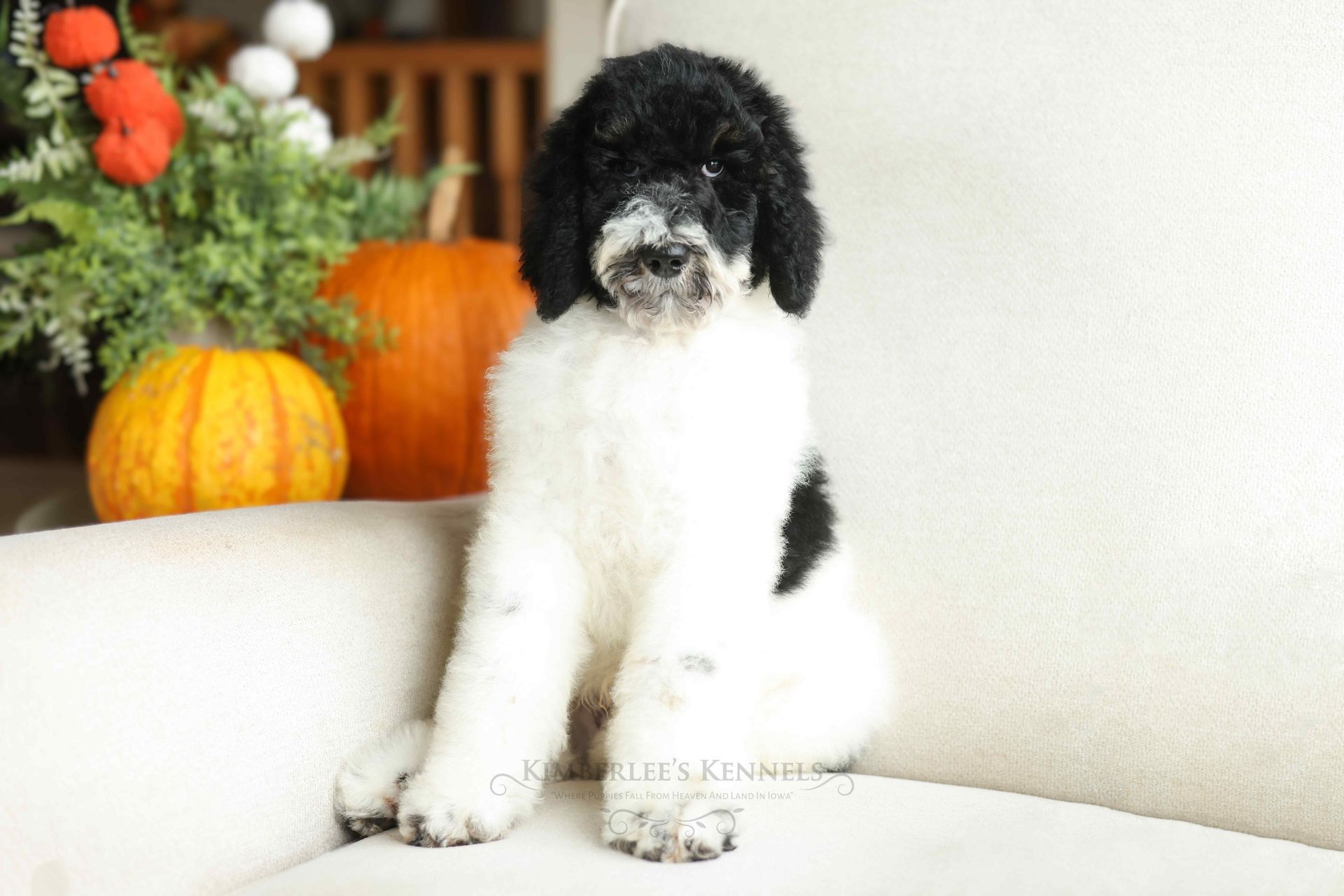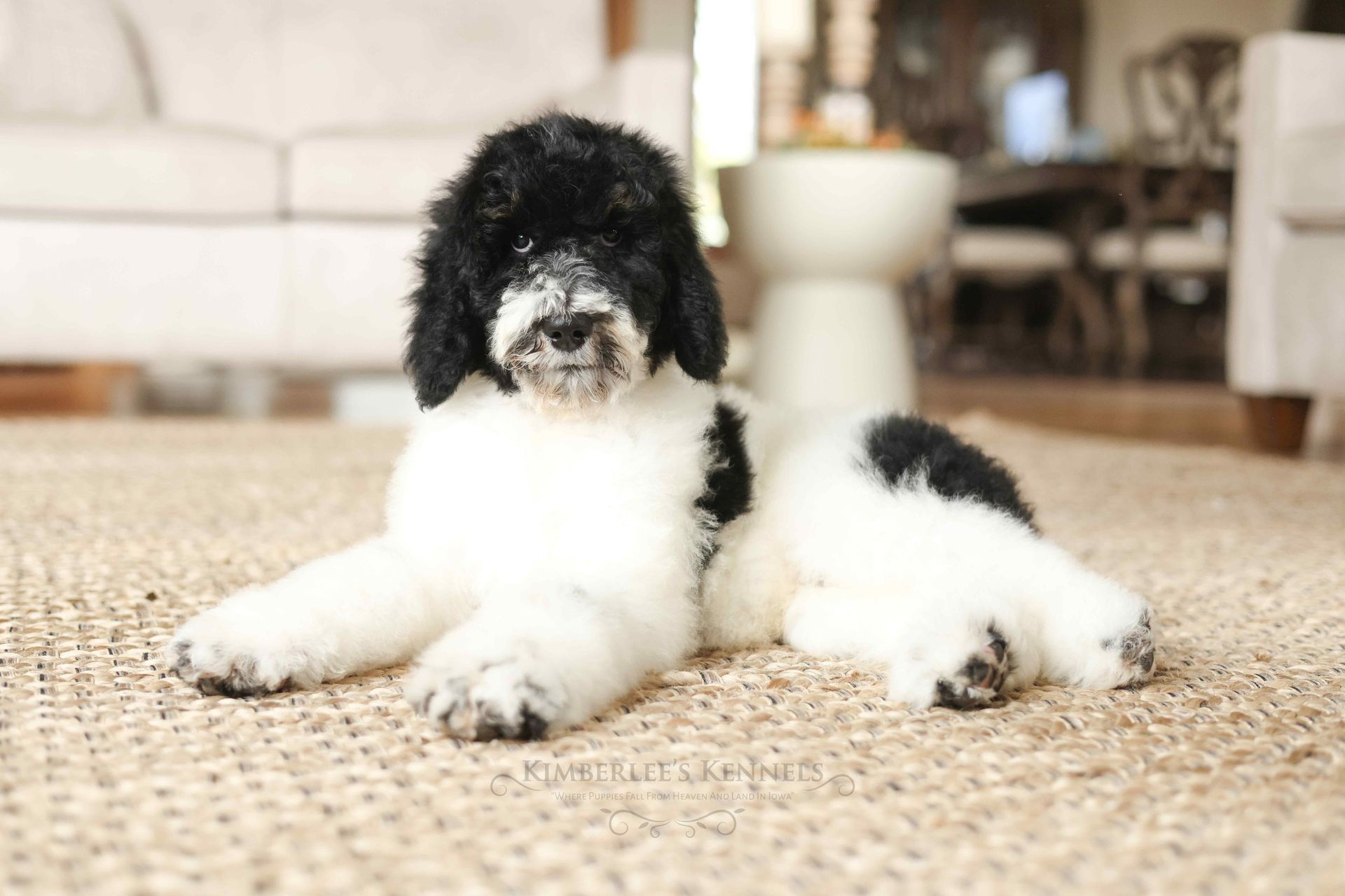 Legend is truly a natural and has an air of dignity to him. We believe this boy would do well in a large family, as he would be ready for hikes, swimming, fetch, and of course, cuddles. We have noticed Legend is quite the charmer as well and likes to get your attention by putting his paw up. He has a full personality and will truly feel like another family member. Legend is a big snuggle bug with strong human attraction. He loves being pampered, held, and enjoys affection. Legend is loyal, bonding quickly with everyone he meets. Legend has lower energy and is content watching the world go by from the comfort of your arms. He seems to be more relaxed with a warm personality. If you are searching for a puppy to love you endlessly Legend may be one to consider. He is sound and sweet in nature, you can simply see the softness in his eyes. Legend is child safe and gentle. He’s a quick leaner and has a bubbly demeanor overall. Legend has a great start to potty training, socialization, and crate training. He features the most beautiful tri-parti coat with marbling of white and black. His round white snout, black button nose, and long floppy ears give him the cutest teddy bear expression. His coat is extra plush and velvety soft to the touch. Legend is non-shedding and hypoallergenic. His estimated maturity is around 60 pounds depending on lifestyle. He features an athletic and regal build. Handsome legend will come up to date on all vaccinations, microchipped, vet certification of health, preventively de-wormed, dew claws have already been removed, one year warranty, parents have been health tested, gift bag, and more. If your family would like to meet Legend please call us at 563-380-1136 or send us an email today. We would love to connect with you.
