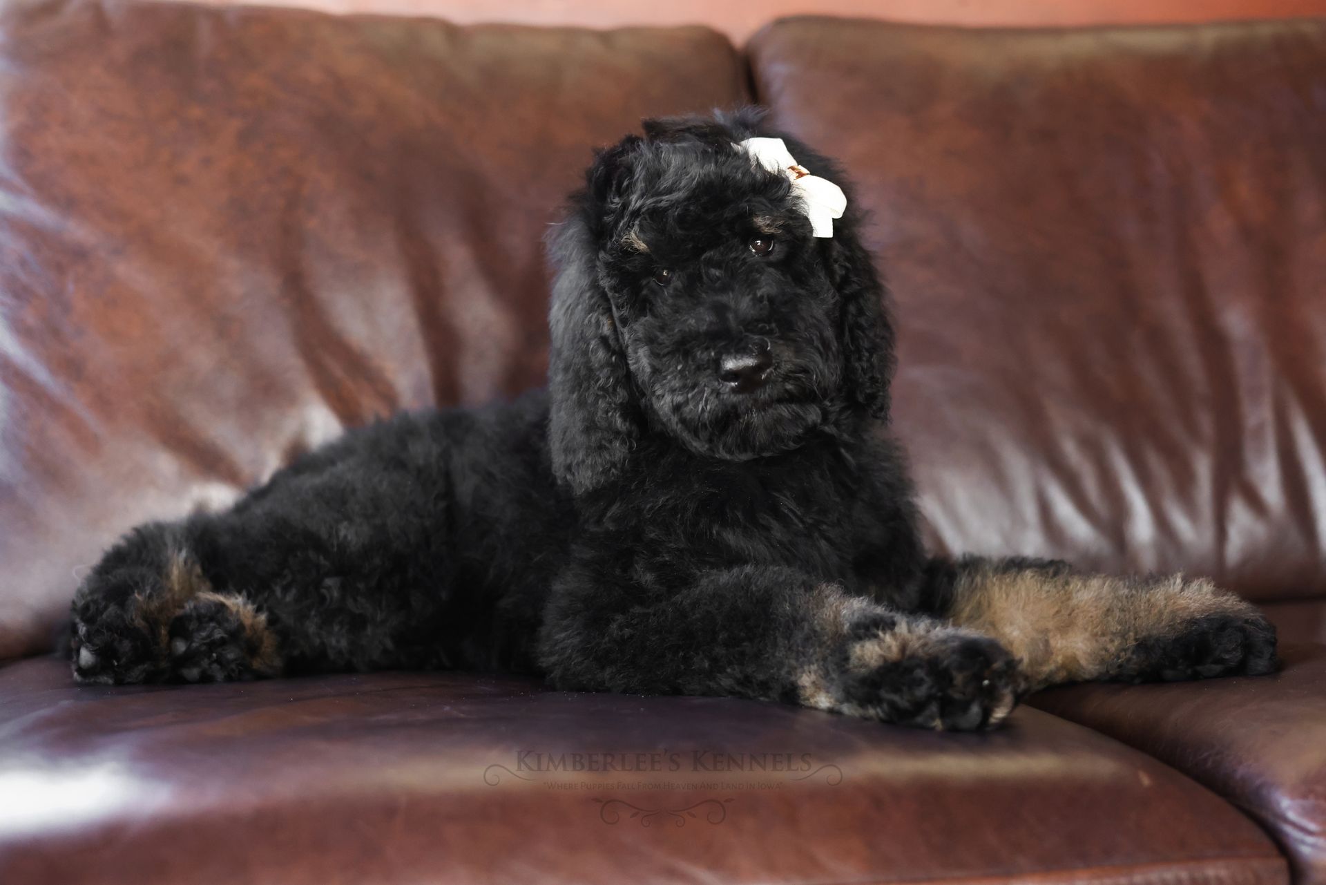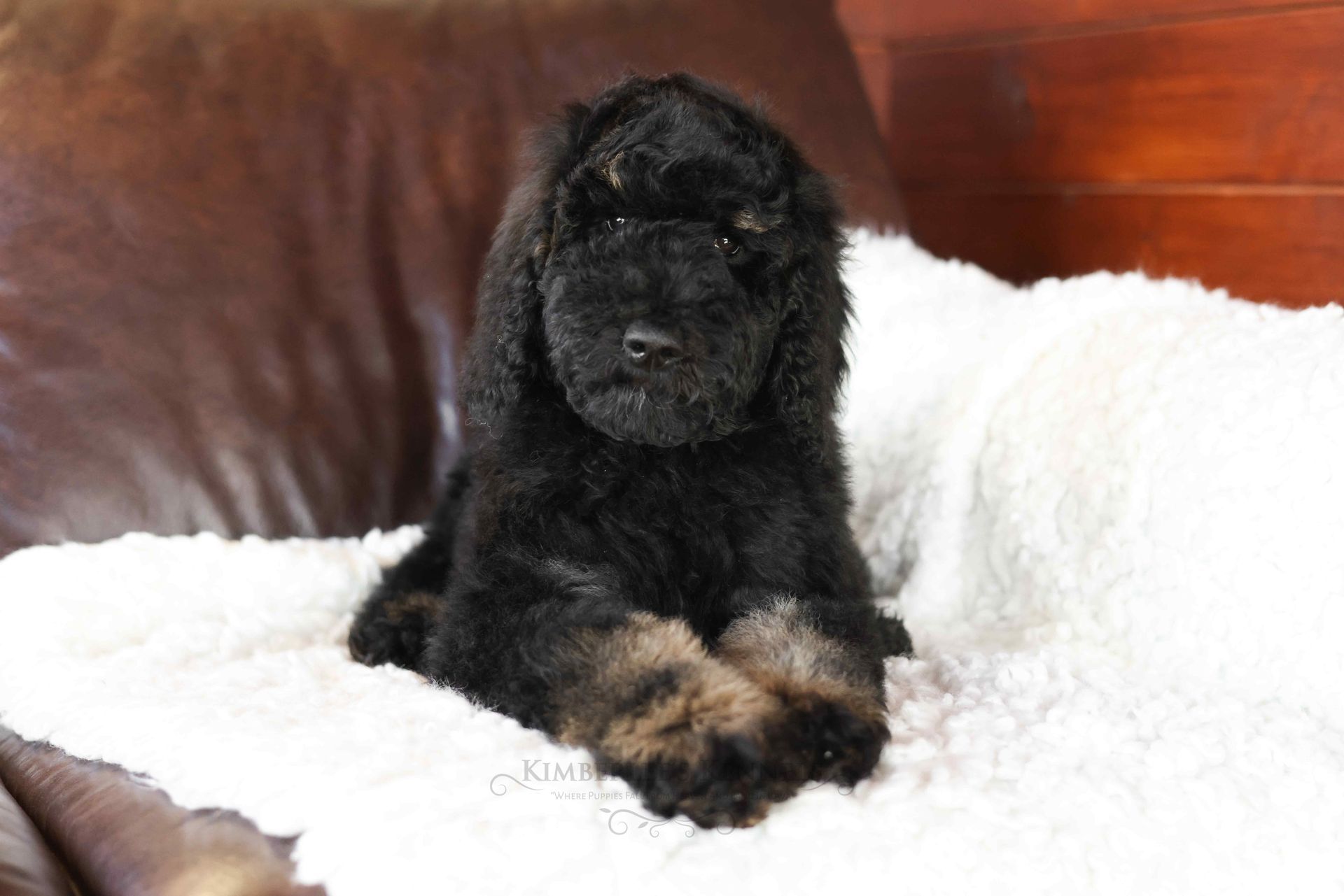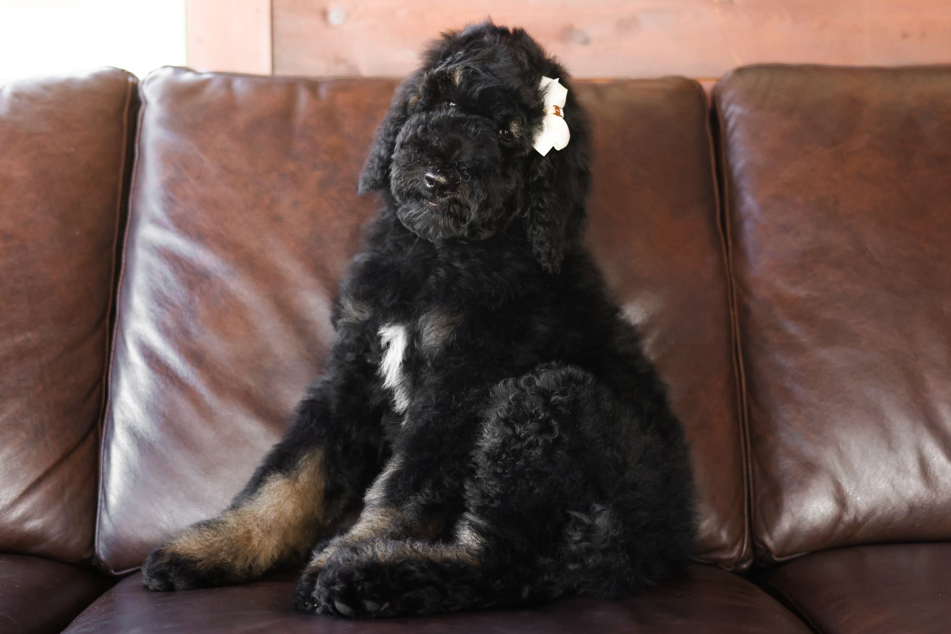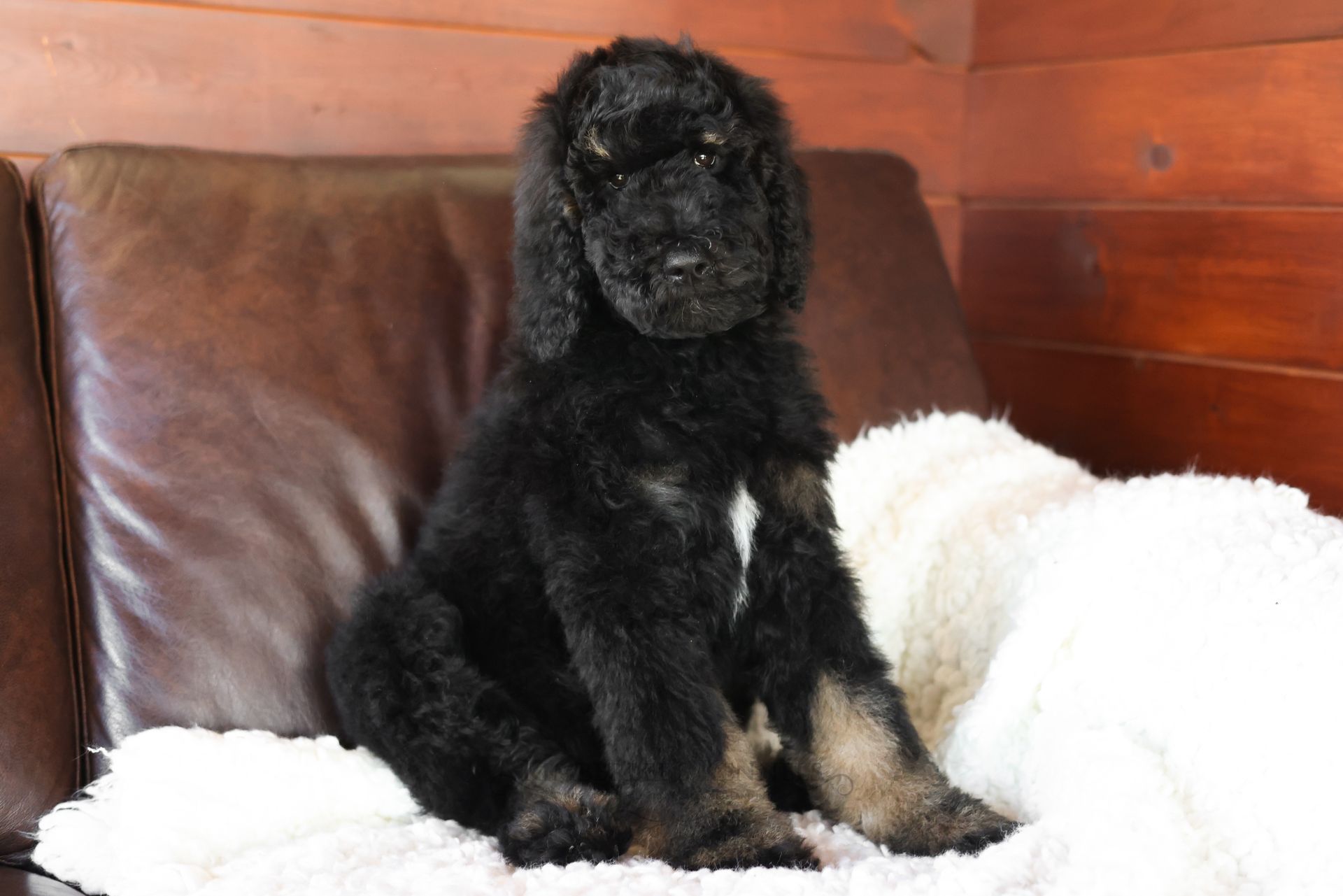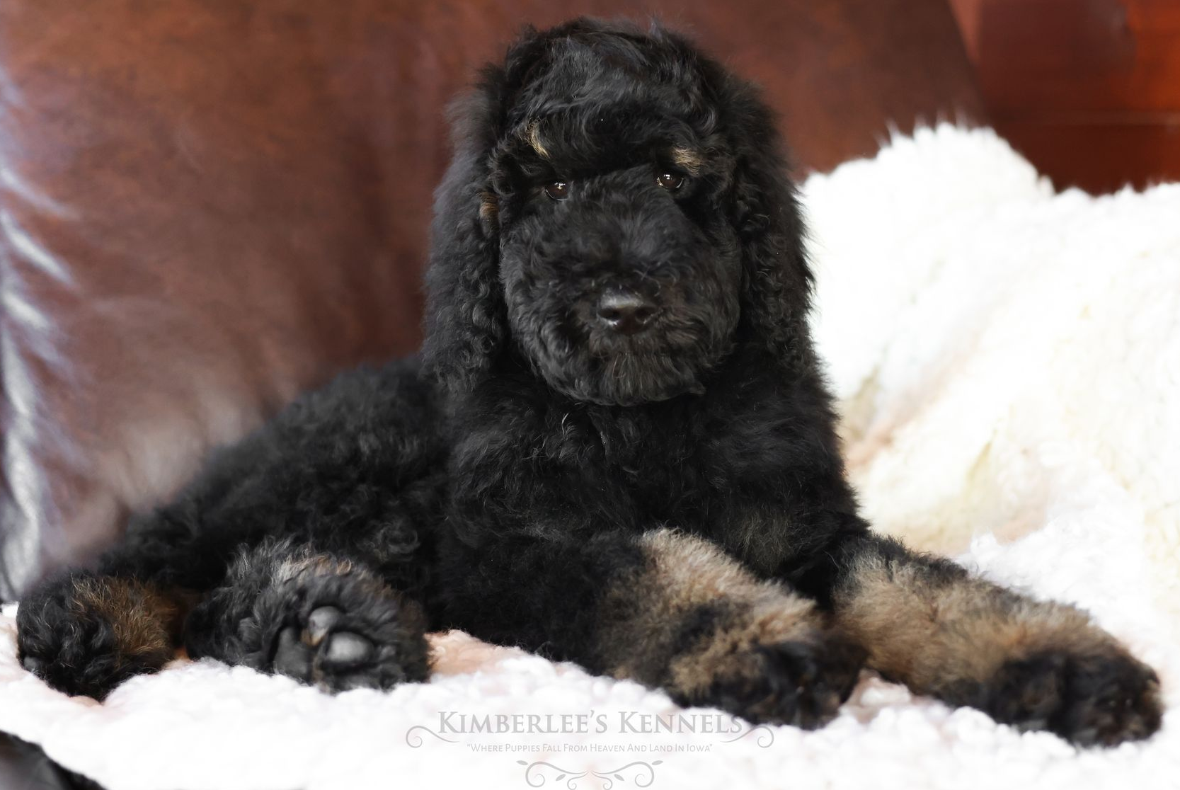 Legend is truly a natural and has an air of dignity to him. We believe this boy would do well in a large family, as he would be ready for hikes, swimming, fetch, and of course, cuddles. We have noticed Legend is quite the charmer as well and likes to get your attention by putting his paw up. He has a full personality and will truly feel like another family member. Legend is a big snuggle bug with strong human attraction. He loves being pampered, held, and enjoys affection. Legend is loyal, bonding quickly with everyone he meets. Legend has lower energy and is content watching the world go by from the comfort of your arms. He seems to be more relaxed with a warm personality. If you are searching for a puppy to love you endlessly Legend may be one to consider. He is sound and sweet in nature, you can simply see the softness in his eyes. Legend is child safe and gentle. He’s a quick leaner and has a bubbly demeanor overall. Legend has a great start to potty training, socialization, and crate training. He features the most beautiful tri-parti coat with marbling of white and black. His round white snout, black button nose, and long floppy ears give him the cutest teddy bear expression. His coat is extra plush and velvety soft to the touch. Legend is non-shedding and hypoallergenic. His estimated maturity is around 60 pounds depending on lifestyle. He features an athletic and regal build. Handsome legend will come up to date on all vaccinations, microchipped, vet certification of health, preventively de-wormed, dew claws have already been removed, one year warranty, parents have been health tested, gift bag, and more. If your family would like to meet Legend please call us at 563-380-1136 or send us an email today. We would love to connect with you.