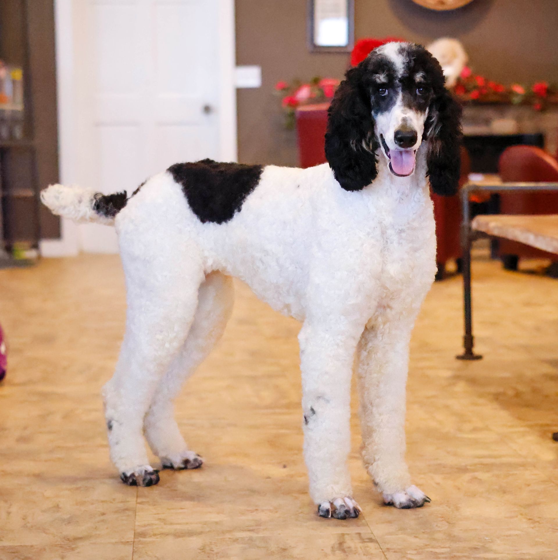 Meet the parents: Zara is the perfect poodle from her genetics, disposition, and temperament. Zara is a gorgeous parti poodle featuring a silky soft curly coat. Miss Zara has a balanced mask which is highly sought after, a white tipped tail, and copper eyebrows. Her coat is snowy white with inky black markings. She has a tall and athletic square build. Zara is 57 pounds. Zara's temperament is perfection, she is friendly and social yet always respectful. She engages well and shows strong human attraction. She loves to interact and receive affection. Zara is intuitive and leans into your emotions. She knows exactly which mood you're in and always makes you smile. Zara is lower in energy for a poodle and is a sweet and sensitive girl. In the summer miss Zara enjoys quiet activities such as exploring the farm or playing with toys. In the colder months she enjoys to snuggle in with her fluffy blankets. Zara is well mannered and has a true polite demeanor. Zara is one of our top mothers as she is patient and so nurturing. Zara's puppies are always clean, well feed, and happy. She is the best momma and that shows in her puppies having outstanding demeanors. We had held back Zara's offspring for our own program as her puppies are high quality! Pharoah is from our foundational poodles, Falcon and Farrah. He is our only Royal poodle and is an absolute sight to behold. He comes from the famous Diamond of Blackstar lines. Pharoah carries himself with an air of dignity which well bred poodles should always have. He is highly intelligent and very well-mannered. Pharoah features an athletic and square structure. Pharoah lives in a guardian home with Kimberlee’s son, Grant, here in Decorah. His favorite activities include going on hikes, playing with puppies at Kimberlee’s kennels, and occasionally eating his favorite snack: McDonald’s chicken nuggets. He is OFA cleared through parentage, with his 2 year birthday approaching. He carries perfect genetics. He weighs 76 pounds and stands 29" to the withers! We are extremely proud to have him part of our program.