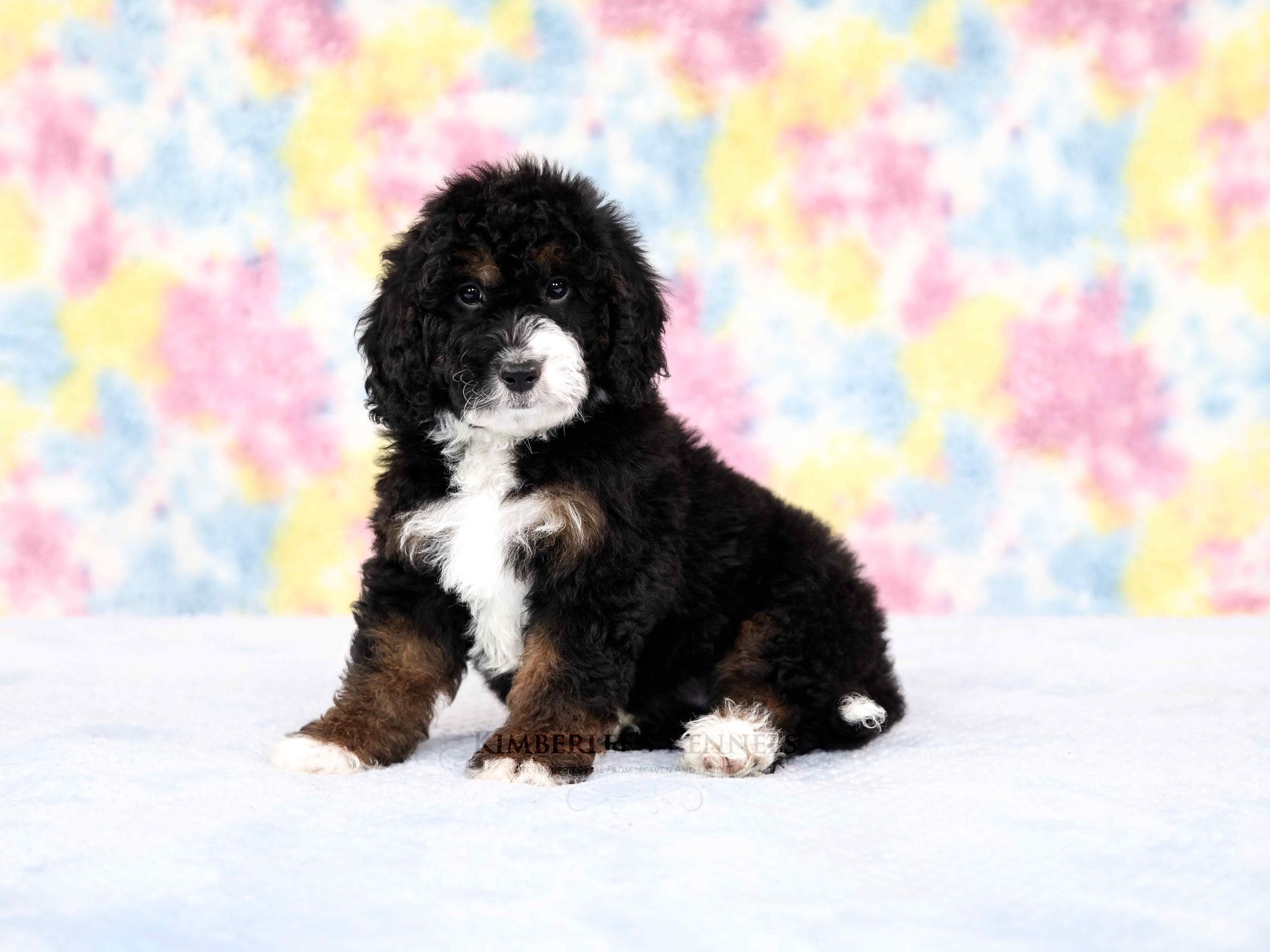 Trustworthy Trixy is a charmer. She has been a wonderful nurturing mother. Her endearing personality draws you in. She is confident yet a real sweetie that melts the hearts of all of our staff. A large white blaze, white tipped tail makes her really stand out. Exceptional coat quality as well. Husky in build will give her puppies the classic teddy-bear look. Miss Trixy is about 50 pounds.