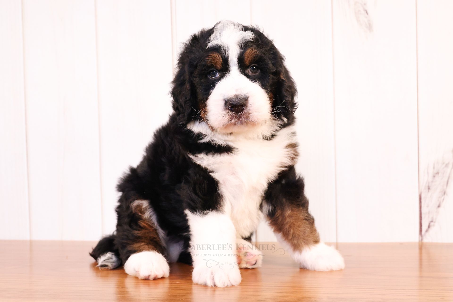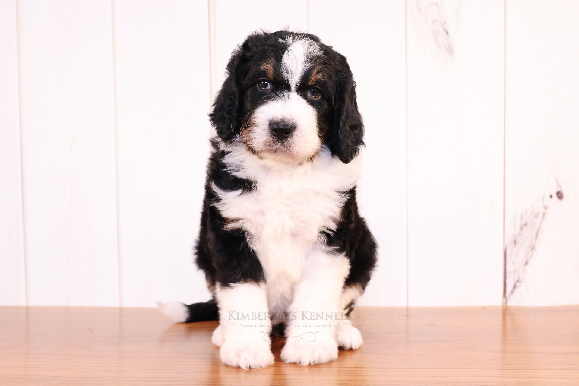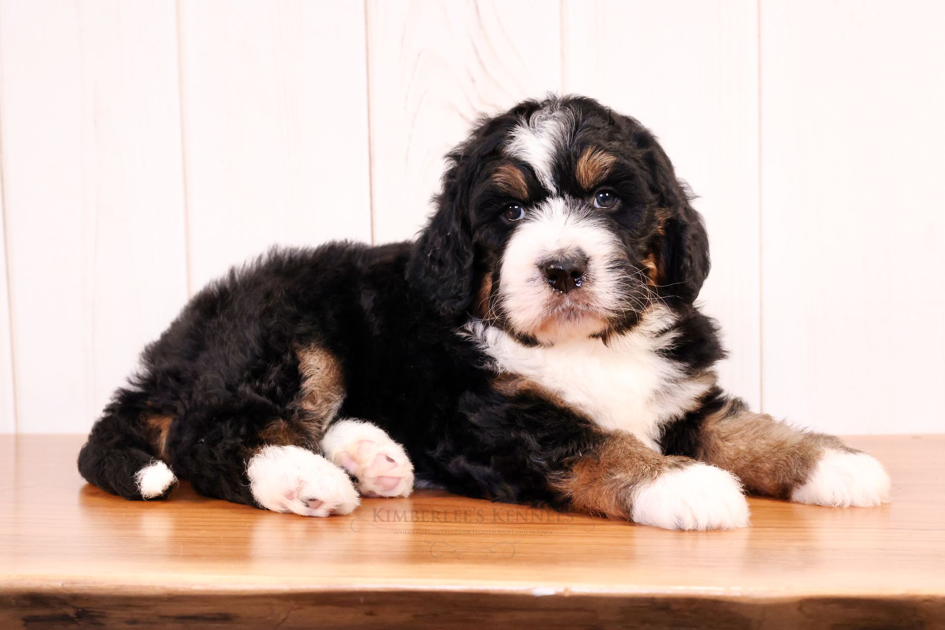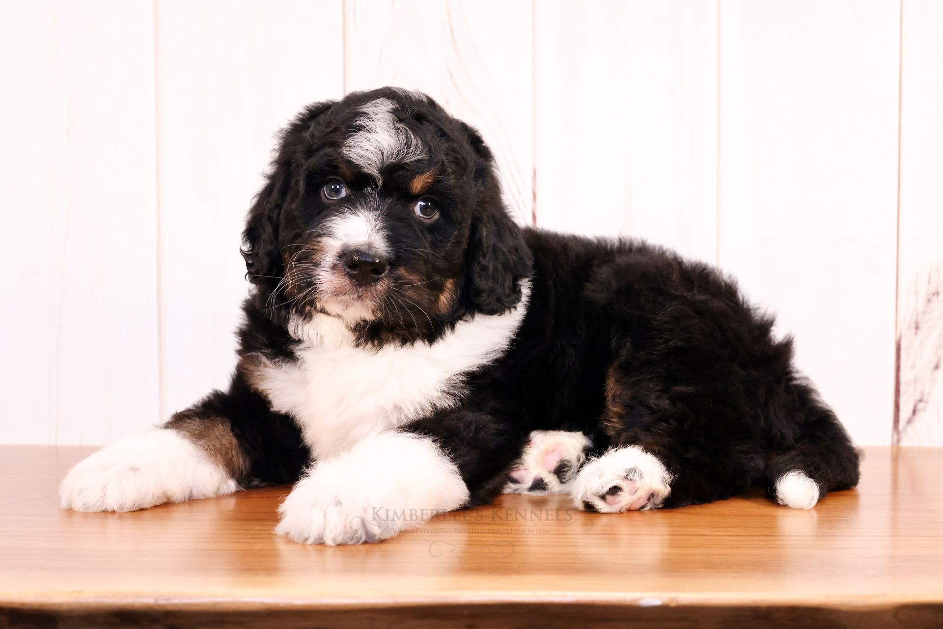 Vibrant Vera is another absolutely gorgeous tri-parti poodle! She is from our Zara and Pharoah lines. Vera is an altogether regal and elegant poodle. She holds herself with an air of dignity. Vera is respectful, mellow, and more reserved. Vera truly enjoys one on one time with her favorite people or engaging in quiet activities such as chewing on a teething treat or prancing around the warm sun. She is a fair weathered poodle and in the winter prefers to be snuggled up next to the fireplace, tucked in with her fluffy blanket. Vera is extremely intelligent and even as a young puppy showed eagerness to please and engages well with people. Vera is a confident girl and can often pick up on your emotions. She is an excellent snuggler and creates special bonds with her people. Vera features a perfect structure from her straight square body, dropped ears, and long legs. She is a very attraction and athletic poodle. Vera is 52 pounds. Vera's coat is reminiscent of a big fluffy cloud. Her coat has the softest curls and is perfectly marbled with snowy white and rich black. Her white tipped tail and balanced mask add to her charming appearance. Vera also has copper eyebrows along with copper on her cheeks and snout.