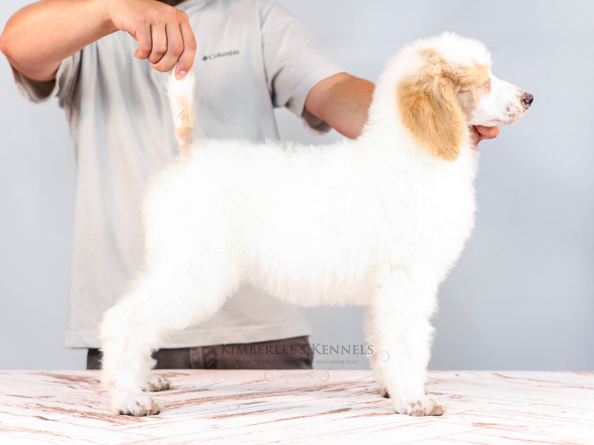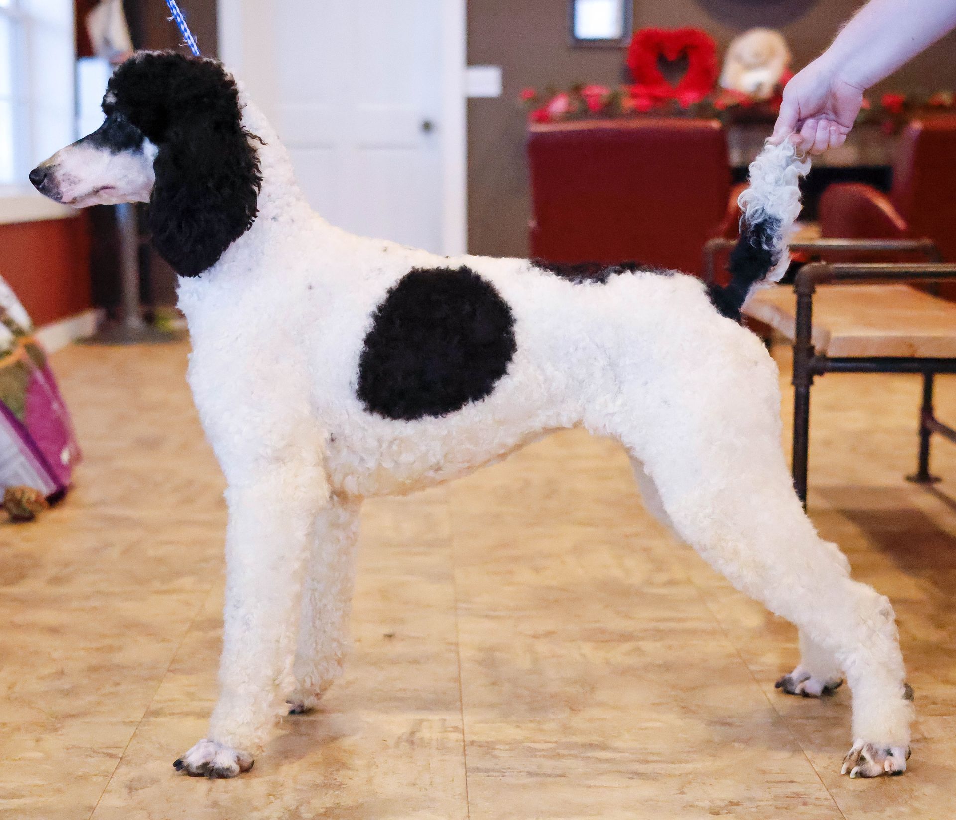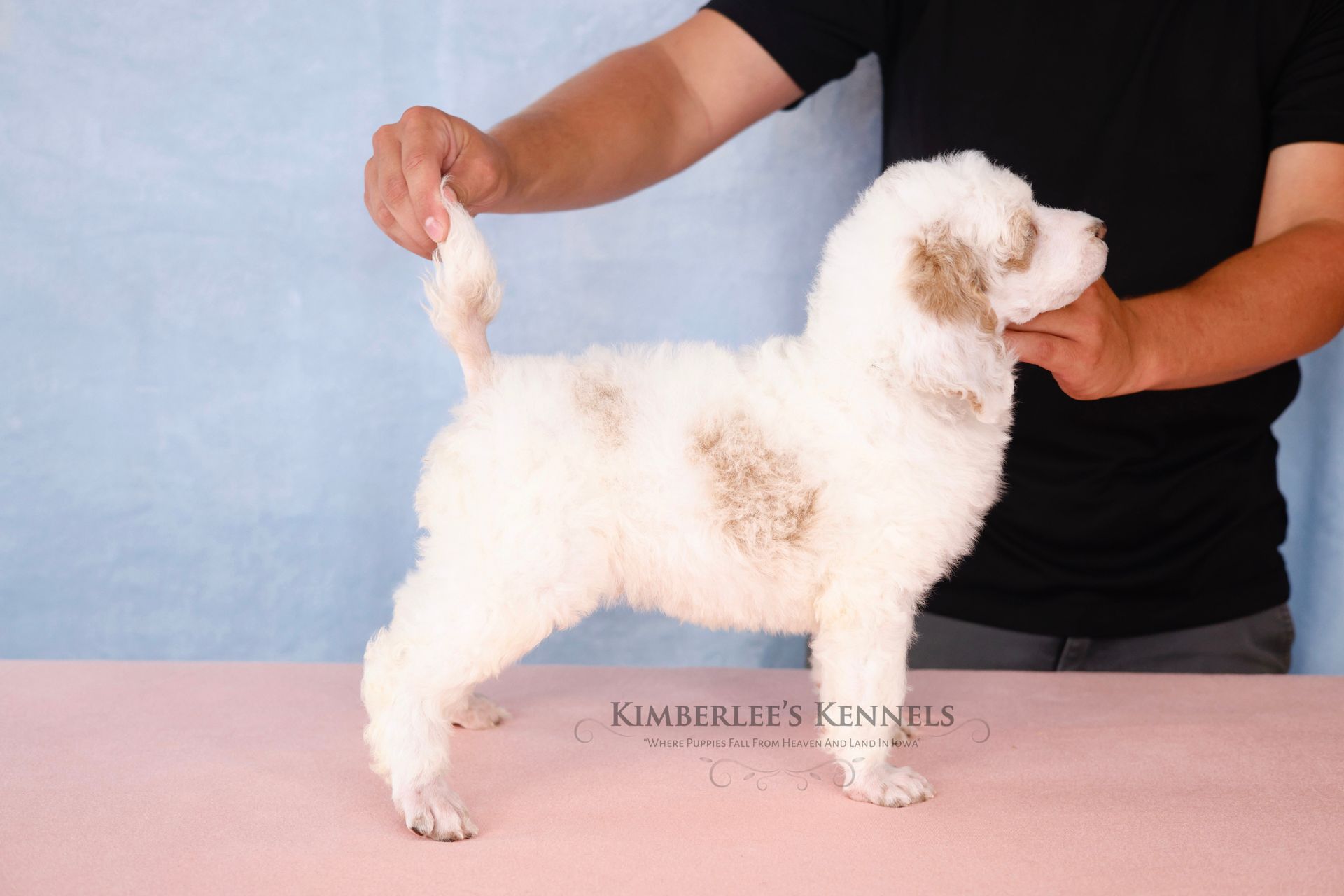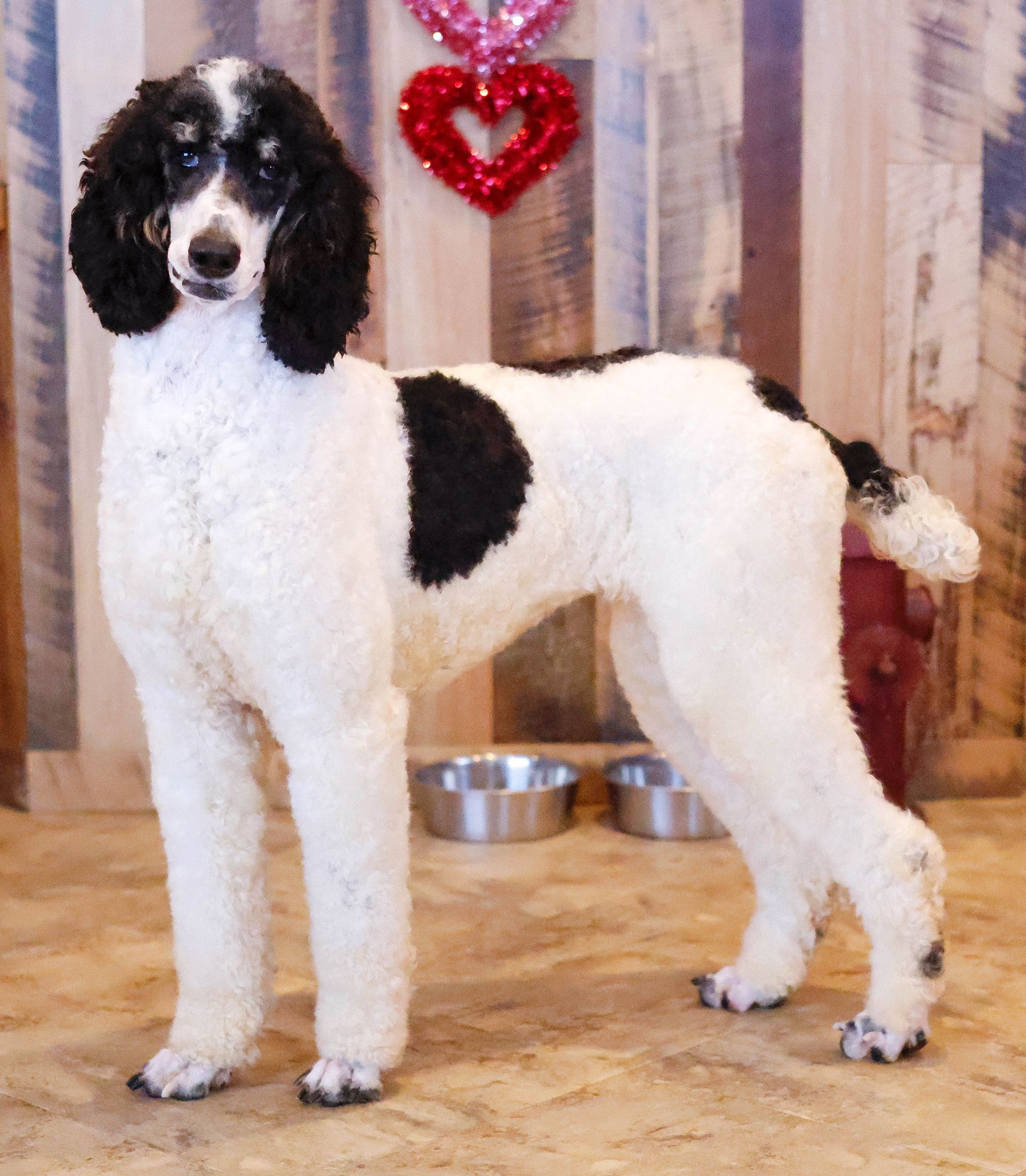 Zara is the perfect poodle from her genetics, disposition, and temperament. Zara is a gorgeous parti poodle featuring a silky soft curly coat. Miss Zara has a balanced mask which is highly sought after, a white tipped tail, and copper eyebrows. Her coat is snowy white with inky black markings. She has a tall and athletic square build. Zara is 57 pounds. Zara's temperament is perfection, she is friendly and social yet always respectful. She engages well and shows strong human attraction. She loves to interact and receive affection. Zara is intuitive and leans into your emotions. She knows exactly which mood you're in and always makes you smile. Zara is lower in energy for a poodle and is a sweet and sensitive girl. In the summer miss Zara enjoys quiet activities such as exploring the farm or playing with toys. In the colder months she enjoys to snuggle in with her fluffy blankets. Zara is well mannered and has a true polite demeanor. Zara is one of our top mothers as she is patient and so nurturing. Zara's puppies are always clean, well feed, and happy. She is the best momma and that shows in her puppies having outstanding demeanors. We had held back Zara's offspring for our own program as her puppies are high quality!