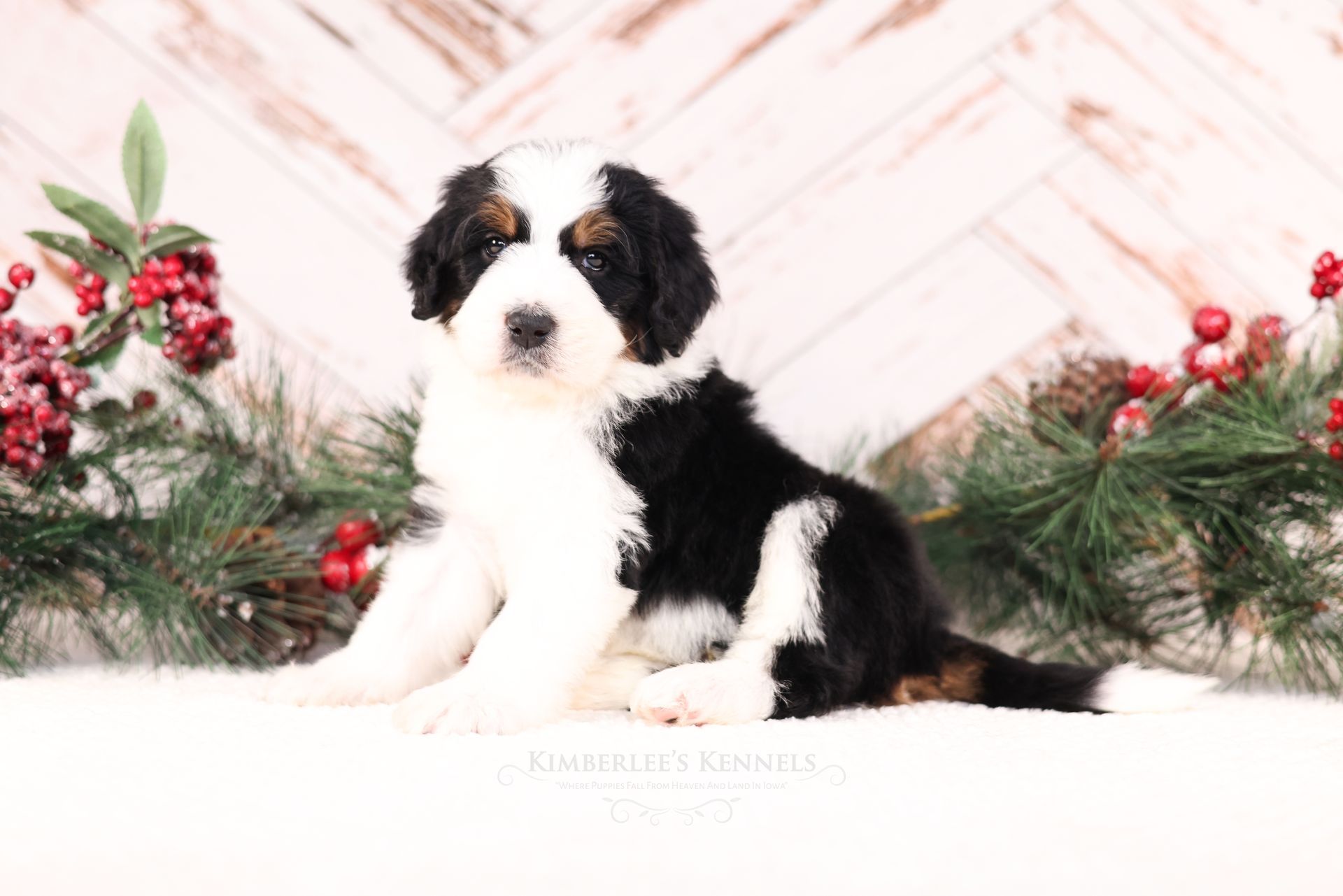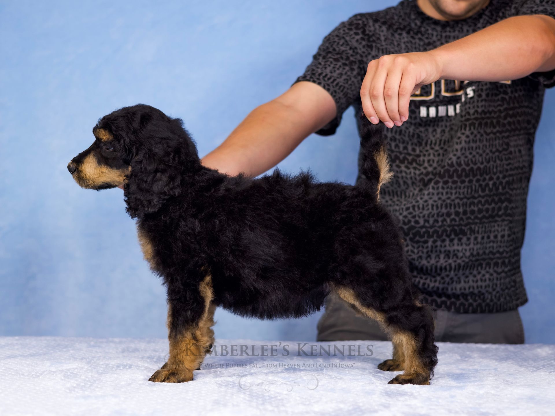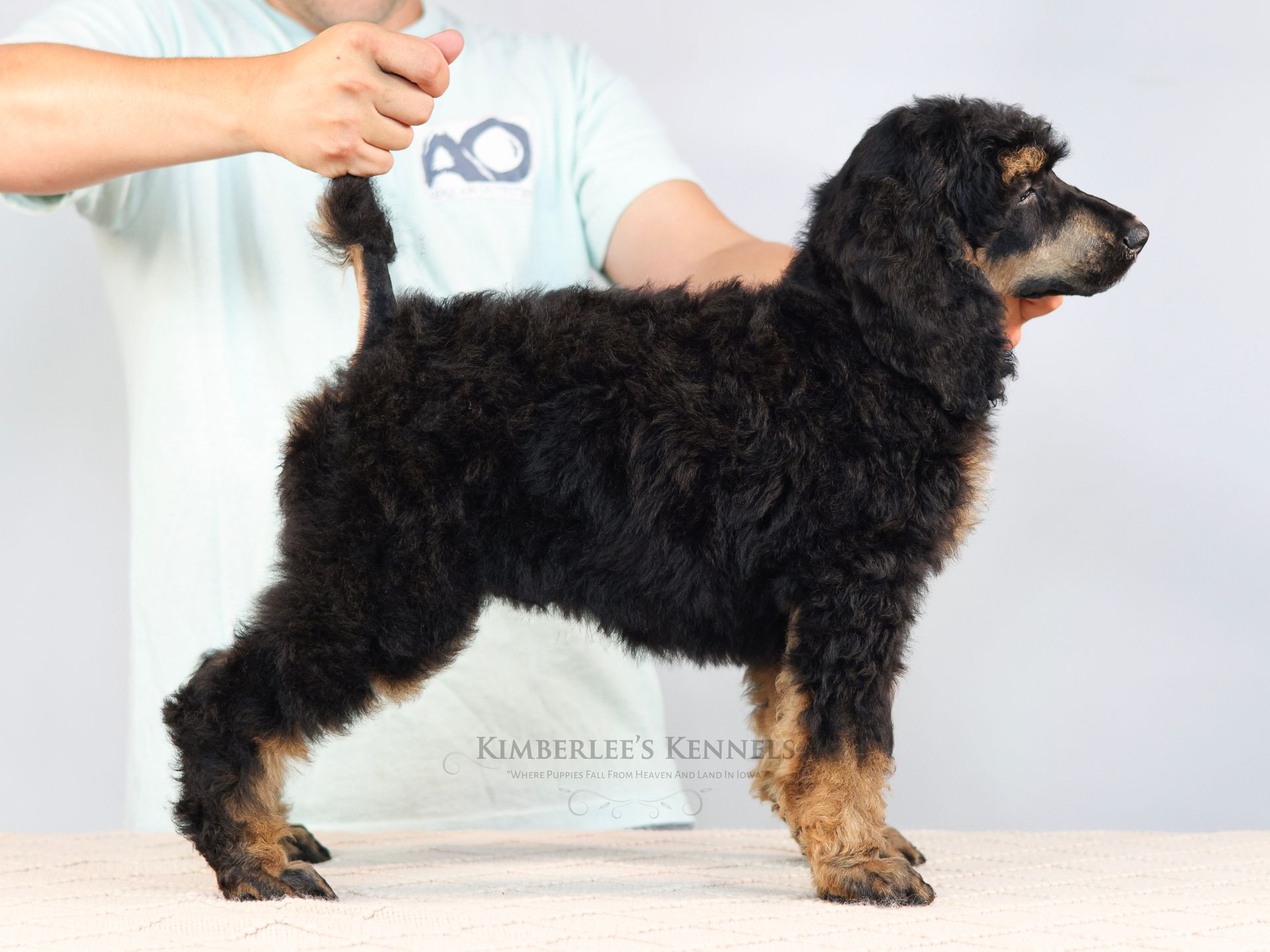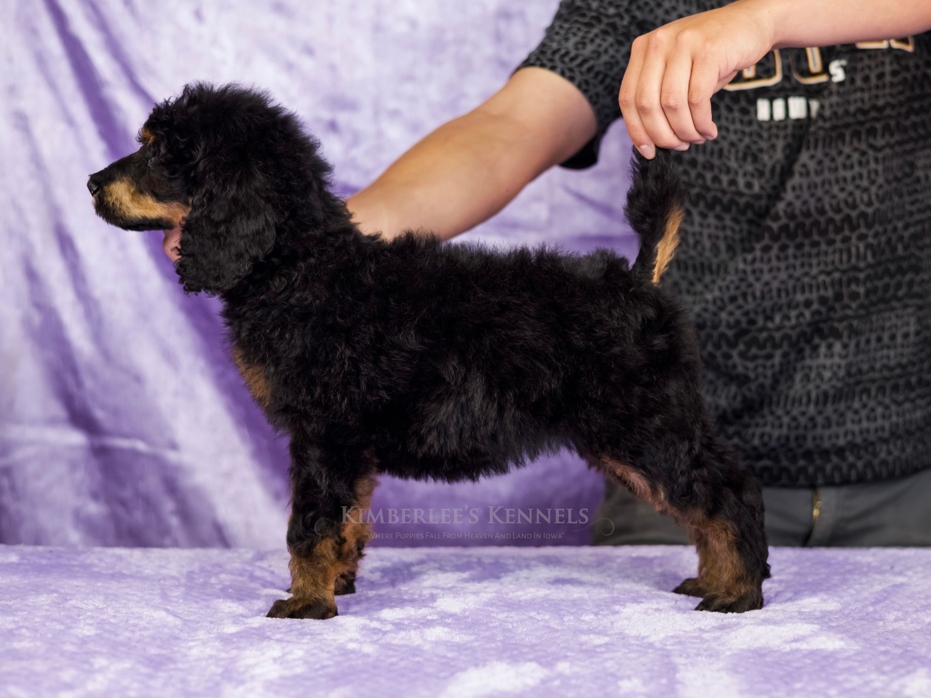 Zara is the perfect poodle from her genetics, disposition, and temperament. Zara is a gorgeous parti poodle featuring a silky soft curly coat. Miss Zara has a balanced mask which is highly sought after, a white tipped tail, and copper eyebrows. Her coat is snowy white with inky black markings. She has a tall and athletic square build. Zara is 57 pounds. Zara's temperament is perfection, she is friendly and social yet always respectful. She engages well and shows strong human attraction. She loves to interact and receive affection. Zara is intuitive and leans into your emotions. She knows exactly which mood you're in and always makes you smile. Zara is lower in energy for a poodle and is a sweet and sensitive girl. In the summer miss Zara enjoys quiet activities such as exploring the farm or playing with toys. In the colder months she enjoys to snuggle in with her fluffy blankets. Zara is well mannered and has a true polite demeanor. Zara is one of our top mothers as she is patient and so nurturing. Zara's puppies are always clean, well feed, and happy. She is the best momma and that shows in her puppies having outstanding demeanors. We had held back Zara's offspring for our own program as her puppies are high quality!