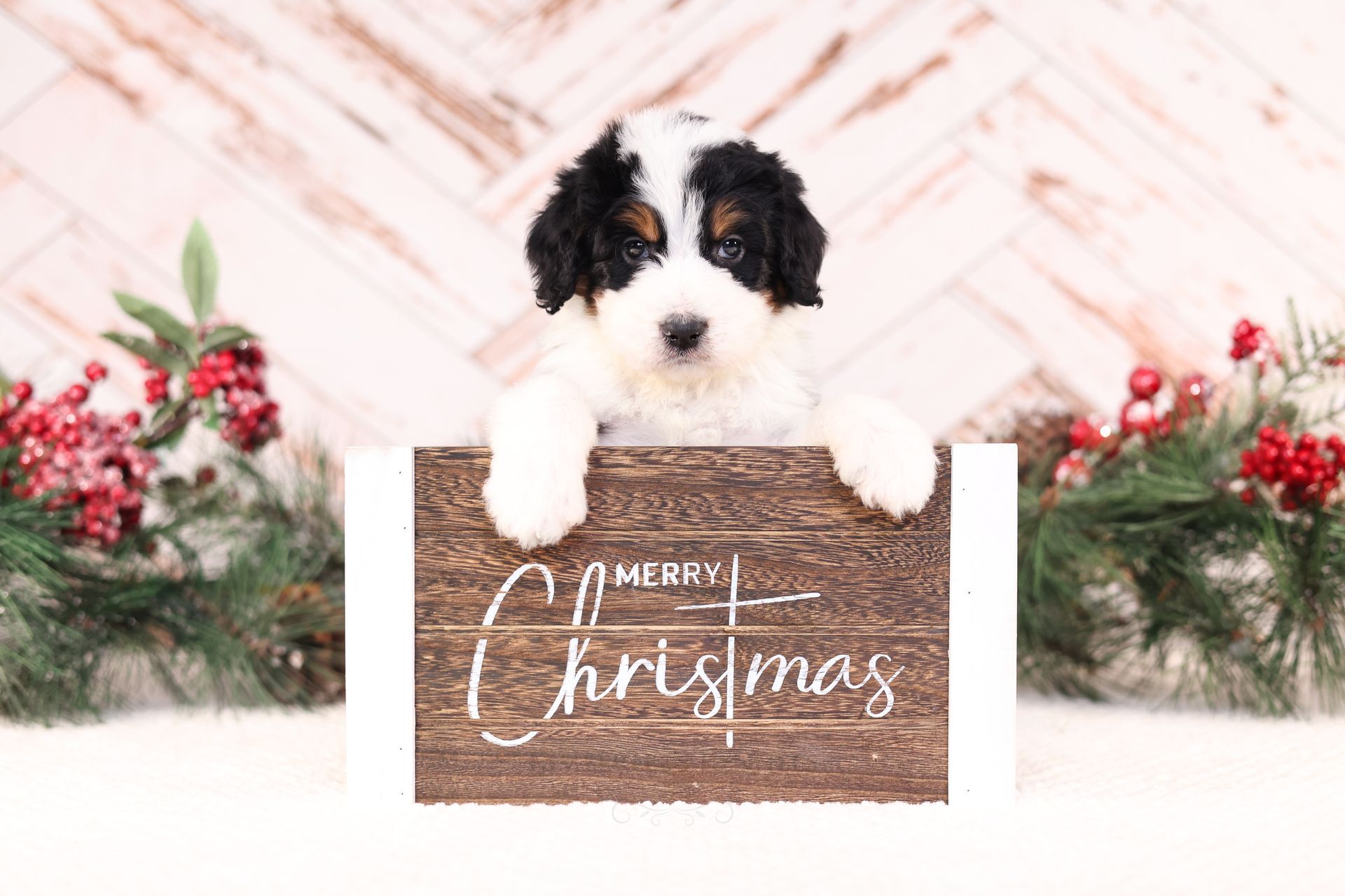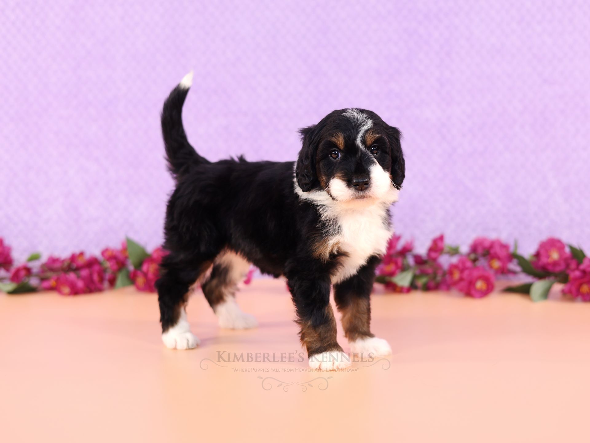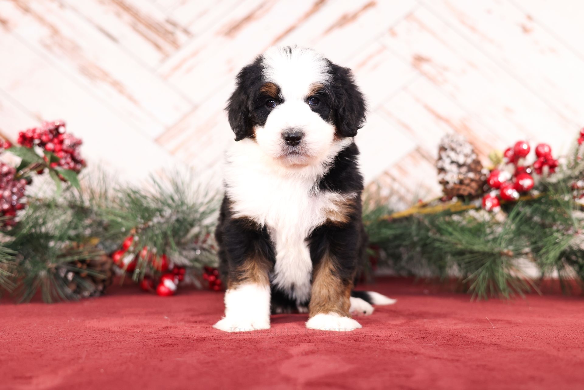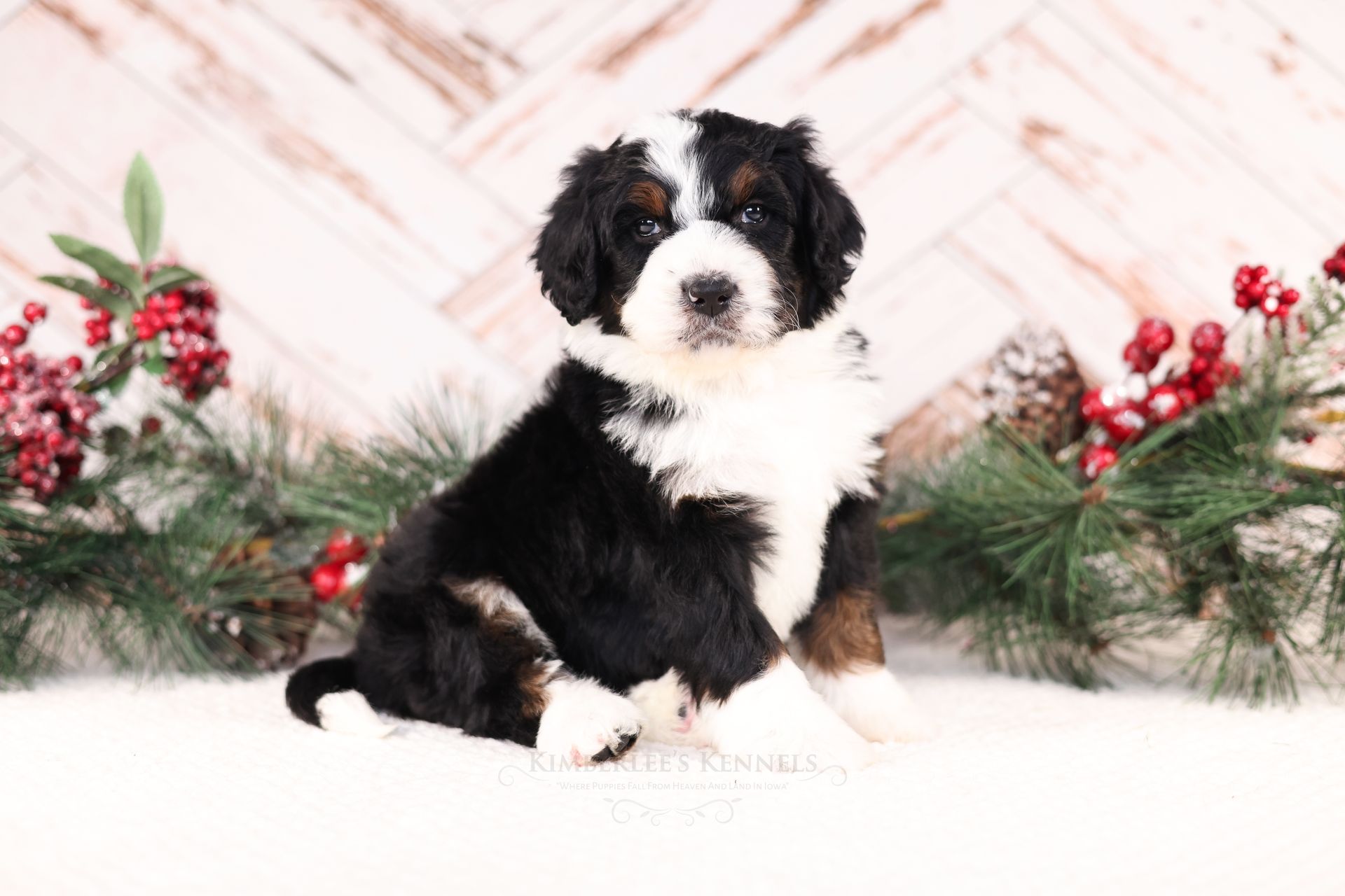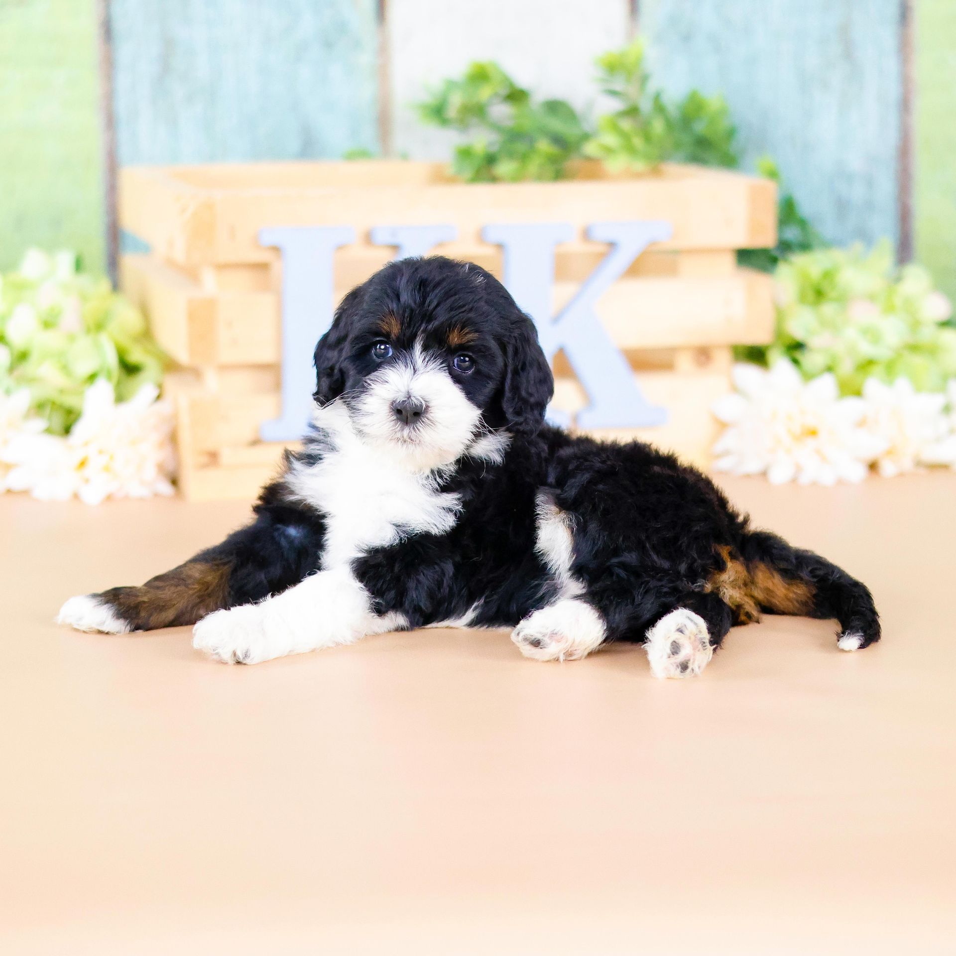 Zara is the perfect poodle from her genetics, disposition, and temperament. Zara is a gorgeous parti poodle featuring a silky soft curly coat. Miss Zara has a balanced mask which is highly sought after, a white tipped tail, and copper eyebrows. Her coat is snowy white with inky black markings. She has a tall and athletic square build. Zara is 57 pounds. Zara's temperament is perfection, she is friendly and social yet always respectful. She engages well and shows strong human attraction. She loves to interact and receive affection. Zara is intuitive and leans into your emotions. She knows exactly which mood you're in and always makes you smile. Zara is lower in energy for a poodle and is a sweet and sensitive girl. In the summer miss Zara enjoys quiet activities such as exploring the farm or playing with toys. In the colder months she enjoys to snuggle in with her fluffy blankets. Zara is well mannered and has a true polite demeanor. Zara is one of our top mothers as she is patient and so nurturing. Zara's puppies are always clean, well feed, and happy. She is the best momma and that shows in her puppies having outstanding demeanors. We had held back Zara's offspring for our own program as her puppies are high quality!