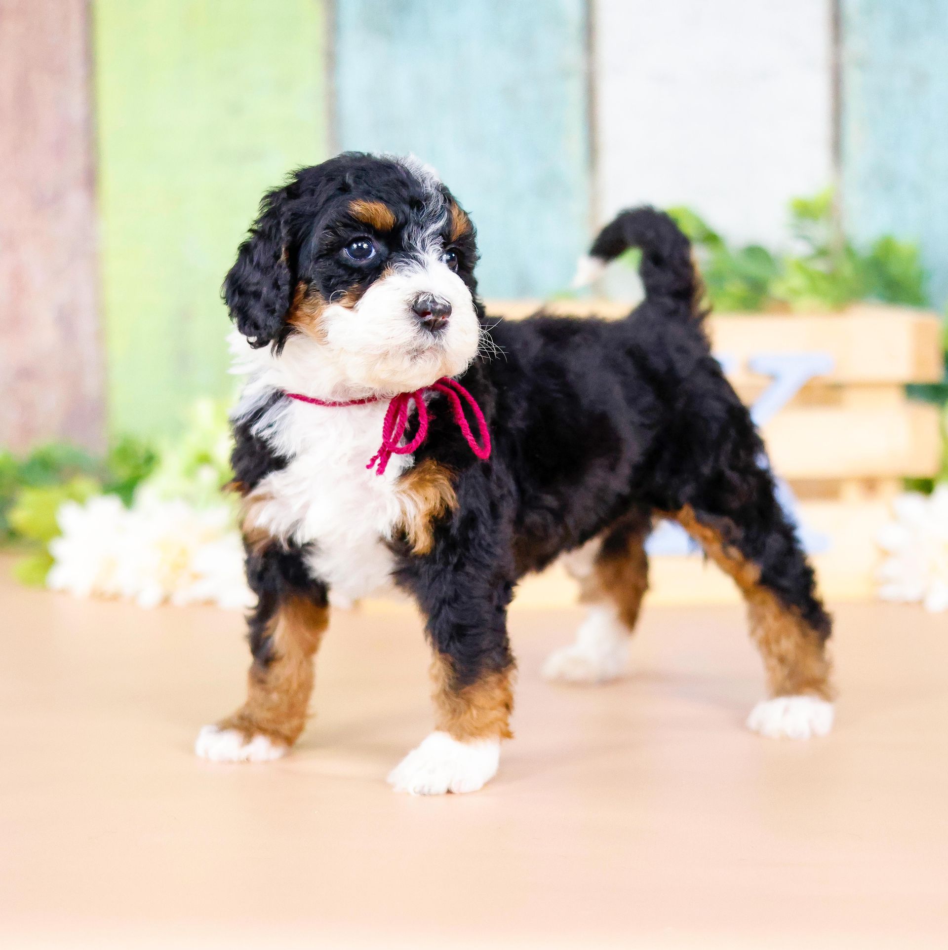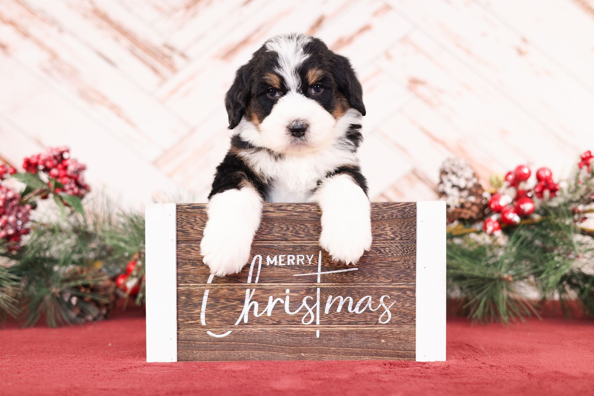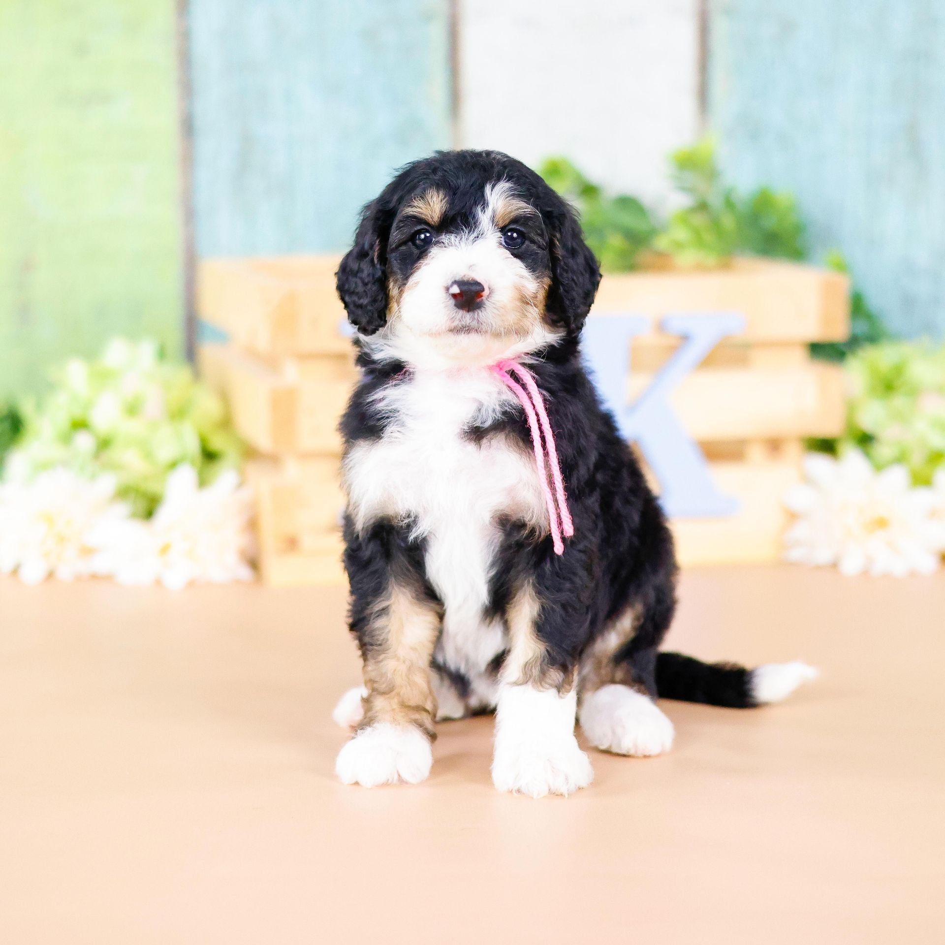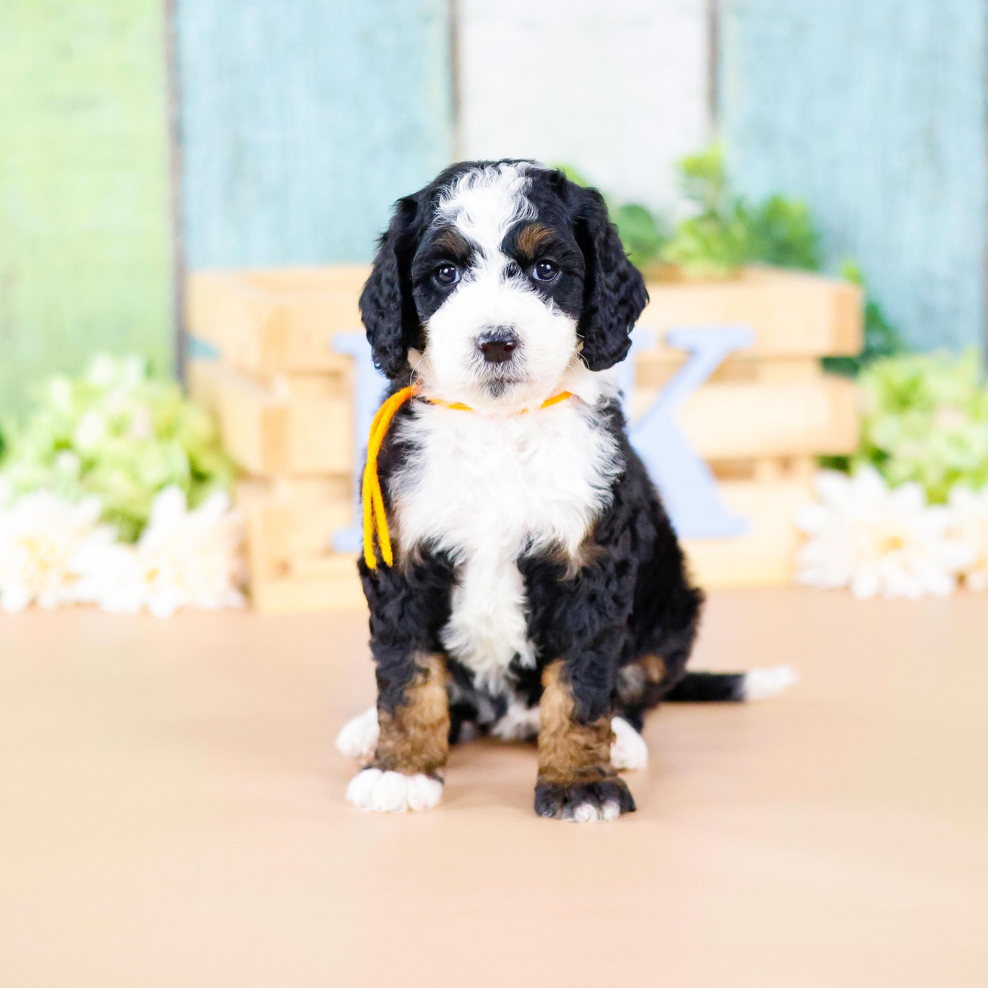 Zara is the perfect poodle from her genetics, disposition, and temperament. Zara is a gorgeous parti poodle featuring a silky soft curly coat. Miss Zara has a balanced mask which is highly sought after, a white tipped tail, and copper eyebrows. Her coat is snowy white with inky black markings. She has a tall and athletic square build. Zara is 57 pounds. Zara's temperament is perfection, she is friendly and social yet always respectful. She engages well and shows strong human attraction. She loves to interact and receive affection. Zara is intuitive and leans into your emotions. She knows exactly which mood you're in and always makes you smile. Zara is lower in energy for a poodle and is a sweet and sensitive girl. In the summer miss Zara enjoys quiet activities such as exploring the farm or playing with toys. In the colder months she enjoys to snuggle in with her fluffy blankets. Zara is well mannered and has a true polite demeanor. Zara is one of our top mothers as she is patient and so nurturing. Zara's puppies are always clean, well feed, and happy. She is the best momma and that shows in her puppies having outstanding demeanors. We had held back Zara's offspring for our own program as her puppies are high quality!